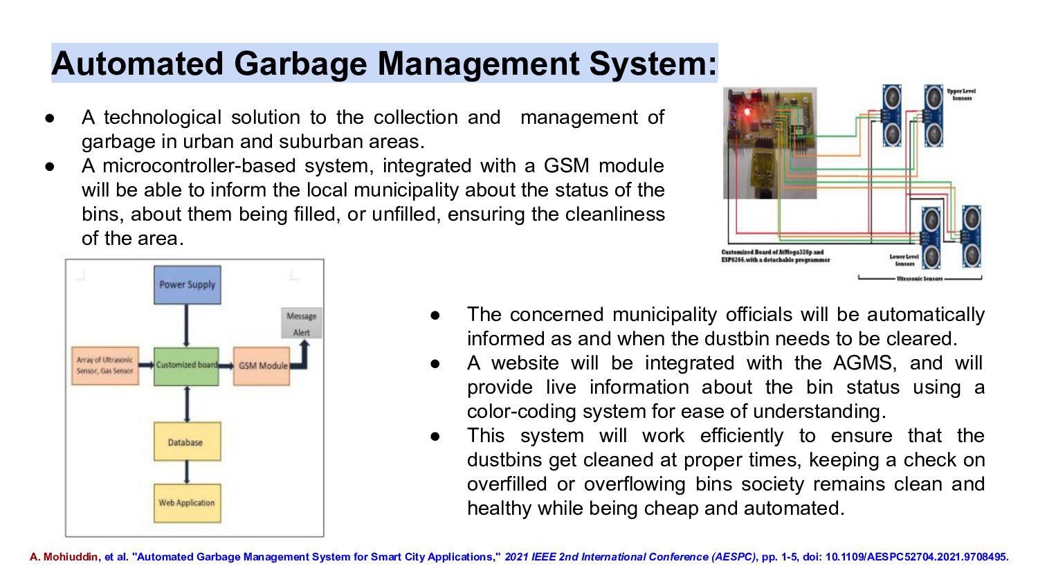 collection and management of garbage in urban and suburban areas. • A microcontroller-based system, integrated with a GSM module will be able to inform the local municipality about the status of the bins, about them being filled, or unfilled, ensuring the cleanliness of the area. • The concerned municipality officials will be automatically informed as and when the dustbin needs to be cleared. • A website will be integrated with the AGMS, and will provide live information about the bin status using a color-coding system for ease of understanding. • This system will work efficiently to ensure that the dustbins get cleaned at proper times, keeping a check on overfilled or overflowing bins society remains clean and healthy while being cheap and automated. A. Mohiuddin, et al. "Automated Garbage Management System for Smart City Applications," 2021 IEEE 2nd International Conference (AESPC), pp. 1-5, doi: 10.1109/AESPC52704.2021.9708495.