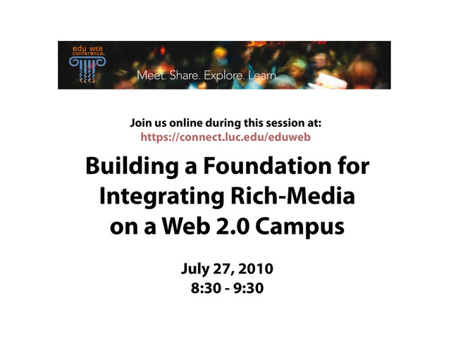 The presentation focused on how Loyola developed and implemented the “Ignation” system whereby students, faculty, and staff could create, upload, and manage rich-media. Media such as Blogs, Wikis, Podcasts, and Videos can be sent to a central repository where users can self-manage their content and get the Loyola brand around their content to help tell an authentic “Loyola Story.”