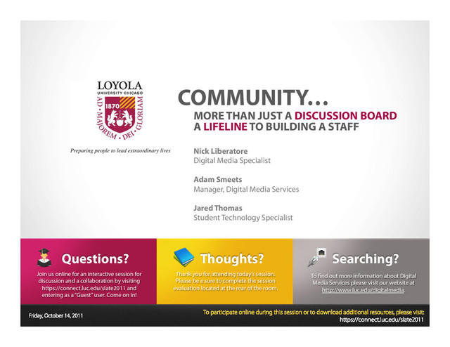 Blackboard and other learning management systems provide an amazing opportunity for faculty to deliver and transform curriculum, as well as for students to learn in exciting new ways. In Digital Media Services at Loyola University Chicago, we’re transforming our use of a Blackboard community to provide new hire training and assessment, as well as ongoing professional development to over 65 student workers. Through the use of Adobe Connect Pro, Blackboard and other open-source systems we will identify the tools and utilities, as well as best practices for developing an in-house training plan for new incoming staff. Participants will leave the session with a toolkit of materials for implementing a training program and ask questions for “next steps.”
