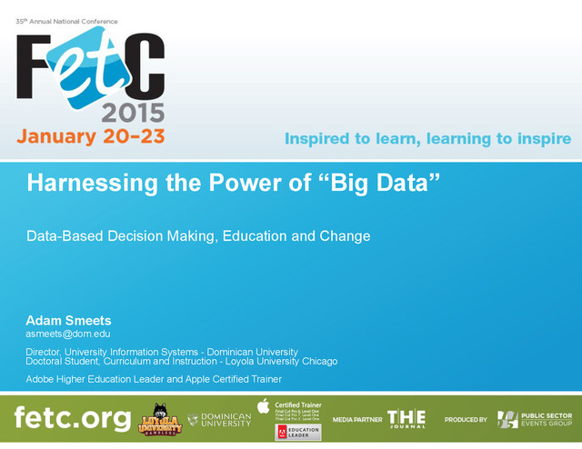 Teachers and school administrators at all levels are inundated with data, at times so large and complex that it becomes difficult to process. Explore opportunities and approaches with Tableau, a data visualization application, that information technology services has utilized at Loyola University Chicago for data-based decision making. This includes connecting to multiple databases, Excel spreadsheets and commingling other data types to visualize and inform decision making. Participants will experience hands-on application of using “big data” sets with Tableau Public, as well as best practices for handling large data sets and how to construct reports/dashboards with the tool.