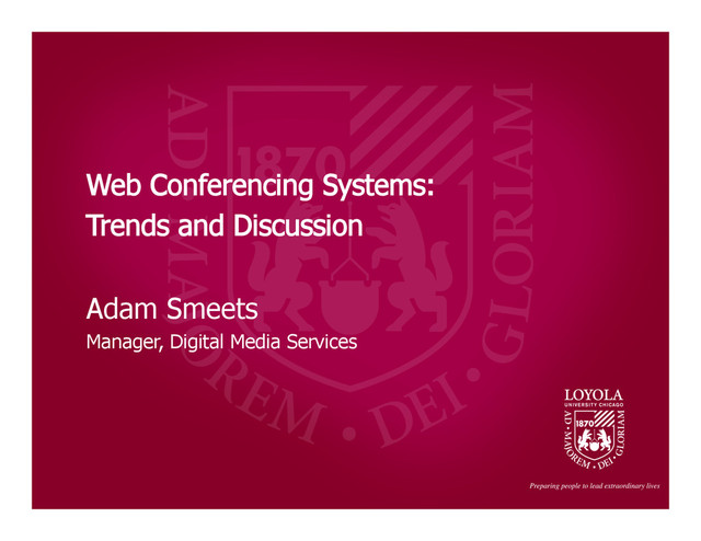 220 host licenses are currently issued to students, faculty and staff at the University. • Currently in a named organizer licensing model, facilitated by two categories of host license holders: 30,000 Foot View of Licensing Webinars & Online Meetings Academic Instruction • Available for Loyola University Chicago Students or Staff; - Faculty may request a webinar license, only if not used for online course instruction • Limited to 30 days of use, but renewable; • No training required, but online training recommended • Available for Loyola University Chicago Faculty (For Online Course Instruction); • Formal training, both synchronous and asynchronous, required to obtain license; • Limited to one year of use, but renewable