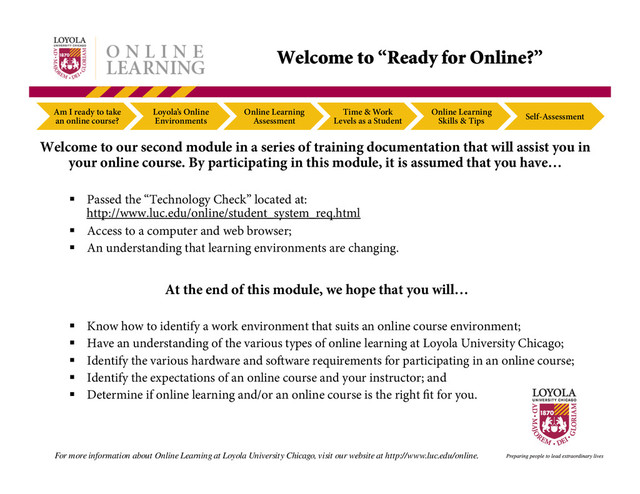 Environments Online Learning Assessment Time & Work Levels as a Student Online Learning Skills & Tips Self-Assessment For more information about Online Learning at Loyola University Chicago, visit our website at http://www.luc.edu/online. Before continuing to the next module, have you: Identi ed a work environment that best suits you in an online course environment; Identi ed and are able to differentiate the various types of online learning at Loyola University Chicago; Determined if your technology meets the hardware and soware requirements for participating in an online course; Identi ed and evaluated the expectations of an online course; and Determined if online learning and/or an online course is the right t for you. If you have answered yes to all of these statements, then please continue on to the next module. If you answered no to any of these statements, please review the relevant content in this module before proceeding to the next training module. Self-Assessment: Am I ready for online learning?