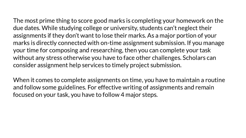 The most prime thing to score good marks is completing your homework on the due dates. While studying college or university, students can’t neglect their assignments if they don’t want to lose their marks. As a major portion of your marks is directly connected with on-time assignment submission. If you manage your time for composing and researching, then you can complete your task without any stress otherwise you have to face other challenges. Scholars can consider assignment help services to timely project submission.