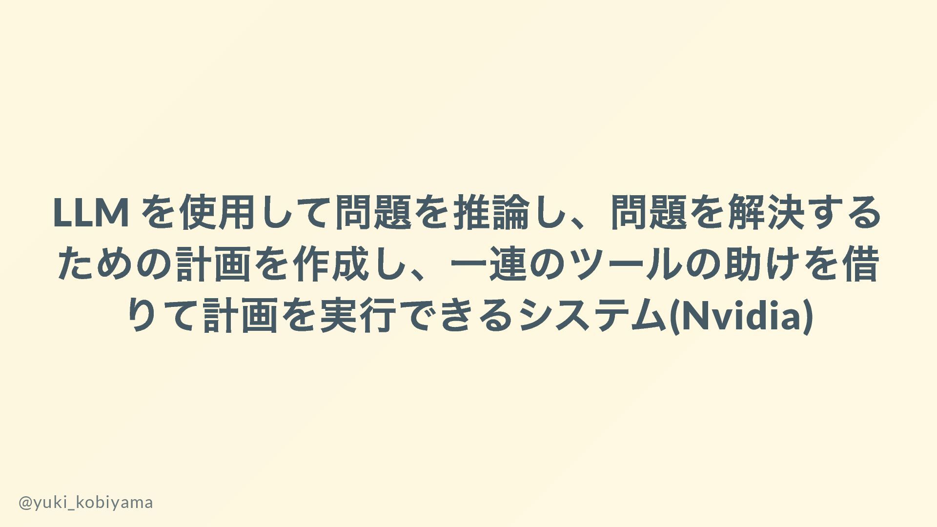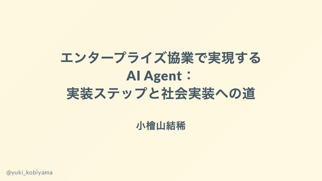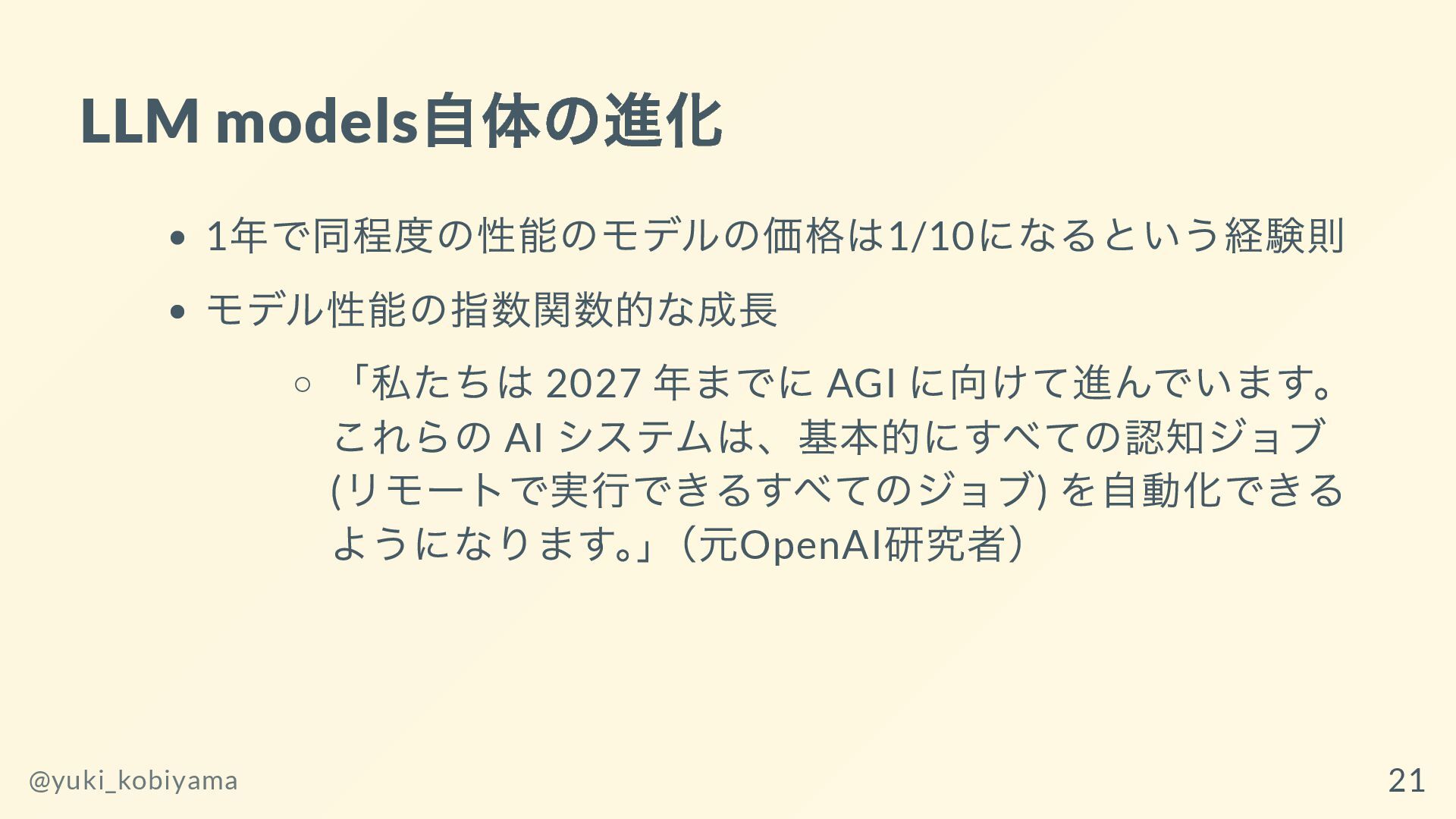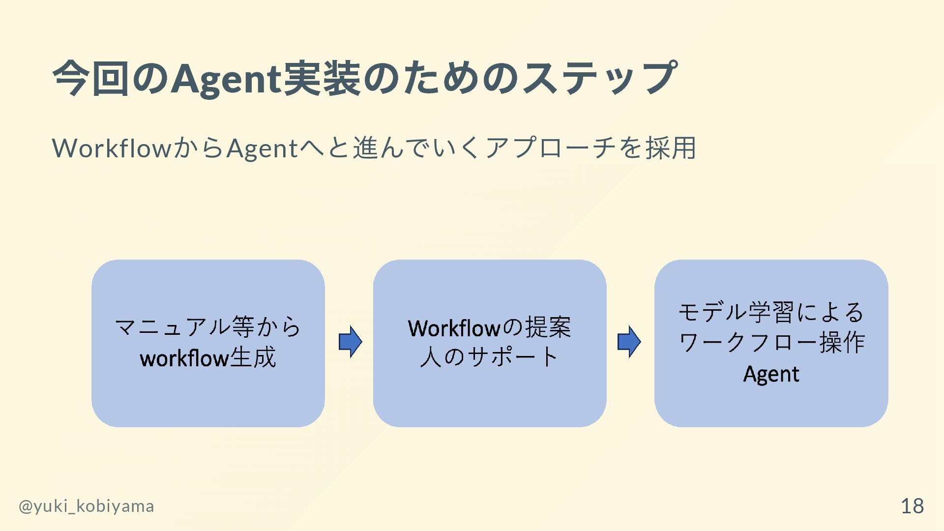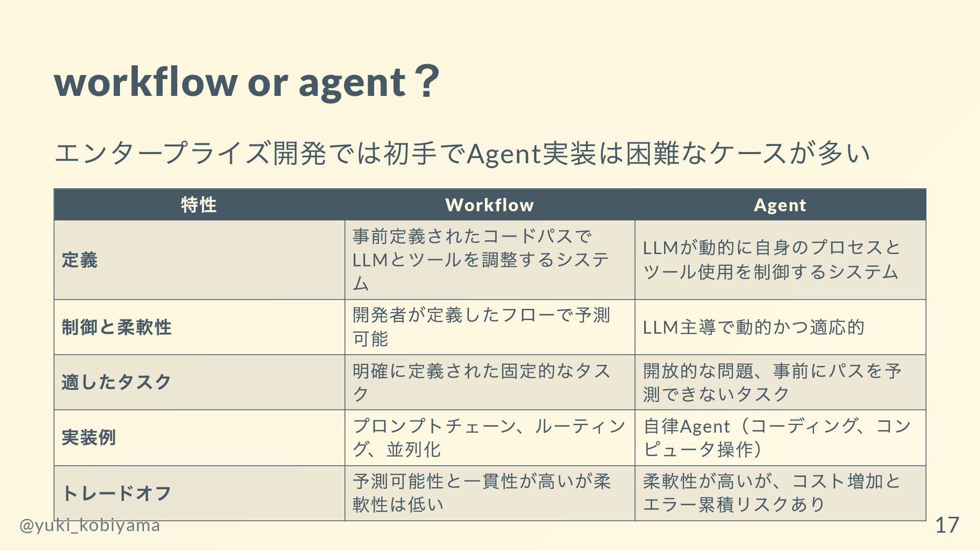 事前定義されたコードパスで LLM とツールを調整するシステ ム LLM が動的に自身のプロセスと ツール使用を制御するシステム 制御と柔軟性 開発者が定義したフローで予測 可能 LLM 主導で動的かつ適応的 適したタスク 明確に定義された固定的なタス ク 開放的な問題、事前にパスを予 測できないタスク 実装例 プロンプトチェーン、ルーティン グ、並列化 自律Agent (コーディング、コン ピュータ操作) トレードオフ 予測可能性と一貫性が高いが柔 軟性は低い 柔軟性が高いが、コスト増加と エラー累積リスクあり @yuki_kobiyama 17