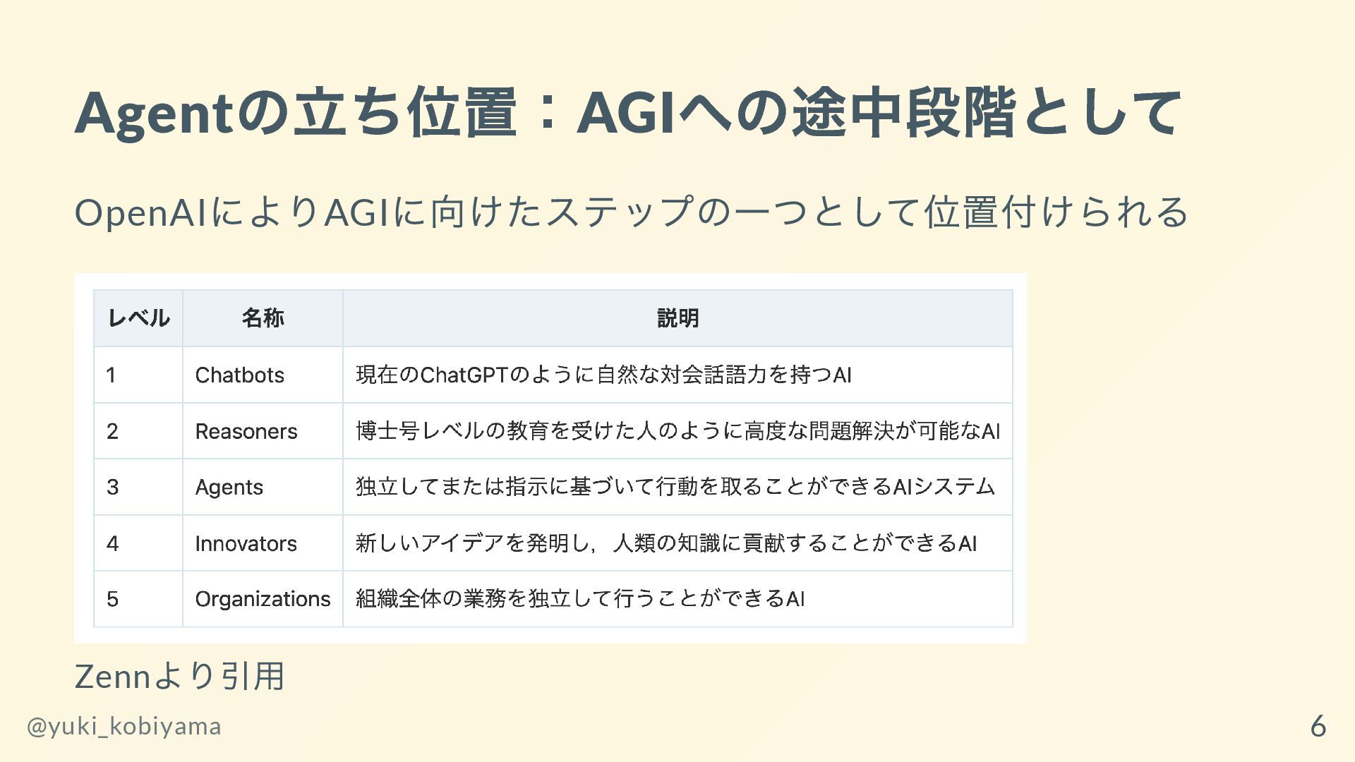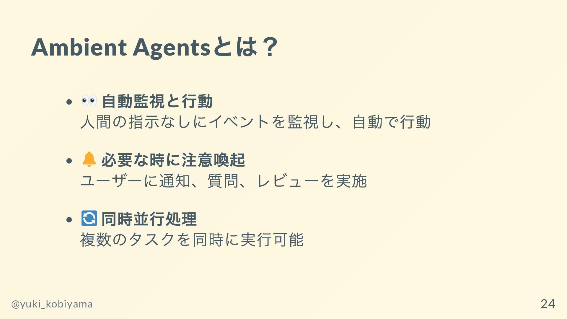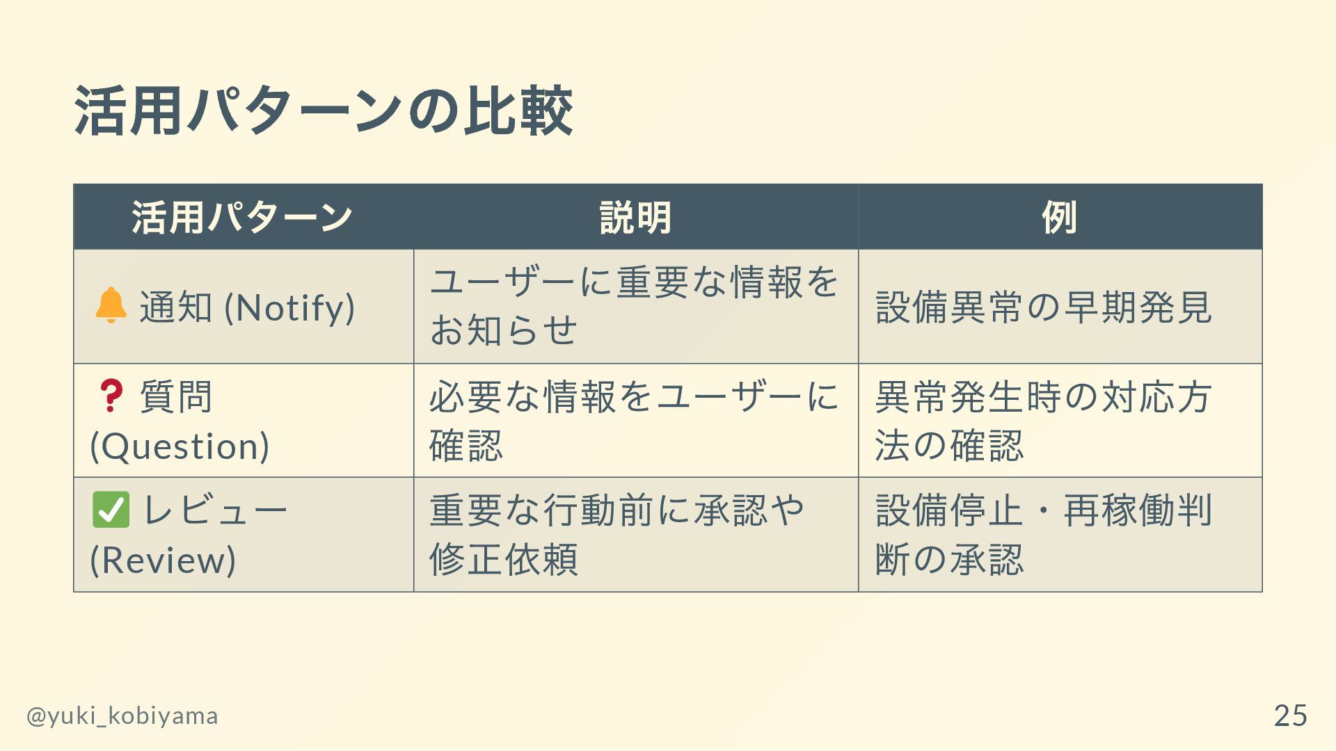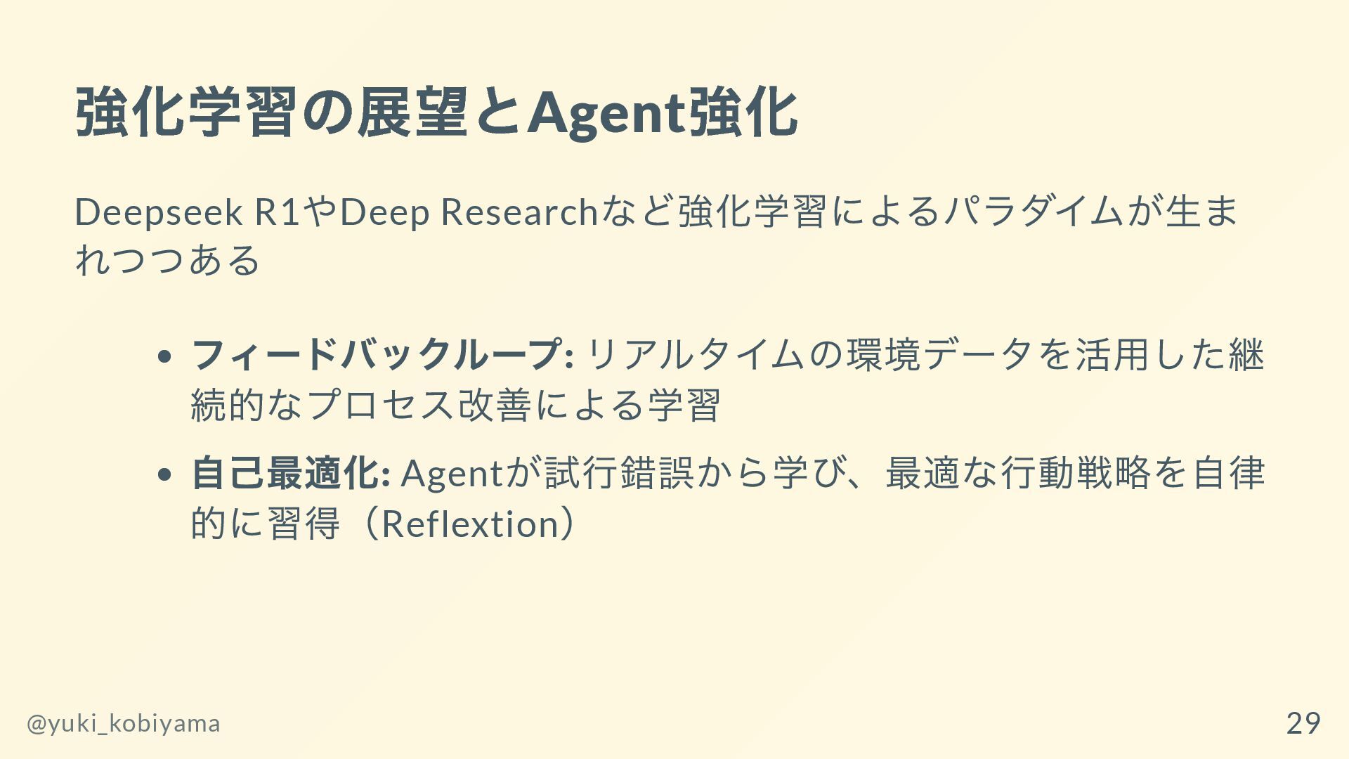 事前定義されたコードパスで LLM とツールを調整するシステ ム LLM が動的に自身のプロセスと ツール使用を制御するシステム 制御と柔軟性 開発者が定義したフローで予測 可能 LLM 主導で動的かつ適応的 適したタスク 明確に定義された固定的なタス ク 開放的な問題、事前にパスを予 測できないタスク 実装例 プロンプトチェーン、ルーティン グ、並列化 自律Agent (コーディング、コン ピュータ操作) トレードオフ 予測可能性と一貫性が高いが柔 軟性は低い 柔軟性が高いが、コスト増加と エラー累積リスクあり @yuki_kobiyama 17