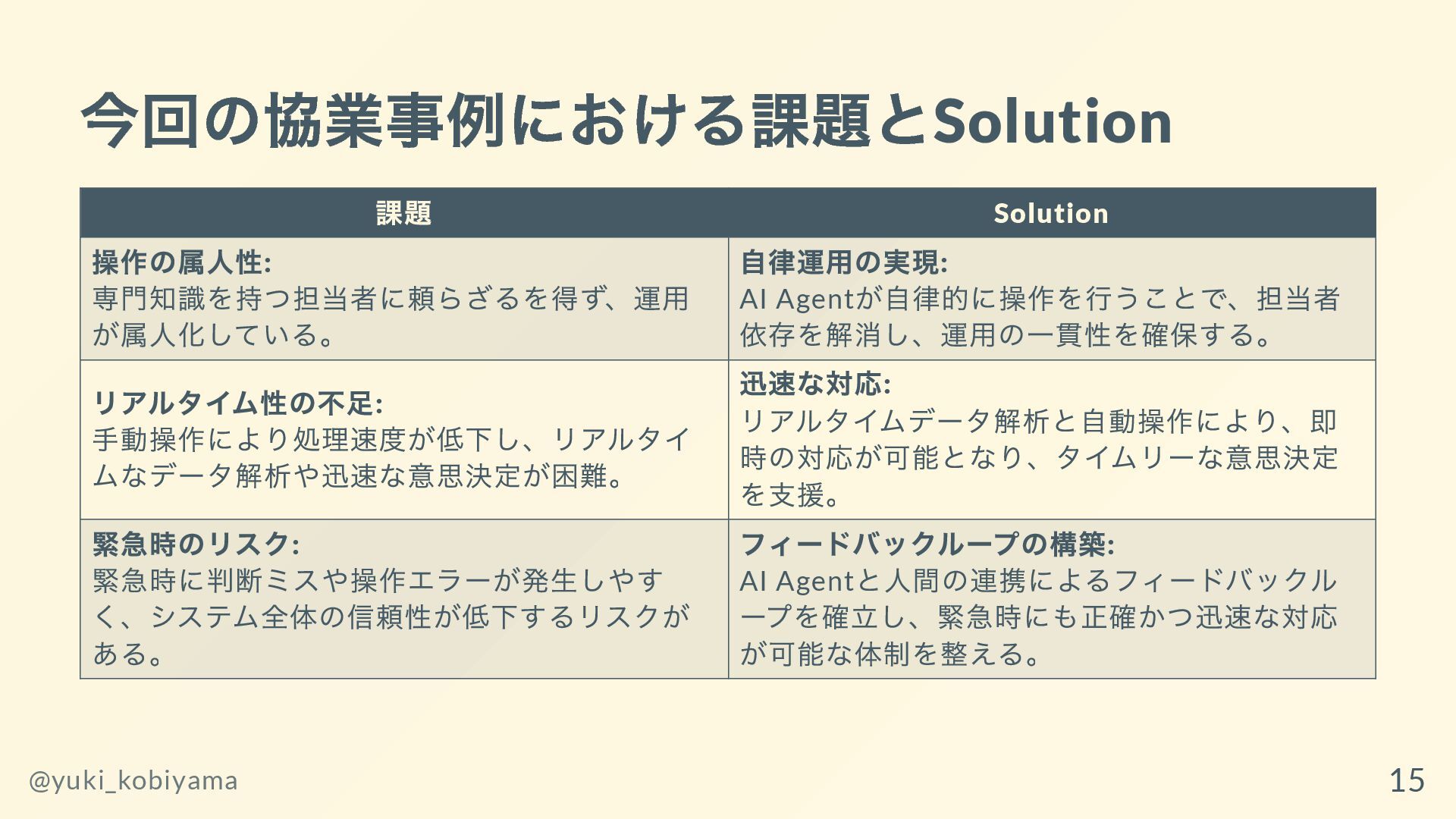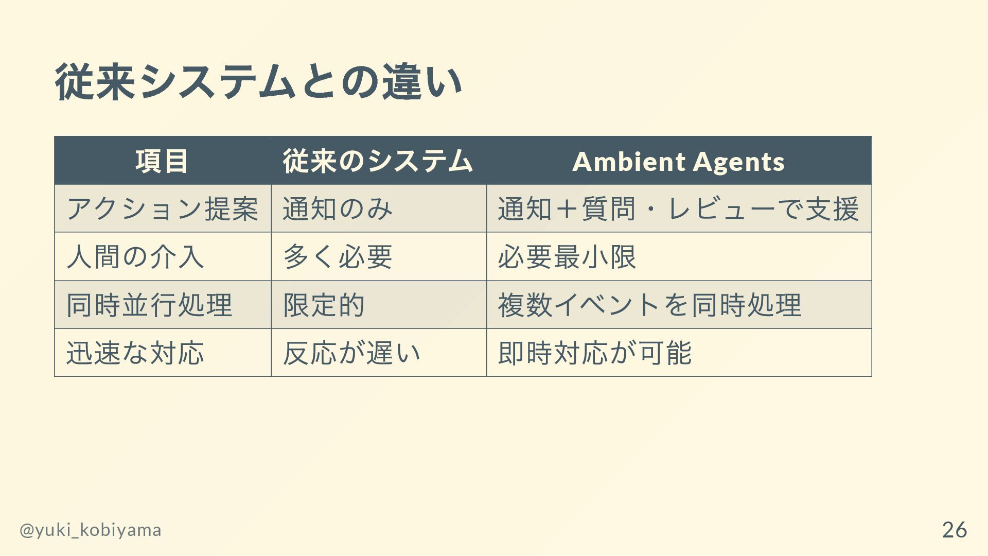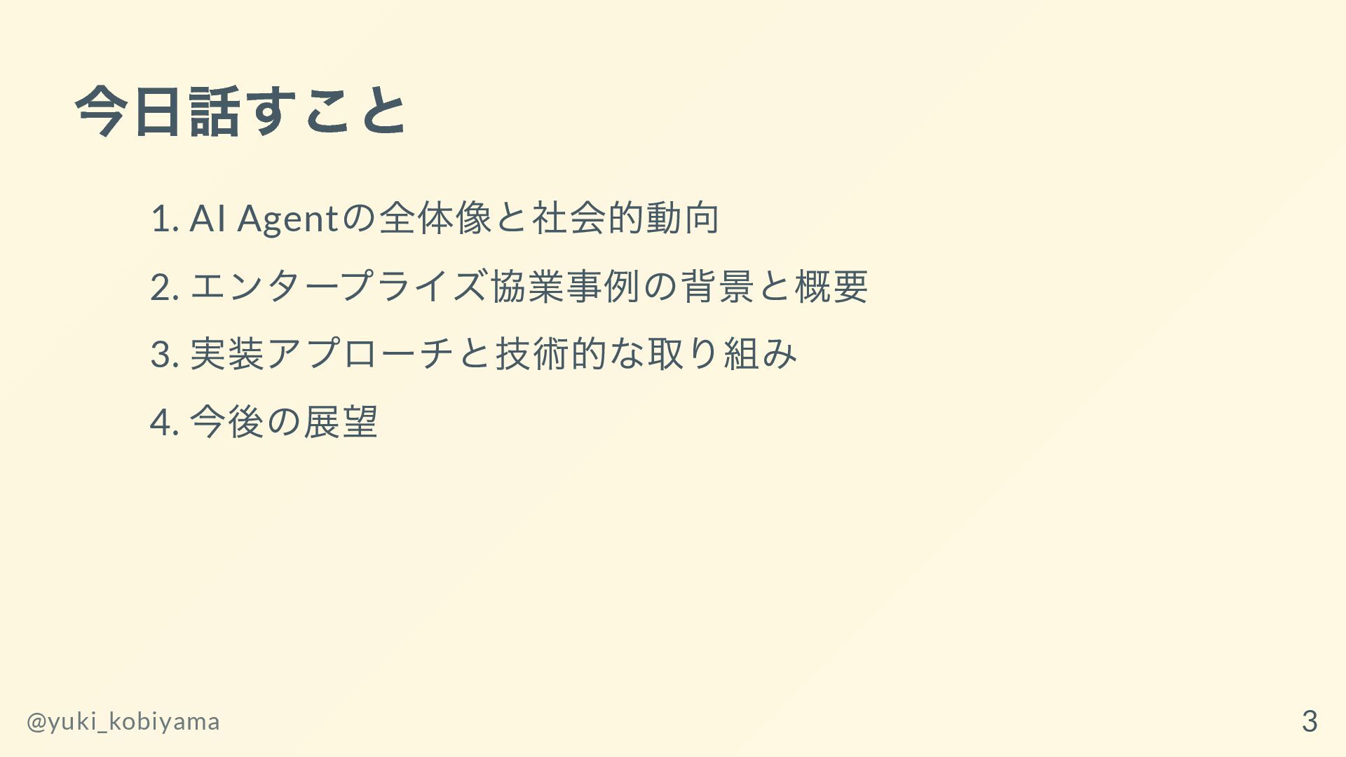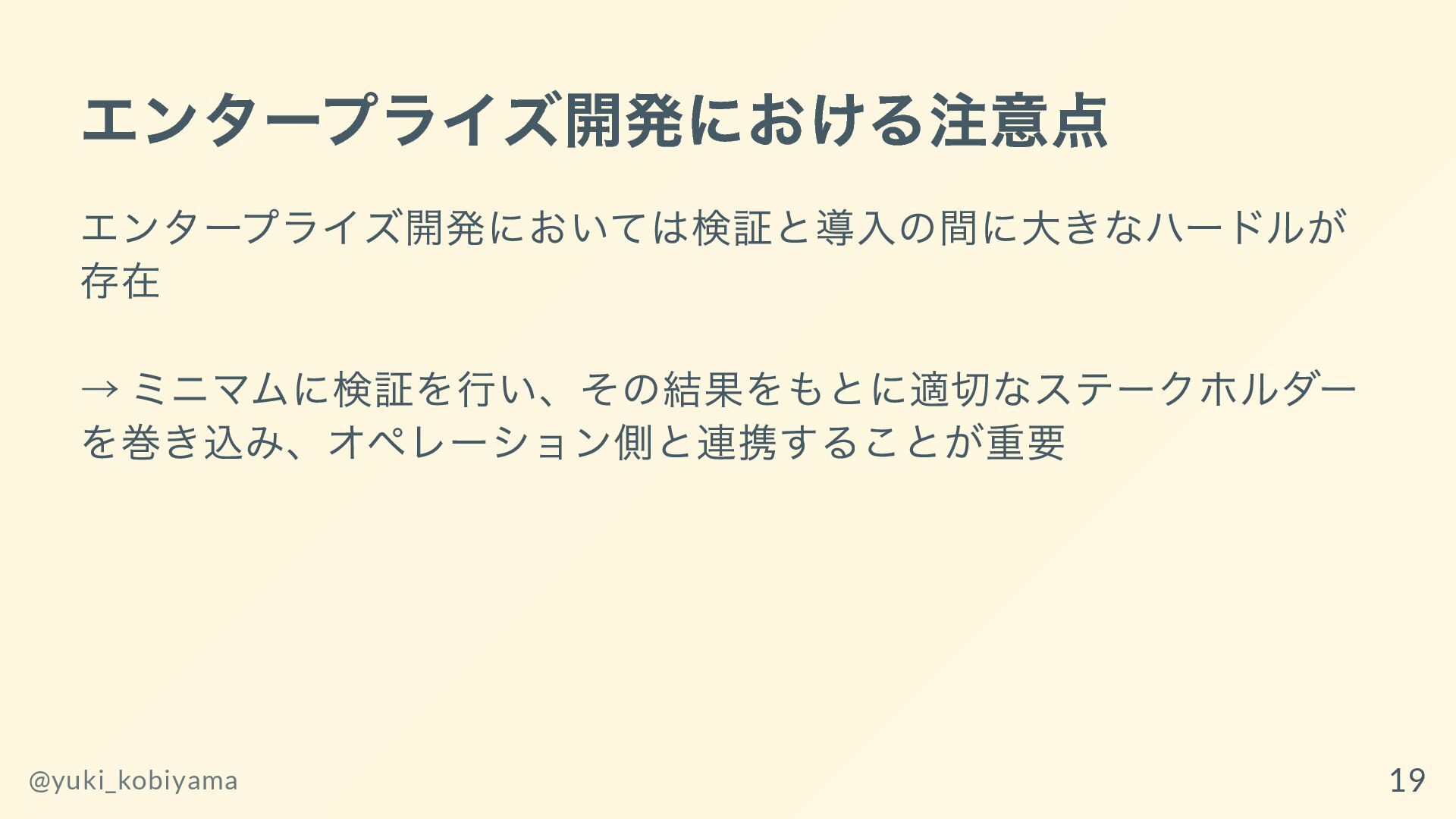 事前定義されたコードパスで LLM とツールを調整するシステ ム LLM が動的に自身のプロセスと ツール使用を制御するシステム 制御と柔軟性 開発者が定義したフローで予測 可能 LLM 主導で動的かつ適応的 適したタスク 明確に定義された固定的なタス ク 開放的な問題、事前にパスを予 測できないタスク 実装例 プロンプトチェーン、ルーティン グ、並列化 自律Agent (コーディング、コン ピュータ操作) トレードオフ 予測可能性と一貫性が高いが柔 軟性は低い 柔軟性が高いが、コスト増加と エラー累積リスクあり @yuki_kobiyama 17