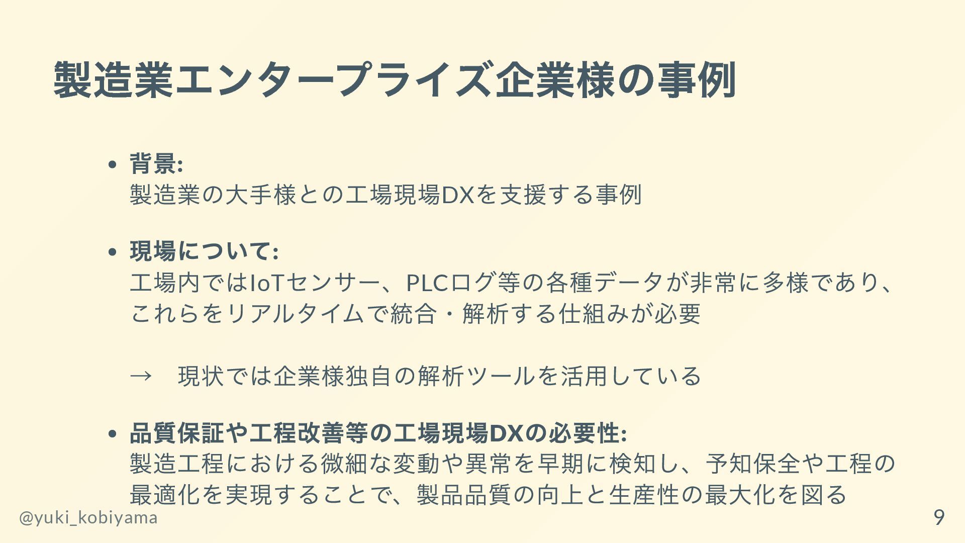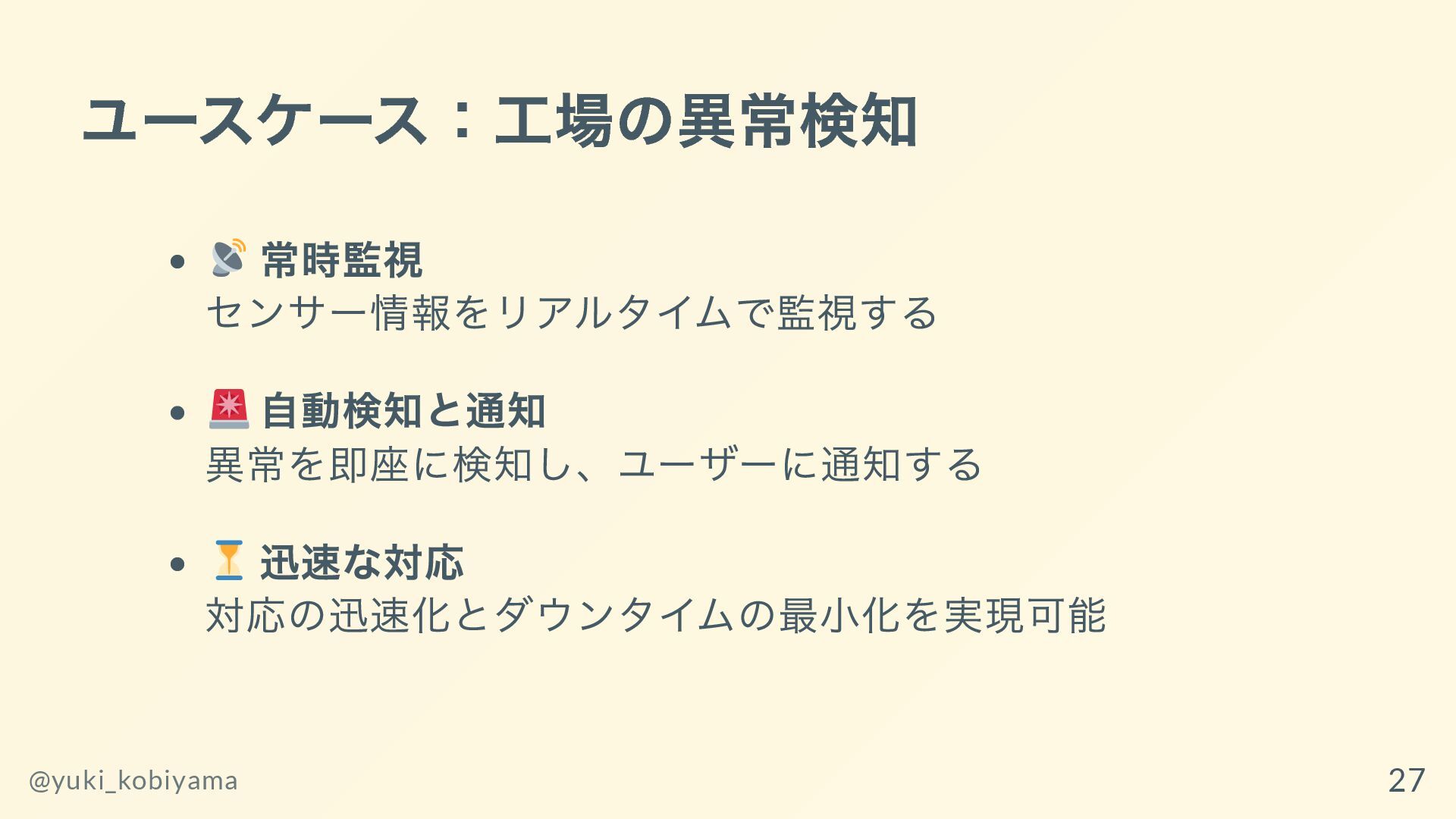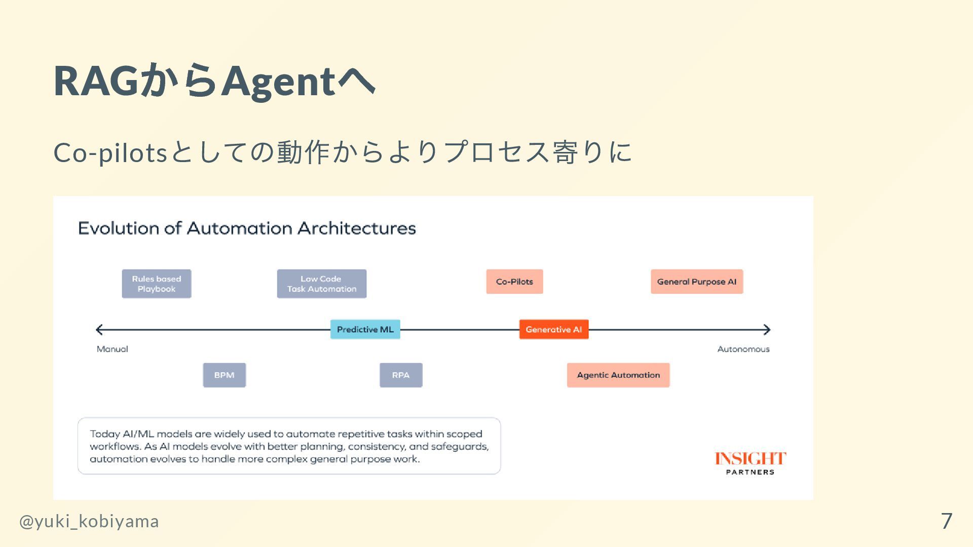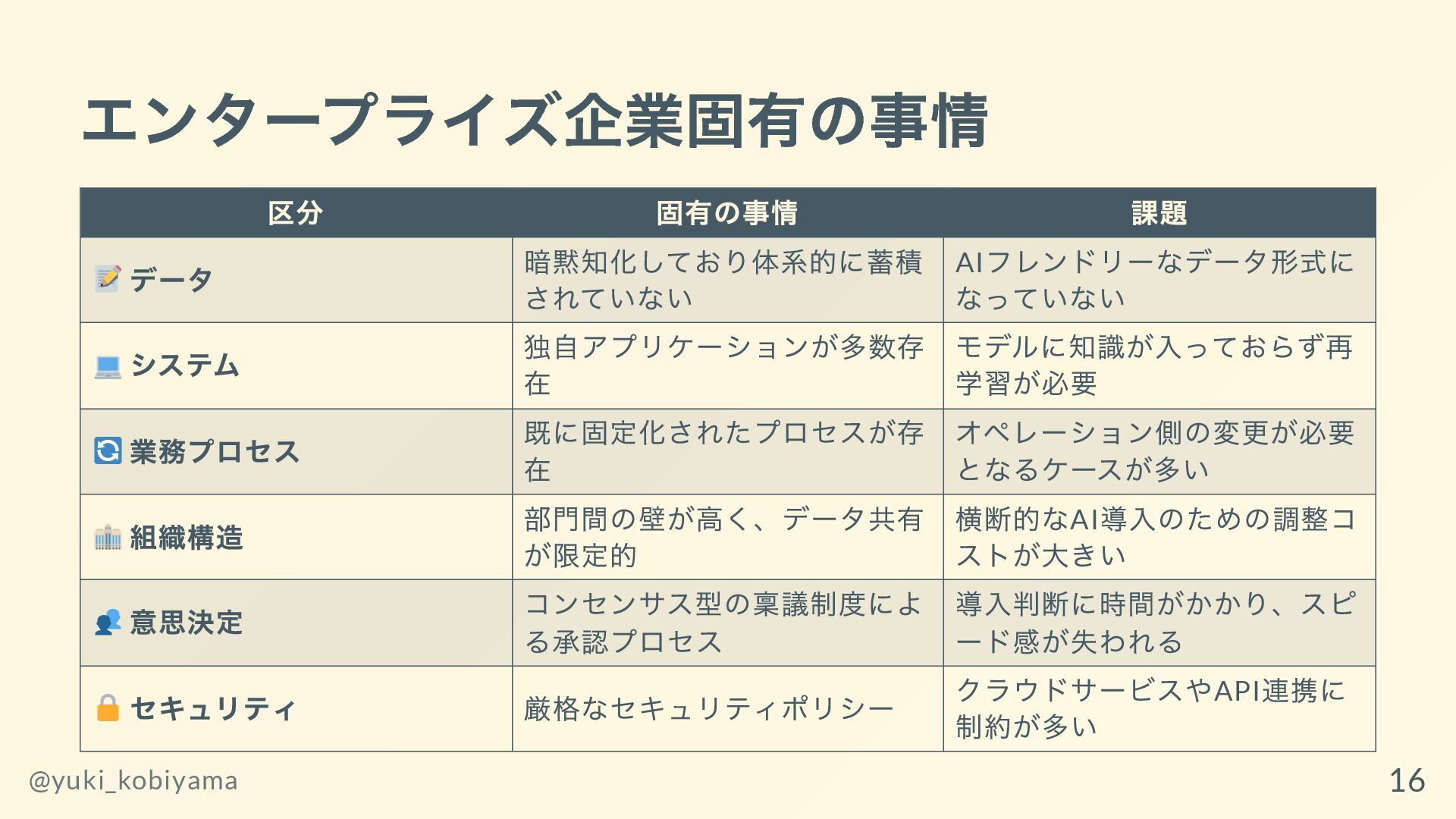 事前定義されたコードパスで LLM とツールを調整するシステ ム LLM が動的に自身のプロセスと ツール使用を制御するシステム 制御と柔軟性 開発者が定義したフローで予測 可能 LLM 主導で動的かつ適応的 適したタスク 明確に定義された固定的なタス ク 開放的な問題、事前にパスを予 測できないタスク 実装例 プロンプトチェーン、ルーティン グ、並列化 自律Agent (コーディング、コン ピュータ操作) トレードオフ 予測可能性と一貫性が高いが柔 軟性は低い 柔軟性が高いが、コスト増加と エラー累積リスクあり @yuki_kobiyama 17