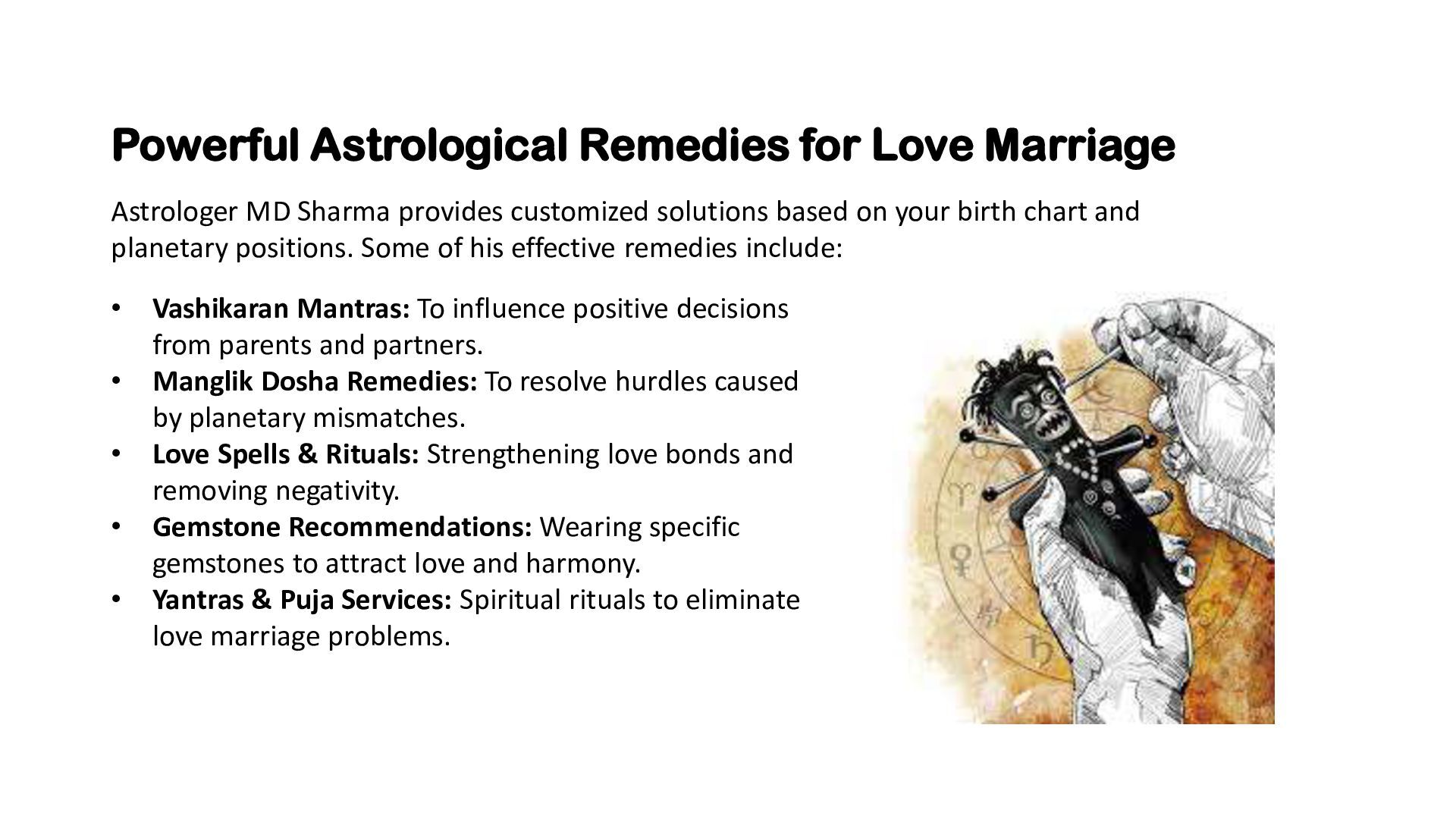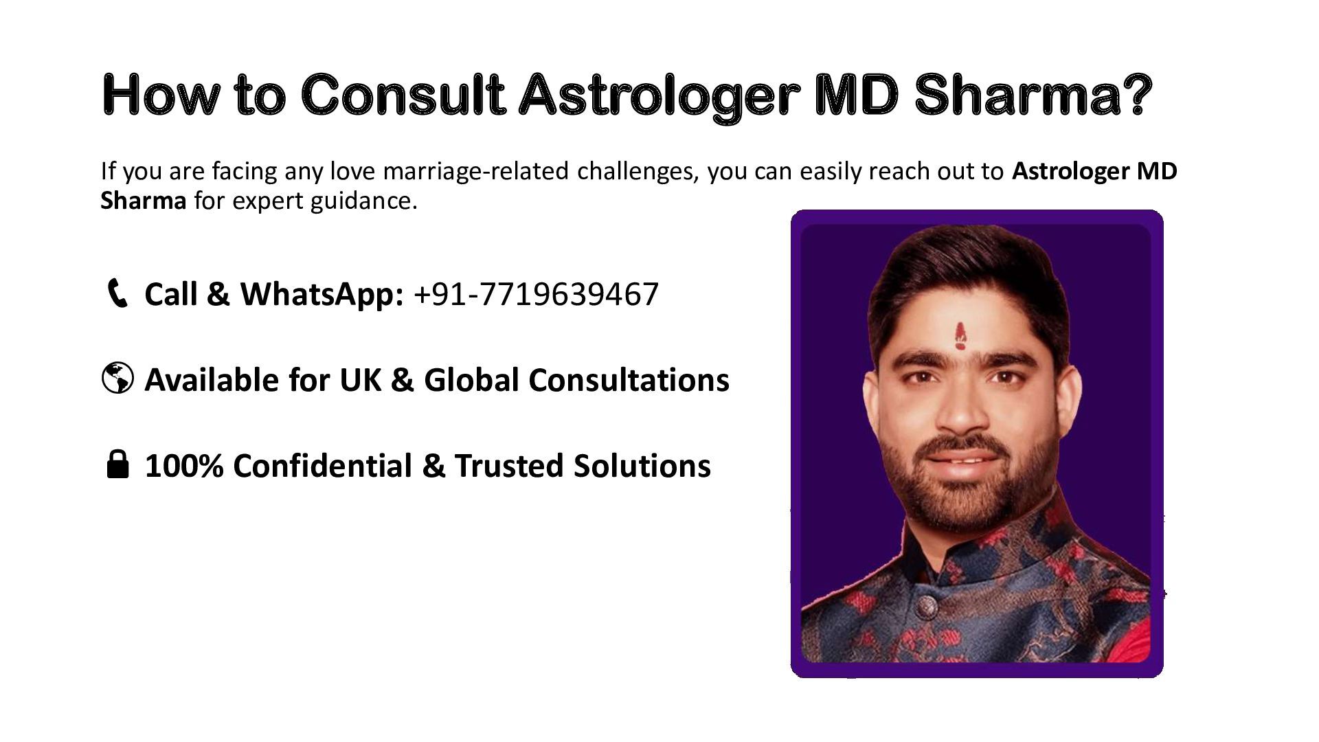 Facing obstacles in love marriage? Get expert guidance from Astrologer MD Sharma, a Love Marriage Specialist in the UK with 46+ years of experience. Resolve family disputes, inter-caste issues, and partner misunderstandings with proven astrological solutions. Call or WhatsApp at +91-7719639467 for quick and effective remedies to secure a happy and successful marriage.