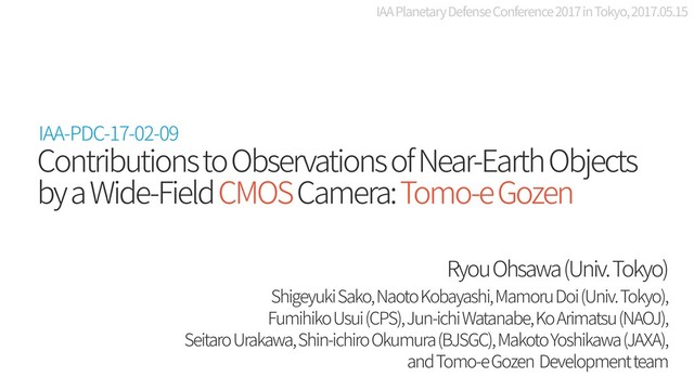 Gozen: a wide-field CMOS mosaic camera The next flagship instrument at Kiso Observatory, the University of Tokyo. Equipped with 84 CMOS sensors, covering about 20deg2. The Tomo-e Gozen is able to take images continuously at 2Hz. Optimized for a shallow, high-cadance, and wide-area (~10,000deg2) survey. The Tomo-e Gozen can detect 20m-class asteroids at a distance of ~0.01au. 2013 2014 2015 2016 2017 2018 Sensor Development Sensor Evaluation Camera Design Assembly Observation 8-chip first light 21-chip first light 84-chip first light