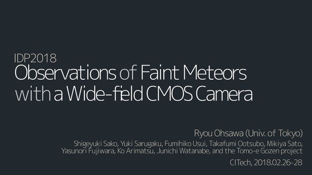 PM/Kiso Schmidt the size distribution of interplanetary dust particles optical observations of faint meteors introduction of Kiso Observatory and Tomo-e PM detections of faint meteors down to ~10 mag. luminosity function of faint meteors