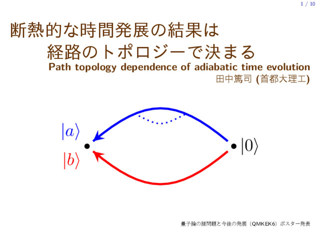 (Bi, Bf) ͕ಉ͡Ͱɺஅతͳ࣌ؒൃలͷ݁Ռ͕ҟͳΔ O Bi Bf Bx By ܦ࿏্Ͱͷஅঢ়ଶͷεϐϯظ (Bloch vector)ɻݪʹ disclination (Ґ૬ܽؕͷҰछ) ͕͋Δɻ ੩࣓ B ԼͷεϐϯʹपظܸྗΛҹՃ: H(t) ≡ B·σ 2 +λ | ↓ ⟩⟨ ↓ | ∑ ∞ m=−∞ δ(t−m). ରԠ͢Δϑϩέԋࢉࢠ U = e−iλ |↓⟩⟨↓|e−iB·σ/2. ͜͜Ͱ λ = tan−1(By/Bx) ͱ͢Δͱɺ U (Bx,By)-໘ͰҰՁɻ Ref. Combescure, JSP (1990); Milek and Seba, PRA (1990); AT and Miyamoto, PRL (2007); AT and Cheon, PLA (2015).