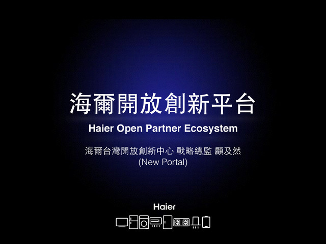 / sensor / touch panel / communications / medical / bio-tech / hand- held device / IPC…) 開放 平台 ⾵風險 效益 Working Prototype Partnership, Funding Go2China Better than Well Idea Expanding Idea Identity Open-Source technology Global tech Focus Innovation Ecosystem New tech go Market Cooperation Platform - Anti-cycle - beyond risk Idea security strategic alliance consist of rules, standards Risk precision Paradox of choice precise risk identification Idea demarcating prototype identity Advanced technology rules, standards management Innovation focus devices support of DIY customer- based solutions Idea on the go finance transparency unbundling resources localized services new model of tech delivery personal tech simulation tech filter of detecting self-adjusting support finance capes info on mobile level cartography of tech enabling technology new tech hacking trends, market, products - differentiation - modification advance with a purpose regenerative technology life-cycle extension extreme engagement technology extreme users as pioneers developing with info User-led innovation Cooperations Funding Tech spreading Eco-tech literacy Mobile tech Business Model IP protecting 針對個別技術、團隊,提供 商機媒合、參股、孵化等資源, 並獲取合理的報酬。 挖掘各類創意、技術、產品, 提供Haier事業單位、超前研 發部、U-Home運⽤用。 積極參與各類型孵化器、產 業組織、研發機構等活動,推 廣HOPE平台