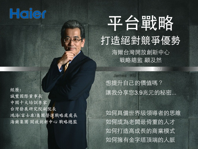平台戰略 打造絕對競爭優勢 想提升⾃自⼰己的價值嗎?! 讓我分享您3.9兆元的秘密...! ! 如何具備世界級領導者的思維! 如何成為⽼老闆最倚重的⼈人才! 如何打造⾼高成⻑⾧長的商業模式! 如何擁有⾦金字塔頂端的⼈人脈 海爾台灣開放創新中⼼心!