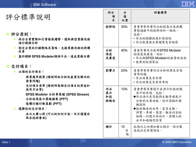 評分原則: l 結合企業實際和行業發展趨勢,選取典型業務流程 進行建模分析 l 制定企業的行銷戰略及策略,支援業務流程的持續 改善 l 基於IBM SPSS Modeler預測手法,達成業務目標 n 交付項目: l 必須的交付項目: – 商業應用提案 (請說明欲分析的產業及解決的 商業問題) – 交付項目清單 (請說明每個交付項目的用途和 使用方法等) – SPSS Modeler 分析專案檔 (SPSS Stream) – 分析結果展示簡報檔案 (PPT) – 後續行銷行動策劃 (PPT) l 選擇性的交付項目: – 本次大賽心得 (可以從任何方面,而不僅僅局 限在技術層面) 評分 項 目 分 值 比重 評審標準 創新性 30% 著重考察參賽作品的創意以及具體 實現過程中的創新性和一致性, 包括: • 作品的總體創意和原創性 • 作品創意與企業趨勢是否相符 分析 深度 及廣度 40% 著重參賽作品使用SPSS Modeler 的深度及廣度,例如: • 作品與SPSS Modeler的黏著性高低 • 使用到的演算法 影響力 20% 著重考察參賽作品分析結果是否為 業界所趨 • 作品結果是否合理 • 作品結果是否具參考性 作品 展示 和技 術報告 10% 著重考察參賽選手在演示和技術報 告中的表現,包括: l 作品演示是否能夠生動準確展示 分析的主要功能,設計思路和關 鍵技術 l 技術報告的水準:是否生動、 詳實、準確、簡潔,報告內容的 組織、幻燈片的設計、演講人的 水平和現場問答等 總計 10 0 % 此為以上四項加權之總分,依分數 高低決定得獎隊伍。