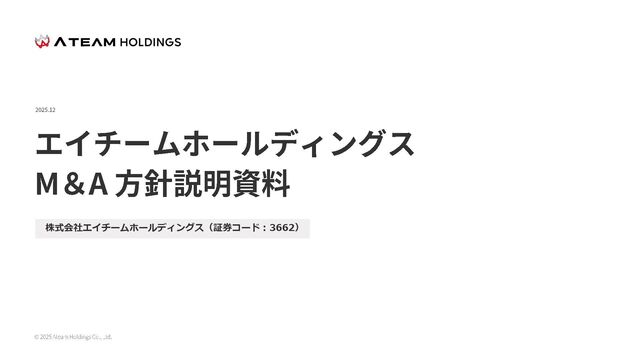 エイチームホールディングス(3662)は、売上向上支援カンパニーへの変革を図るべく、M&Aを核とした成長戦略を推進しております。本資料は、当社のM&A方針に関する資料です。 なお、動画については2024年8月7日に開催した当社のM&A方針の説明会の動画です。 ※現在のスライドは、2025年12月に改定したものを掲載しております。
