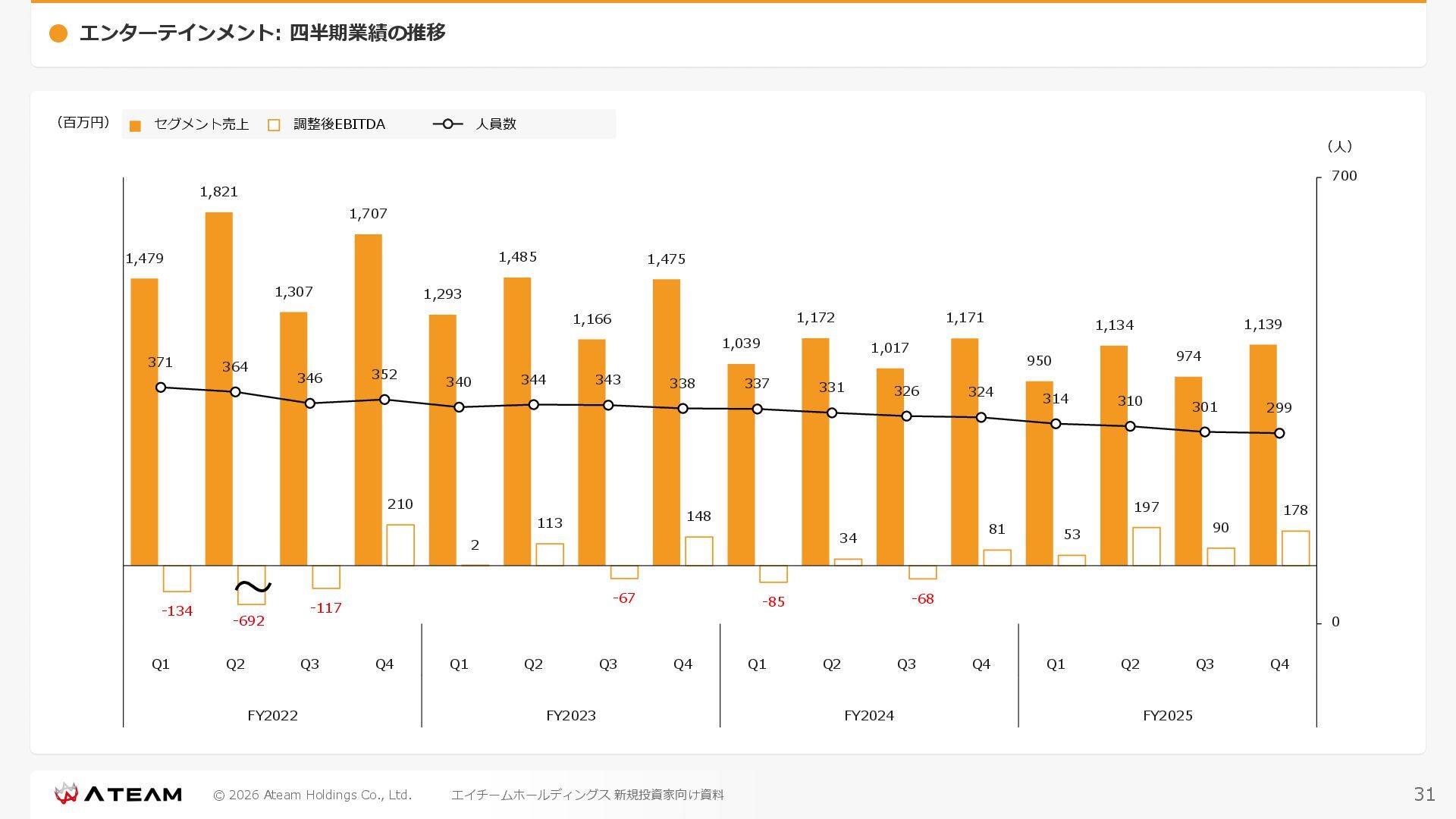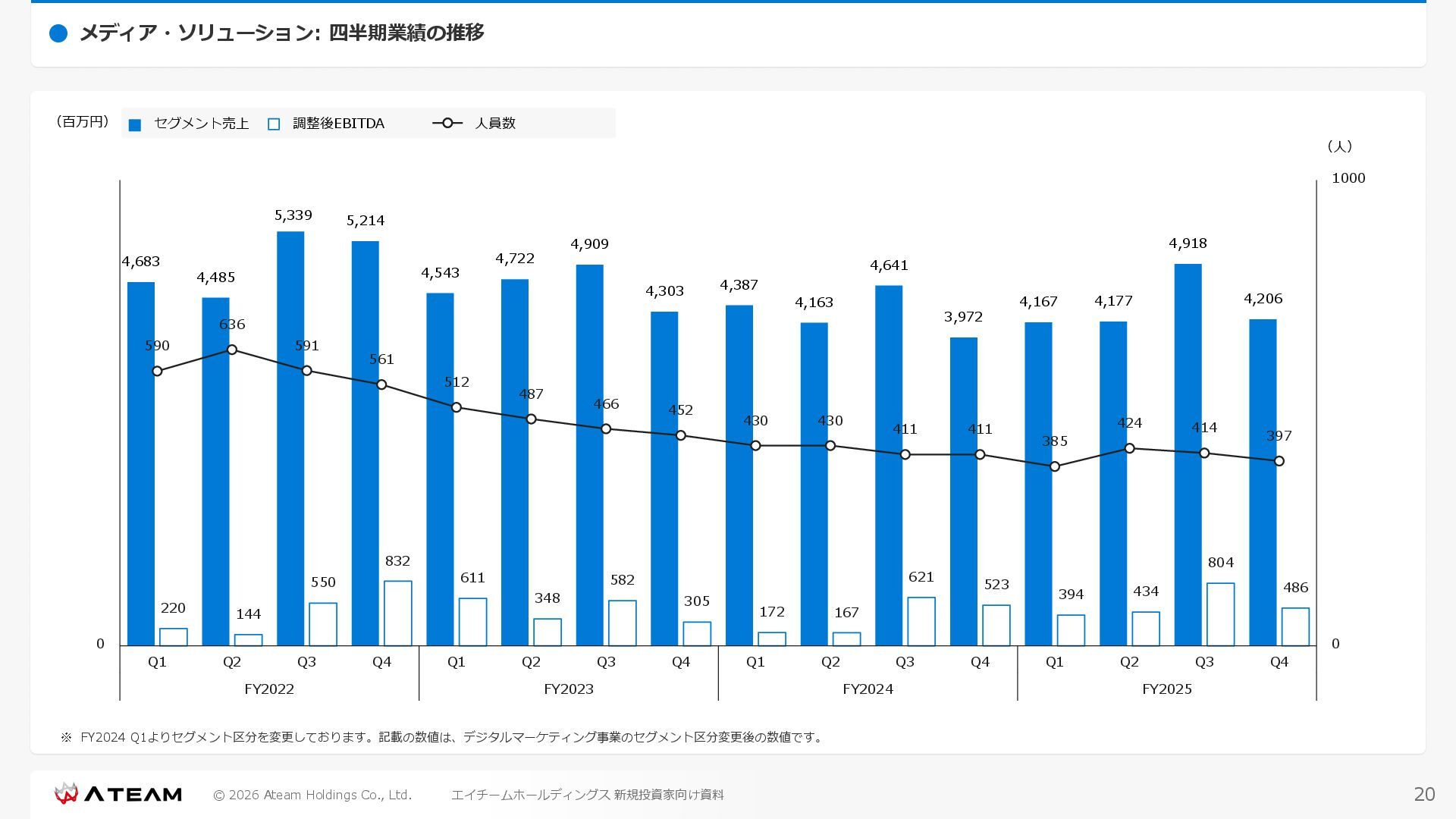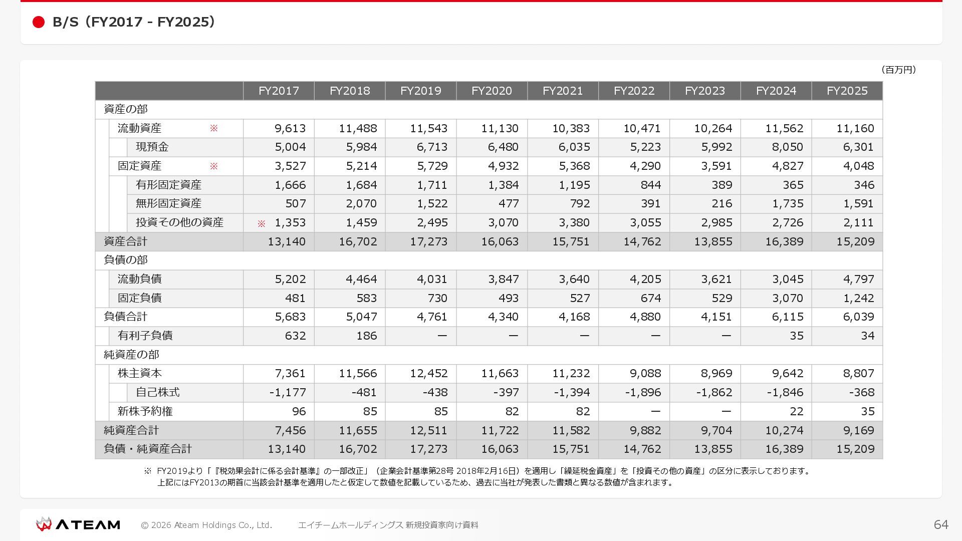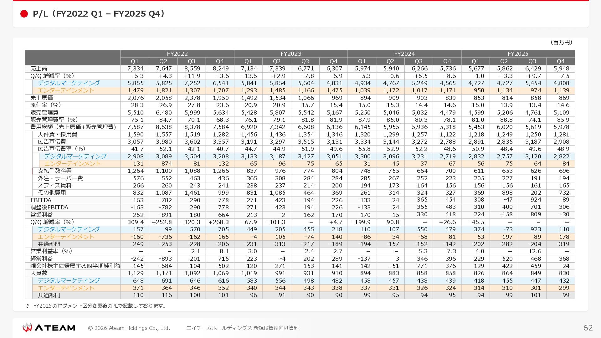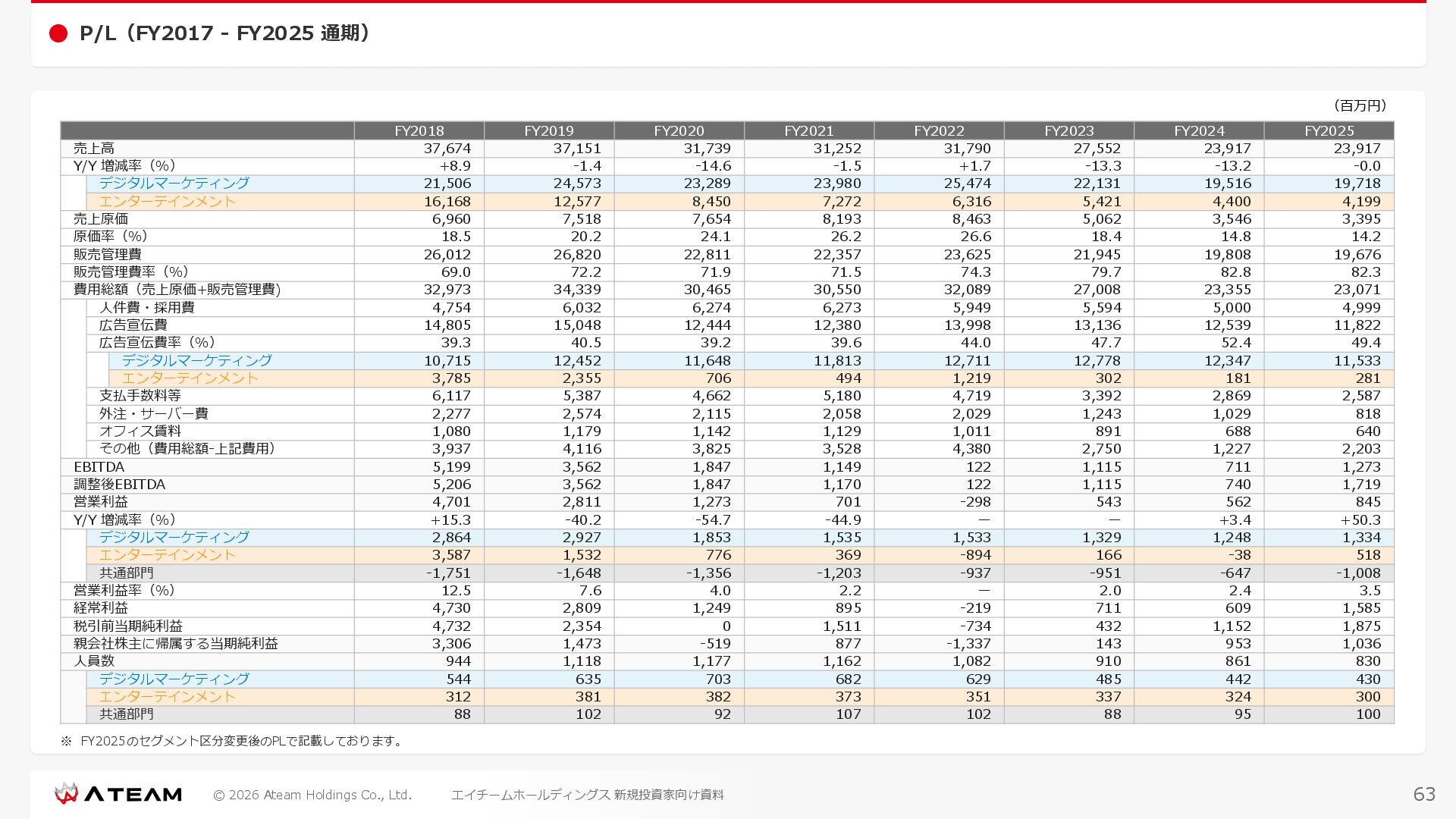FY2022 FY2023 FY2024 FY2025 売上高 37,674 37,151 31,739 31,252 31,790 27,552 23,917 23,917 Y/Y 増減率(%) +8.9 -1.4 -14.6 -1.5 +1.7 -13.3 -13.2 -0.0 デジタルマーケティング 21,506 24,573 23,289 23,980 25,474 22,131 19,516 19,718 エンターテインメント 16,168 12,577 8,450 7,272 6,316 5,421 4,400 4,199 売上原価 6,960 7,518 7,654 8,193 8,463 5,062 3,546 3,395 原価率(%) 18.5 20.2 24.1 26.2 26.6 18.4 14.8 14.2 販売管理費 26,012 26,820 22,811 22,357 23,625 21,945 19,808 19,676 販売管理費率(%) 69.0 72.2 71.9 71.5 74.3 79.7 82.8 82.3 費用総額(売上原価+販売管理費) 32,973 34,339 30,465 30,550 32,089 27,008 23,355 23,071 人件費・採用費 4,754 6,032 6,274 6,273 5,949 5,594 5,000 4,999 広告宣伝費 14,805 15,048 12,444 12,380 13,998 13,136 12,539 11,822 広告宣伝費率(%) 39.3 40.5 39.2 39.6 44.0 47.7 52.4 49.4 デジタルマーケティング 10,715 12,452 11,648 11,813 12,711 12,778 12,347 11,533 エンターテインメント 3,785 2,355 706 494 1,219 302 181 281 支払手数料等 6,117 5,387 4,662 5,180 4,719 3,392 2,869 2,587 外注・サーバー費 2,277 2,574 2,115 2,058 2,029 1,243 1,029 818 オフィス賃料 1,080 1,179 1,142 1,129 1,011 891 688 640 その他(費用総額-上記費用) 3,937 4,116 3,825 3,528 4,380 2,750 1,227 2,203 EBITDA 5,199 3,562 1,847 1,149 122 1,115 711 1,273 調整後EBITDA 5,206 3,562 1,847 1,170 122 1,115 740 1,719 営業利益 4,701 2,811 1,273 701 -298 543 562 845 Y/Y 増減率(%) +15.3 -40.2 -54.7 -44.9 ー ー +3.4 +50.3 デジタルマーケティング 2,864 2,927 1,853 1,535 1,533 1,329 1,248 1,334 エンターテインメント 3,587 1,532 776 369 -894 166 -38 518 共通部門 -1,751 -1,648 -1,356 -1,203 -937 -951 -647 -1,008 営業利益率(%) 12.5 7.6 4.0 2.2 ー 2.0 2.4 3.5 経常利益 4,730 2,809 1,249 895 -219 711 609 1,585 税引前当期純利益 4,732 2,354 0 1,511 -734 432 1,152 1,875 親会社株主に帰属する当期純利益 3,306 1,473 -519 877 -1,337 143 953 1,036 人員数 944 1,118 1,177 1,162 1,082 910 861 830 デジタルマーケティング 544 635 703 682 629 485 442 430 エンターテインメント 312 381 382 373 351 337 324 300 共通部門 88 102 92 107 102 88 95 100 P/L(FY2017 - FY2025 通期) (百万円) 63 FY2025のセグメント区分変更後のPLで記載しております。 エイチームホールディングス 新規投資家向け資料