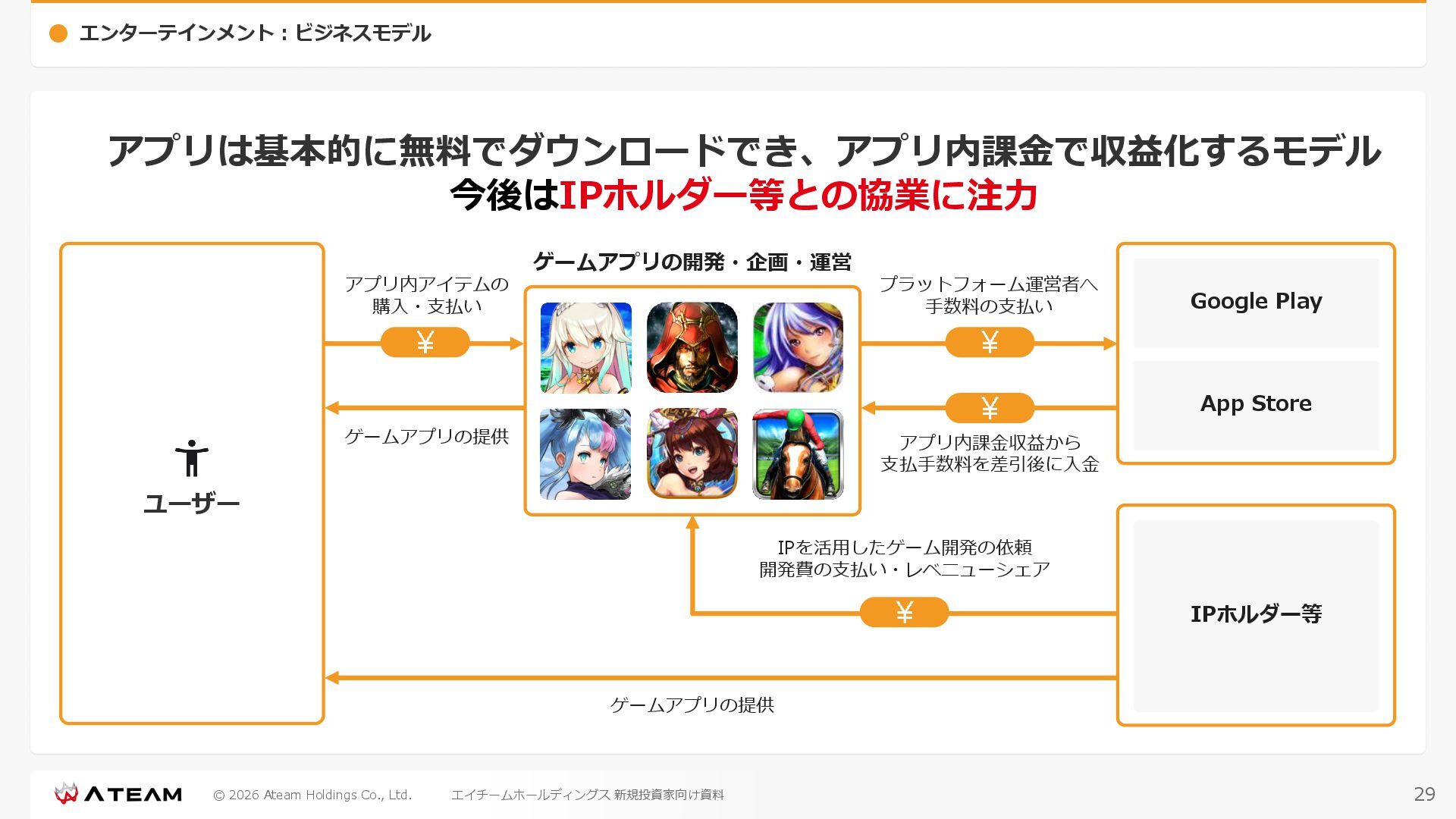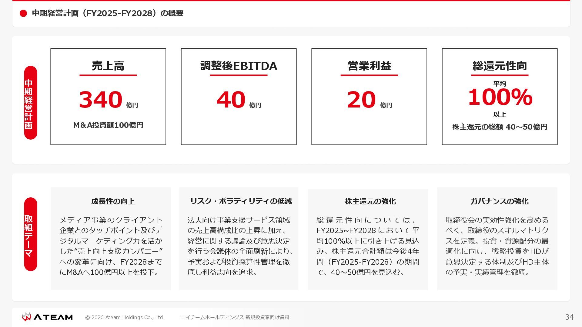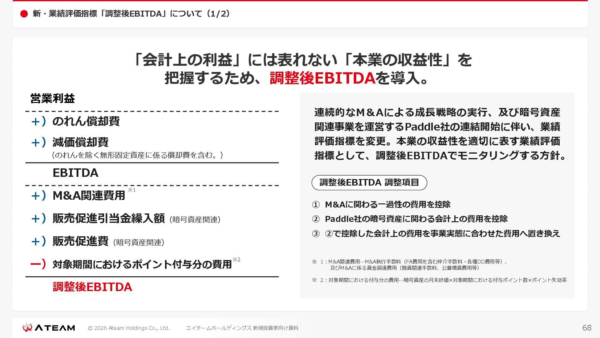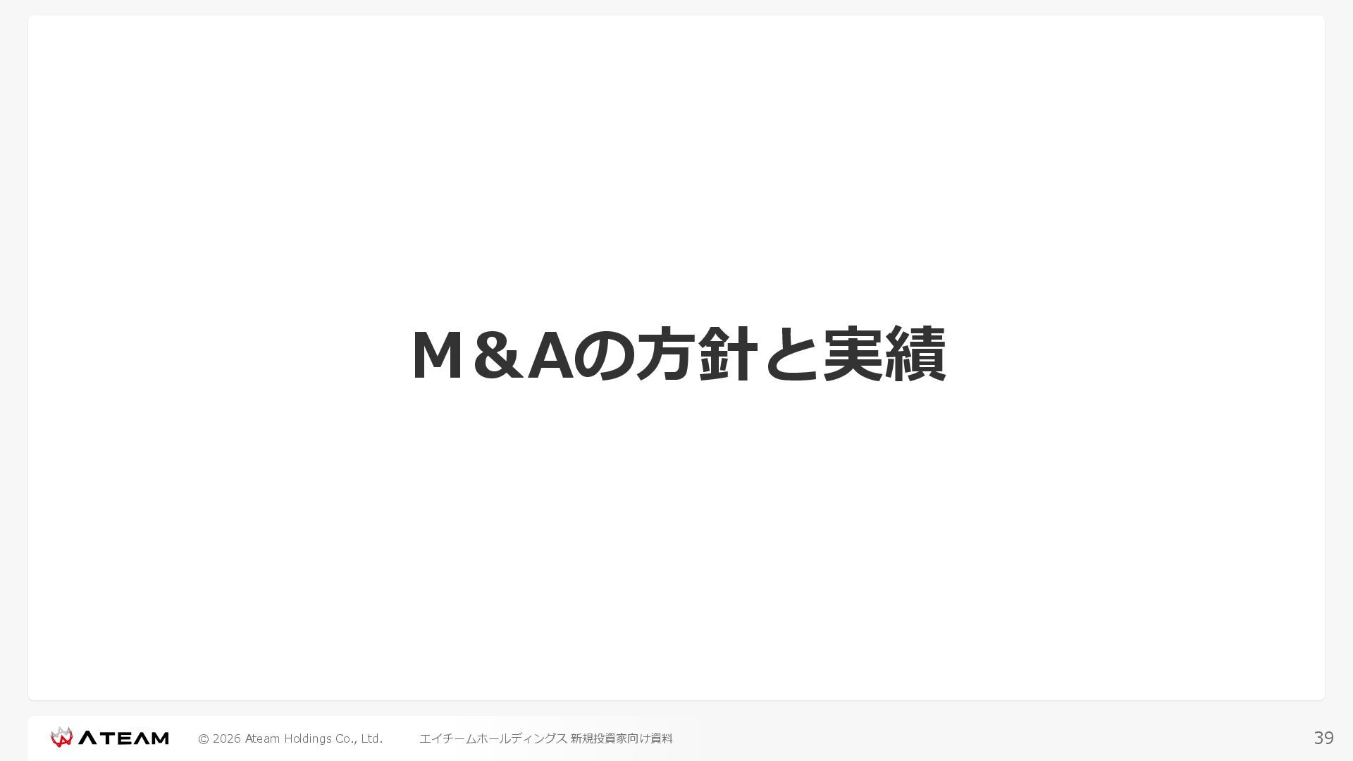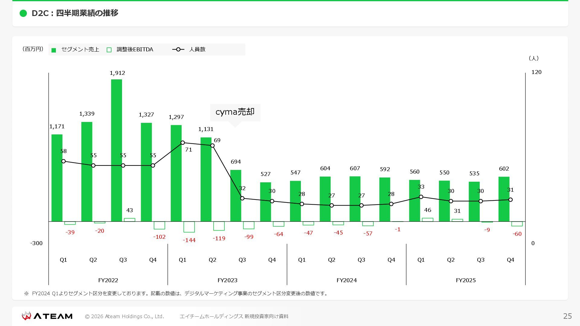 FY2022 FY2023 FY2024 FY2025 売上高 37,674 37,151 31,739 31,252 31,790 27,552 23,917 23,917 Y/Y 増減率(%) +8.9 -1.4 -14.6 -1.5 +1.7 -13.3 -13.2 -0.0 デジタルマーケティング 21,506 24,573 23,289 23,980 25,474 22,131 19,516 19,718 エンターテインメント 16,168 12,577 8,450 7,272 6,316 5,421 4,400 4,199 売上原価 6,960 7,518 7,654 8,193 8,463 5,062 3,546 3,395 原価率(%) 18.5 20.2 24.1 26.2 26.6 18.4 14.8 14.2 販売管理費 26,012 26,820 22,811 22,357 23,625 21,945 19,808 19,676 販売管理費率(%) 69.0 72.2 71.9 71.5 74.3 79.7 82.8 82.3 費用総額(売上原価+販売管理費) 32,973 34,339 30,465 30,550 32,089 27,008 23,355 23,071 人件費・採用費 4,754 6,032 6,274 6,273 5,949 5,594 5,000 4,999 広告宣伝費 14,805 15,048 12,444 12,380 13,998 13,136 12,539 11,822 広告宣伝費率(%) 39.3 40.5 39.2 39.6 44.0 47.7 52.4 49.4 デジタルマーケティング 10,715 12,452 11,648 11,813 12,711 12,778 12,347 11,533 エンターテインメント 3,785 2,355 706 494 1,219 302 181 281 支払手数料等 6,117 5,387 4,662 5,180 4,719 3,392 2,869 2,587 外注・サーバー費 2,277 2,574 2,115 2,058 2,029 1,243 1,029 818 オフィス賃料 1,080 1,179 1,142 1,129 1,011 891 688 640 その他(費用総額-上記費用) 3,937 4,116 3,825 3,528 4,380 2,750 1,227 2,203 EBITDA 5,199 3,562 1,847 1,149 122 1,115 711 1,273 調整後EBITDA 5,206 3,562 1,847 1,170 122 1,115 740 1,719 営業利益 4,701 2,811 1,273 701 -298 543 562 845 Y/Y 増減率(%) +15.3 -40.2 -54.7 -44.9 ー ー +3.4 +50.3 デジタルマーケティング 2,864 2,927 1,853 1,535 1,533 1,329 1,248 1,334 エンターテインメント 3,587 1,532 776 369 -894 166 -38 518 共通部門 -1,751 -1,648 -1,356 -1,203 -937 -951 -647 -1,008 営業利益率(%) 12.5 7.6 4.0 2.2 ー 2.0 2.4 3.5 経常利益 4,730 2,809 1,249 895 -219 711 609 1,585 税引前当期純利益 4,732 2,354 0 1,511 -734 432 1,152 1,875 親会社株主に帰属する当期純利益 3,306 1,473 -519 877 -1,337 143 953 1,036 人員数 944 1,118 1,177 1,162 1,082 910 861 830 デジタルマーケティング 544 635 703 682 629 485 442 430 エンターテインメント 312 381 382 373 351 337 324 300 共通部門 88 102 92 107 102 88 95 100 P/L(FY2017 - FY2025 通期) (百万円) 63 FY2025のセグメント区分変更後のPLで記載しております。 エイチームホールディングス 新規投資家向け資料