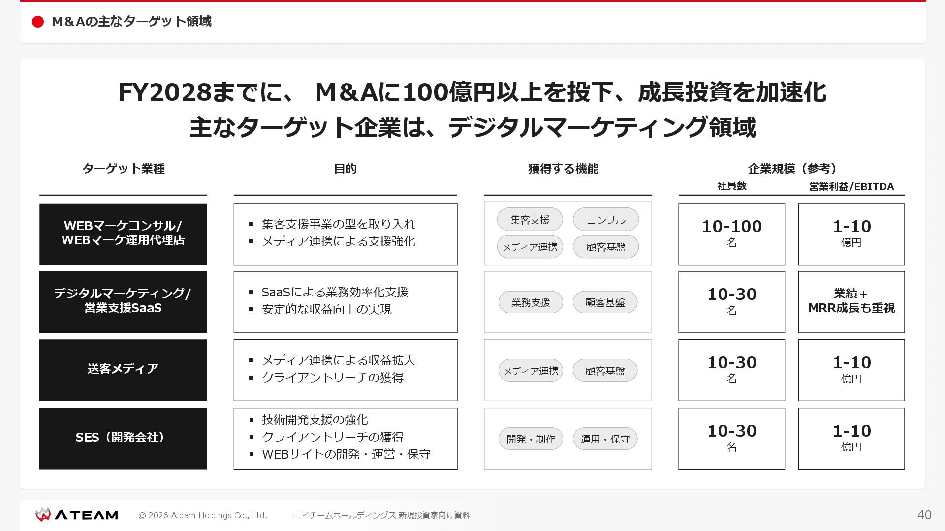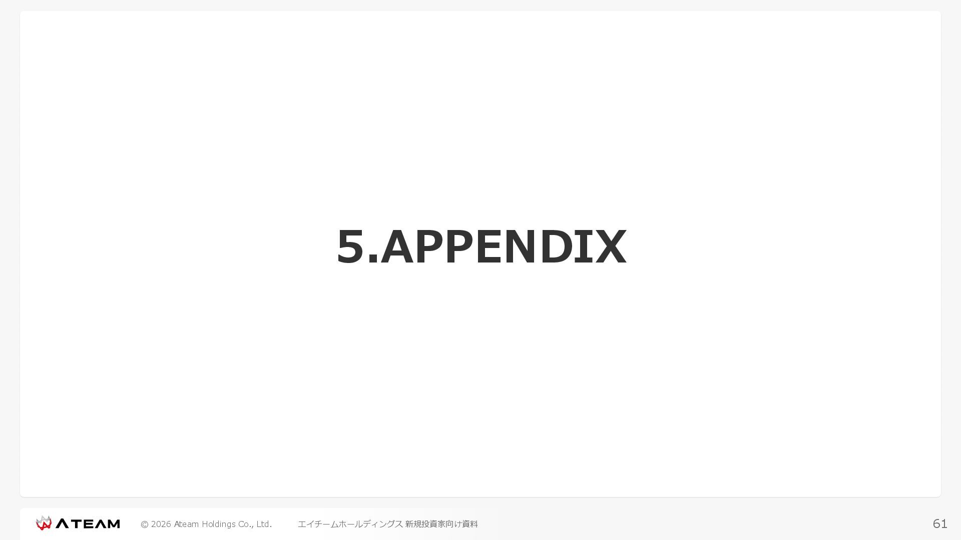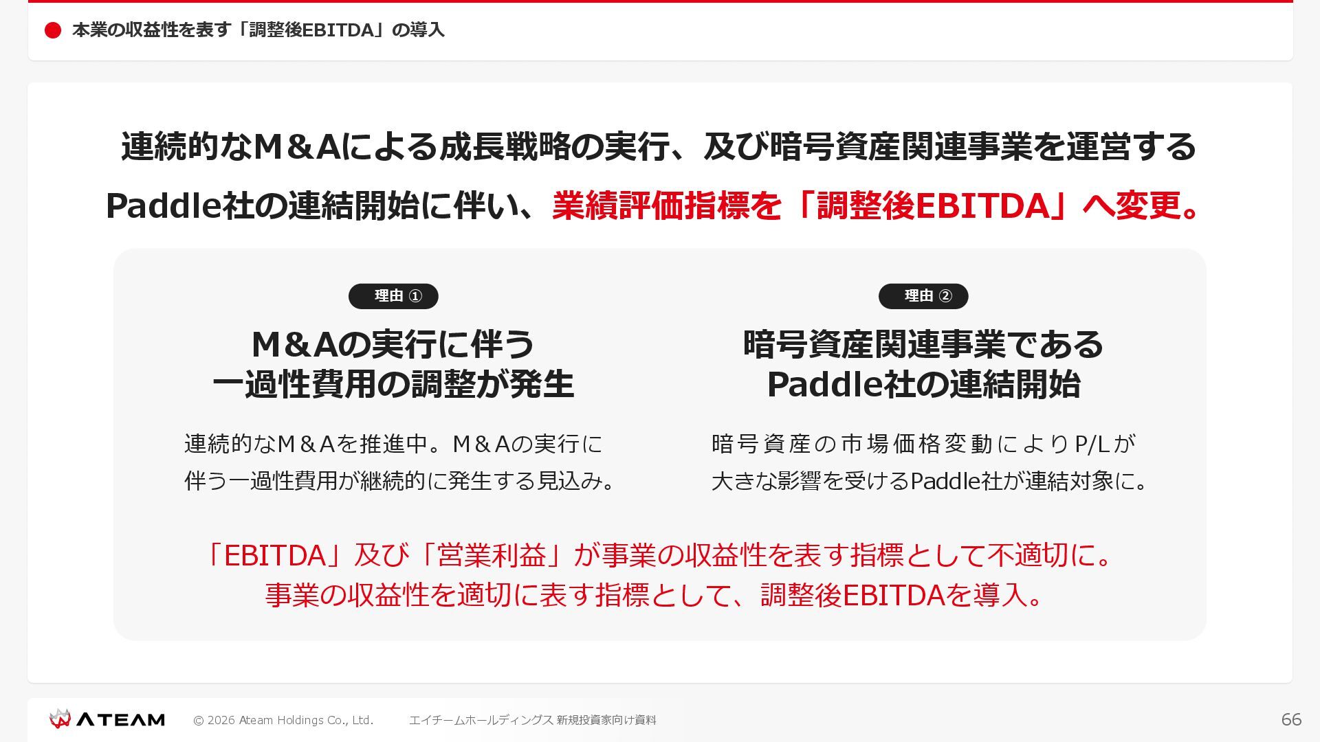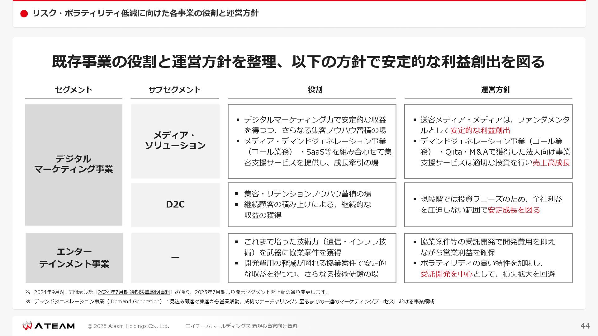 FY2022 FY2023 FY2024 FY2025 売上高 37,674 37,151 31,739 31,252 31,790 27,552 23,917 23,917 Y/Y 増減率(%) +8.9 -1.4 -14.6 -1.5 +1.7 -13.3 -13.2 -0.0 デジタルマーケティング 21,506 24,573 23,289 23,980 25,474 22,131 19,516 19,718 エンターテインメント 16,168 12,577 8,450 7,272 6,316 5,421 4,400 4,199 売上原価 6,960 7,518 7,654 8,193 8,463 5,062 3,546 3,395 原価率(%) 18.5 20.2 24.1 26.2 26.6 18.4 14.8 14.2 販売管理費 26,012 26,820 22,811 22,357 23,625 21,945 19,808 19,676 販売管理費率(%) 69.0 72.2 71.9 71.5 74.3 79.7 82.8 82.3 費用総額(売上原価+販売管理費) 32,973 34,339 30,465 30,550 32,089 27,008 23,355 23,071 人件費・採用費 4,754 6,032 6,274 6,273 5,949 5,594 5,000 4,999 広告宣伝費 14,805 15,048 12,444 12,380 13,998 13,136 12,539 11,822 広告宣伝費率(%) 39.3 40.5 39.2 39.6 44.0 47.7 52.4 49.4 デジタルマーケティング 10,715 12,452 11,648 11,813 12,711 12,778 12,347 11,533 エンターテインメント 3,785 2,355 706 494 1,219 302 181 281 支払手数料等 6,117 5,387 4,662 5,180 4,719 3,392 2,869 2,587 外注・サーバー費 2,277 2,574 2,115 2,058 2,029 1,243 1,029 818 オフィス賃料 1,080 1,179 1,142 1,129 1,011 891 688 640 その他(費用総額-上記費用) 3,937 4,116 3,825 3,528 4,380 2,750 1,227 2,203 EBITDA 5,199 3,562 1,847 1,149 122 1,115 711 1,273 調整後EBITDA 5,206 3,562 1,847 1,170 122 1,115 740 1,719 営業利益 4,701 2,811 1,273 701 -298 543 562 845 Y/Y 増減率(%) +15.3 -40.2 -54.7 -44.9 ー ー +3.4 +50.3 デジタルマーケティング 2,864 2,927 1,853 1,535 1,533 1,329 1,248 1,334 エンターテインメント 3,587 1,532 776 369 -894 166 -38 518 共通部門 -1,751 -1,648 -1,356 -1,203 -937 -951 -647 -1,008 営業利益率(%) 12.5 7.6 4.0 2.2 ー 2.0 2.4 3.5 経常利益 4,730 2,809 1,249 895 -219 711 609 1,585 税引前当期純利益 4,732 2,354 0 1,511 -734 432 1,152 1,875 親会社株主に帰属する当期純利益 3,306 1,473 -519 877 -1,337 143 953 1,036 人員数 944 1,118 1,177 1,162 1,082 910 861 830 デジタルマーケティング 544 635 703 682 629 485 442 430 エンターテインメント 312 381 382 373 351 337 324 300 共通部門 88 102 92 107 102 88 95 100 P/L(FY2017 - FY2025 通期) (百万円) 63 FY2025のセグメント区分変更後のPLで記載しております。 エイチームホールディングス 新規投資家向け資料
