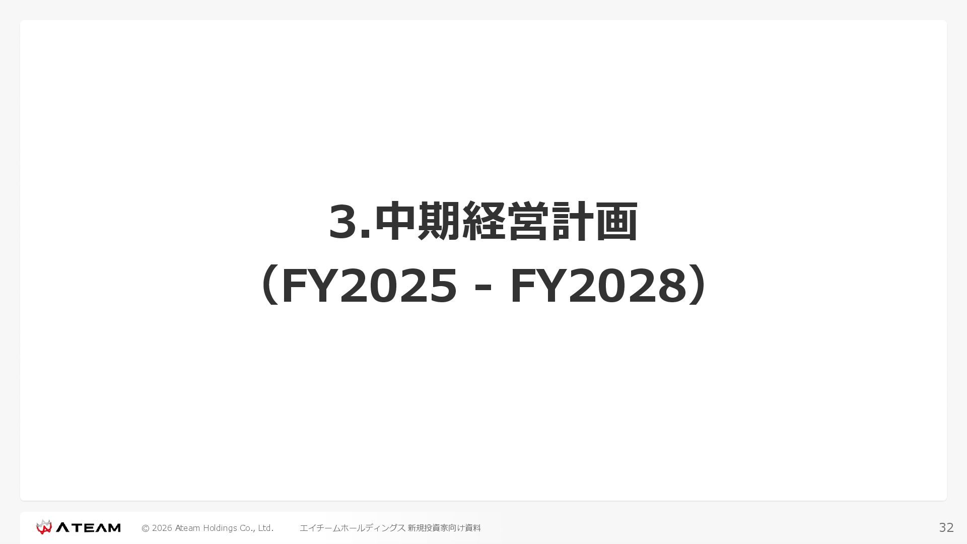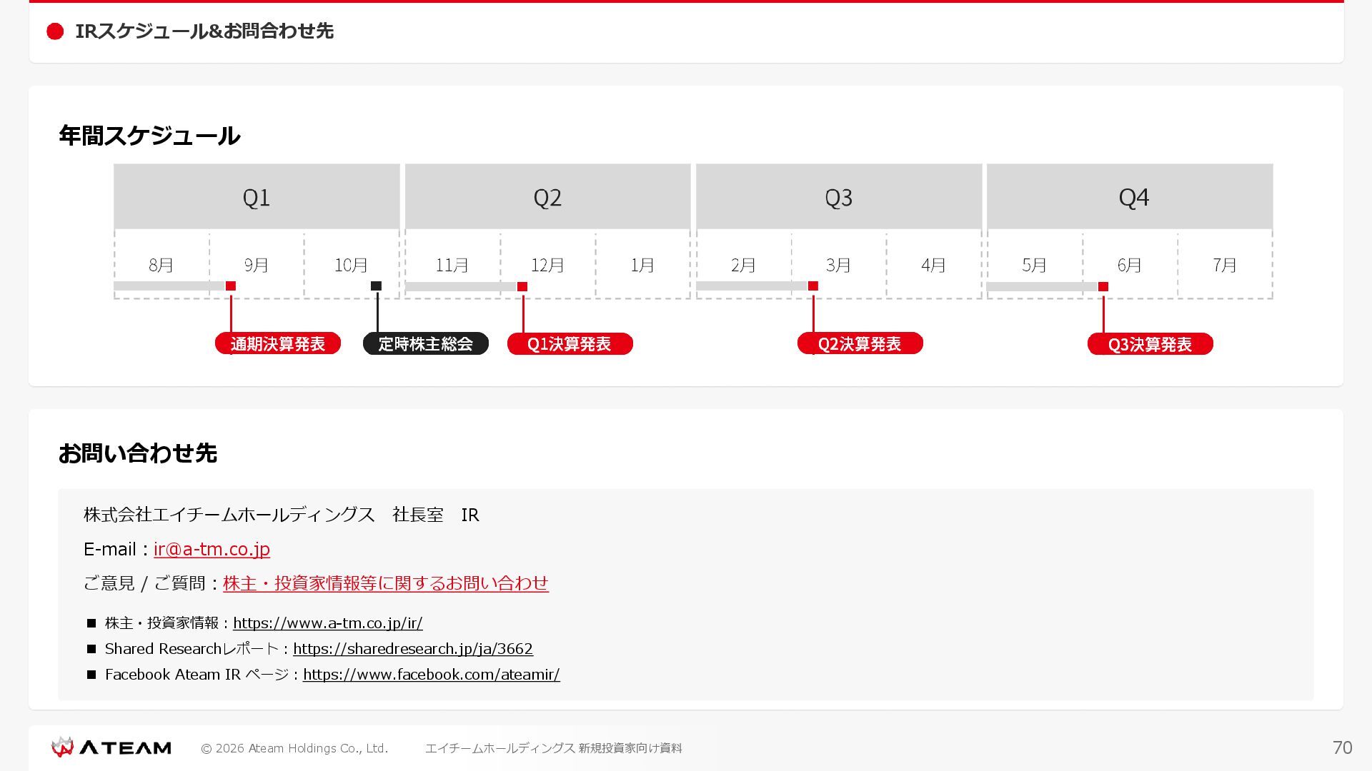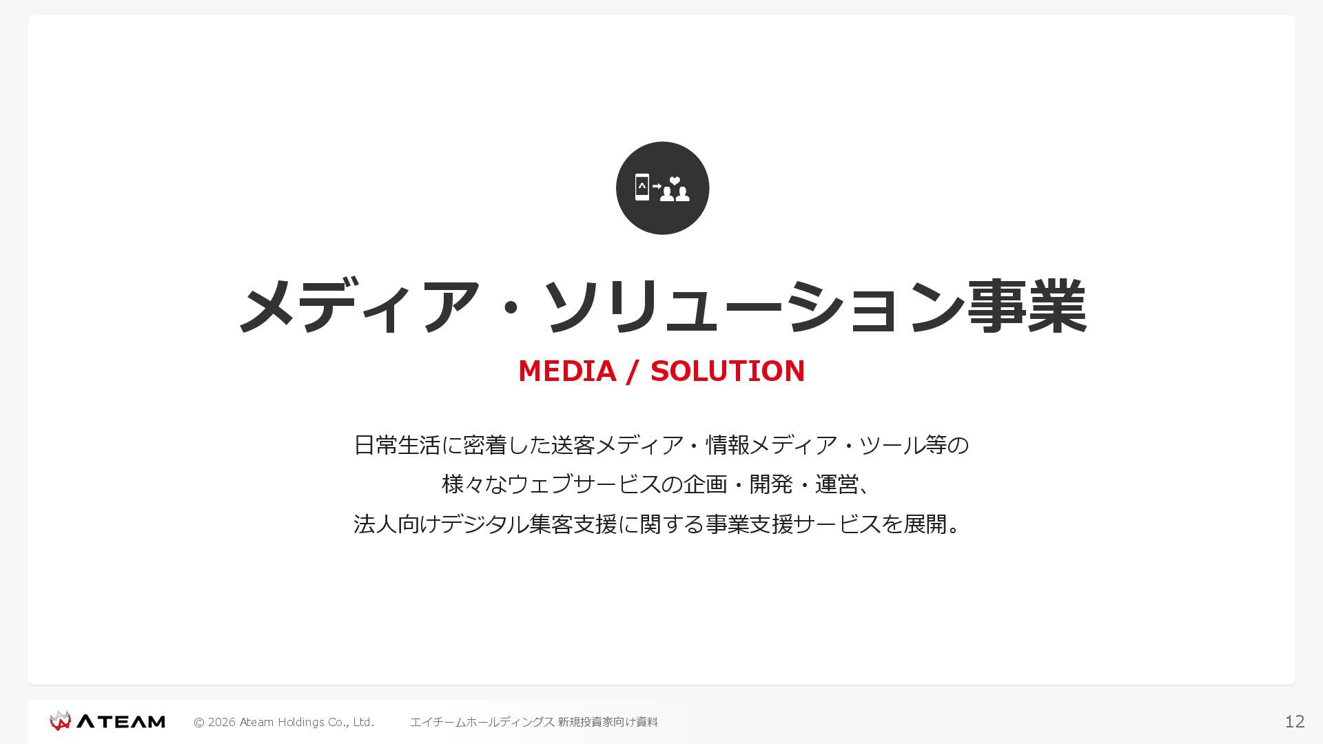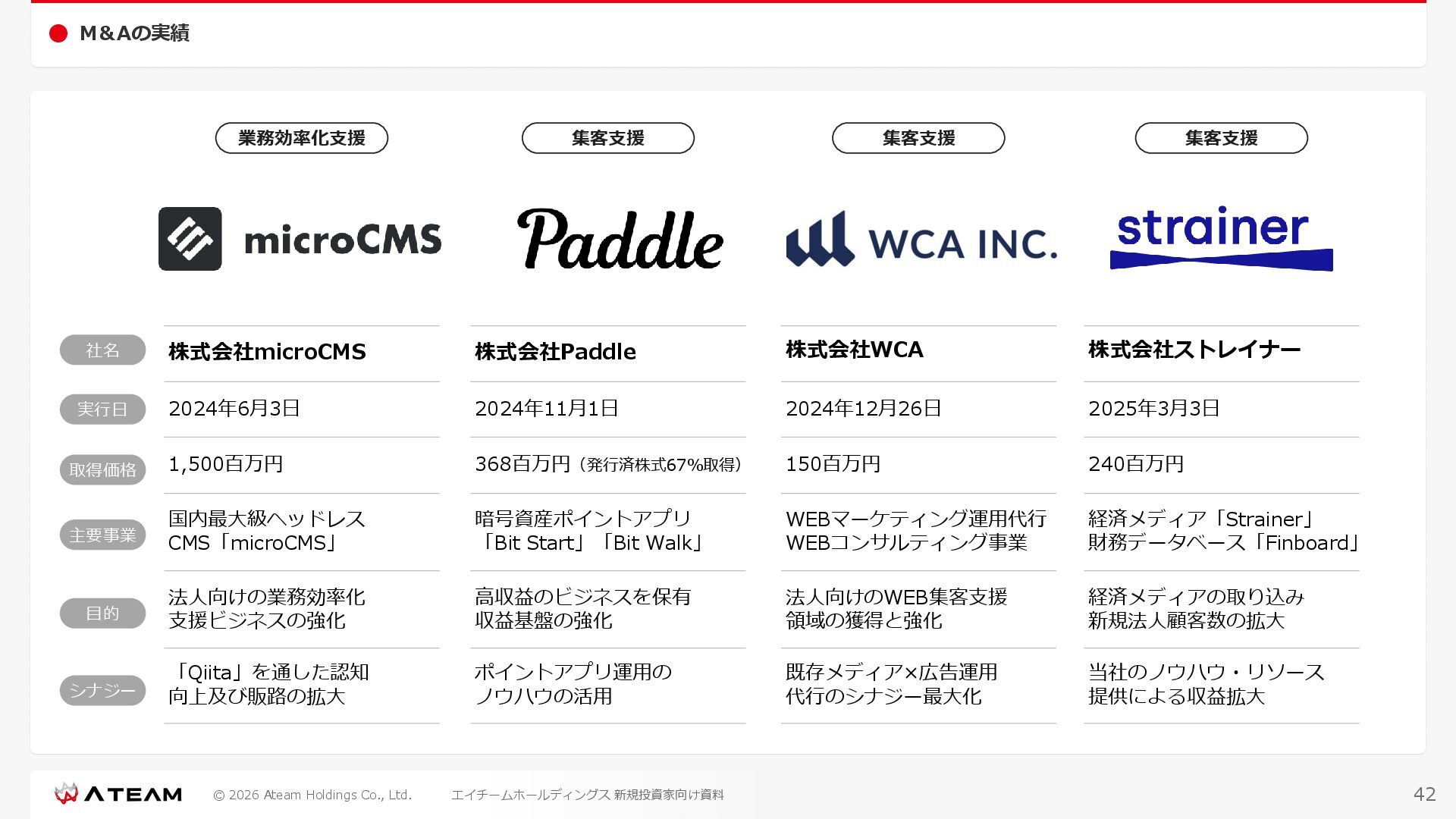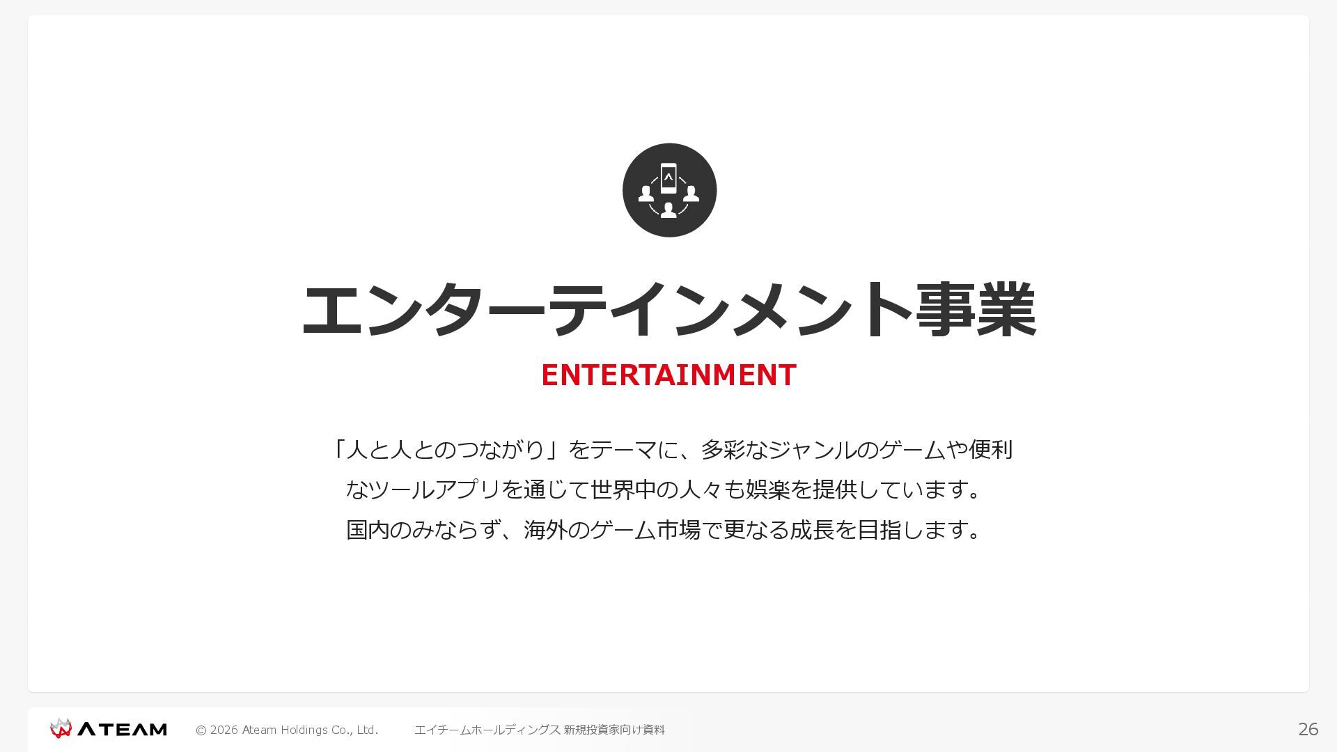 FY2022 FY2023 FY2024 FY2025 売上高 37,674 37,151 31,739 31,252 31,790 27,552 23,917 23,917 Y/Y 増減率(%) +8.9 -1.4 -14.6 -1.5 +1.7 -13.3 -13.2 -0.0 デジタルマーケティング 21,506 24,573 23,289 23,980 25,474 22,131 19,516 19,718 エンターテインメント 16,168 12,577 8,450 7,272 6,316 5,421 4,400 4,199 売上原価 6,960 7,518 7,654 8,193 8,463 5,062 3,546 3,395 原価率(%) 18.5 20.2 24.1 26.2 26.6 18.4 14.8 14.2 販売管理費 26,012 26,820 22,811 22,357 23,625 21,945 19,808 19,676 販売管理費率(%) 69.0 72.2 71.9 71.5 74.3 79.7 82.8 82.3 費用総額(売上原価+販売管理費) 32,973 34,339 30,465 30,550 32,089 27,008 23,355 23,071 人件費・採用費 4,754 6,032 6,274 6,273 5,949 5,594 5,000 4,999 広告宣伝費 14,805 15,048 12,444 12,380 13,998 13,136 12,539 11,822 広告宣伝費率(%) 39.3 40.5 39.2 39.6 44.0 47.7 52.4 49.4 デジタルマーケティング 10,715 12,452 11,648 11,813 12,711 12,778 12,347 11,533 エンターテインメント 3,785 2,355 706 494 1,219 302 181 281 支払手数料等 6,117 5,387 4,662 5,180 4,719 3,392 2,869 2,587 外注・サーバー費 2,277 2,574 2,115 2,058 2,029 1,243 1,029 818 オフィス賃料 1,080 1,179 1,142 1,129 1,011 891 688 640 その他(費用総額-上記費用) 3,937 4,116 3,825 3,528 4,380 2,750 1,227 2,203 EBITDA 5,199 3,562 1,847 1,149 122 1,115 711 1,273 調整後EBITDA 5,206 3,562 1,847 1,170 122 1,115 740 1,719 営業利益 4,701 2,811 1,273 701 -298 543 562 845 Y/Y 増減率(%) +15.3 -40.2 -54.7 -44.9 ー ー +3.4 +50.3 デジタルマーケティング 2,864 2,927 1,853 1,535 1,533 1,329 1,248 1,334 エンターテインメント 3,587 1,532 776 369 -894 166 -38 518 共通部門 -1,751 -1,648 -1,356 -1,203 -937 -951 -647 -1,008 営業利益率(%) 12.5 7.6 4.0 2.2 ー 2.0 2.4 3.5 経常利益 4,730 2,809 1,249 895 -219 711 609 1,585 税引前当期純利益 4,732 2,354 0 1,511 -734 432 1,152 1,875 親会社株主に帰属する当期純利益 3,306 1,473 -519 877 -1,337 143 953 1,036 人員数 944 1,118 1,177 1,162 1,082 910 861 830 デジタルマーケティング 544 635 703 682 629 485 442 430 エンターテインメント 312 381 382 373 351 337 324 300 共通部門 88 102 92 107 102 88 95 100 P/L(FY2017 - FY2025 通期) (百万円) 63 FY2025のセグメント区分変更後のPLで記載しております。 エイチームホールディングス 新規投資家向け資料