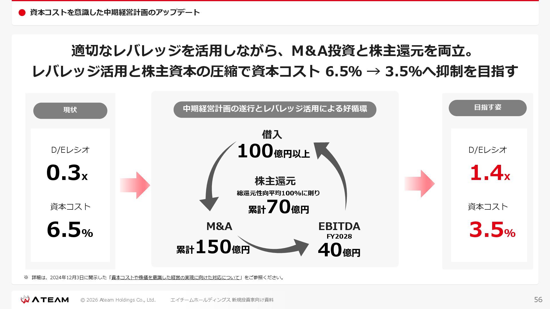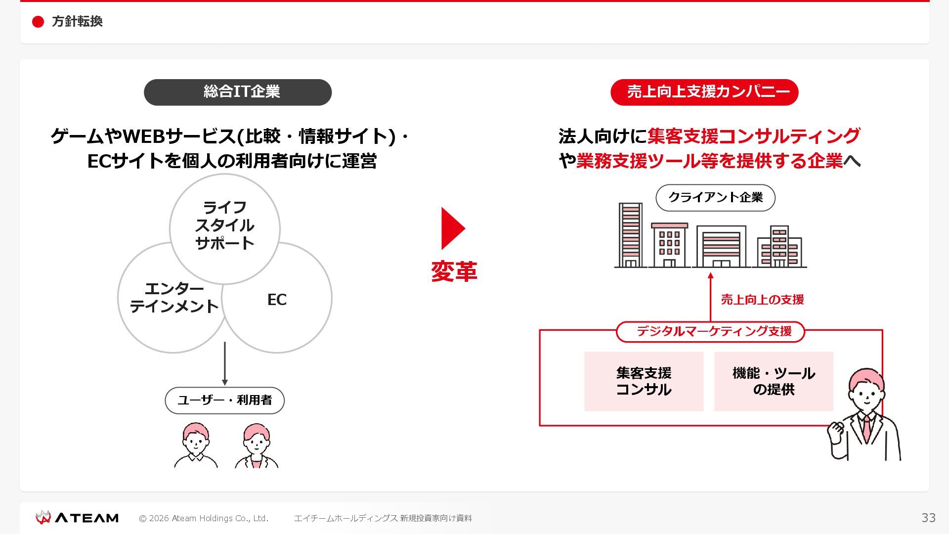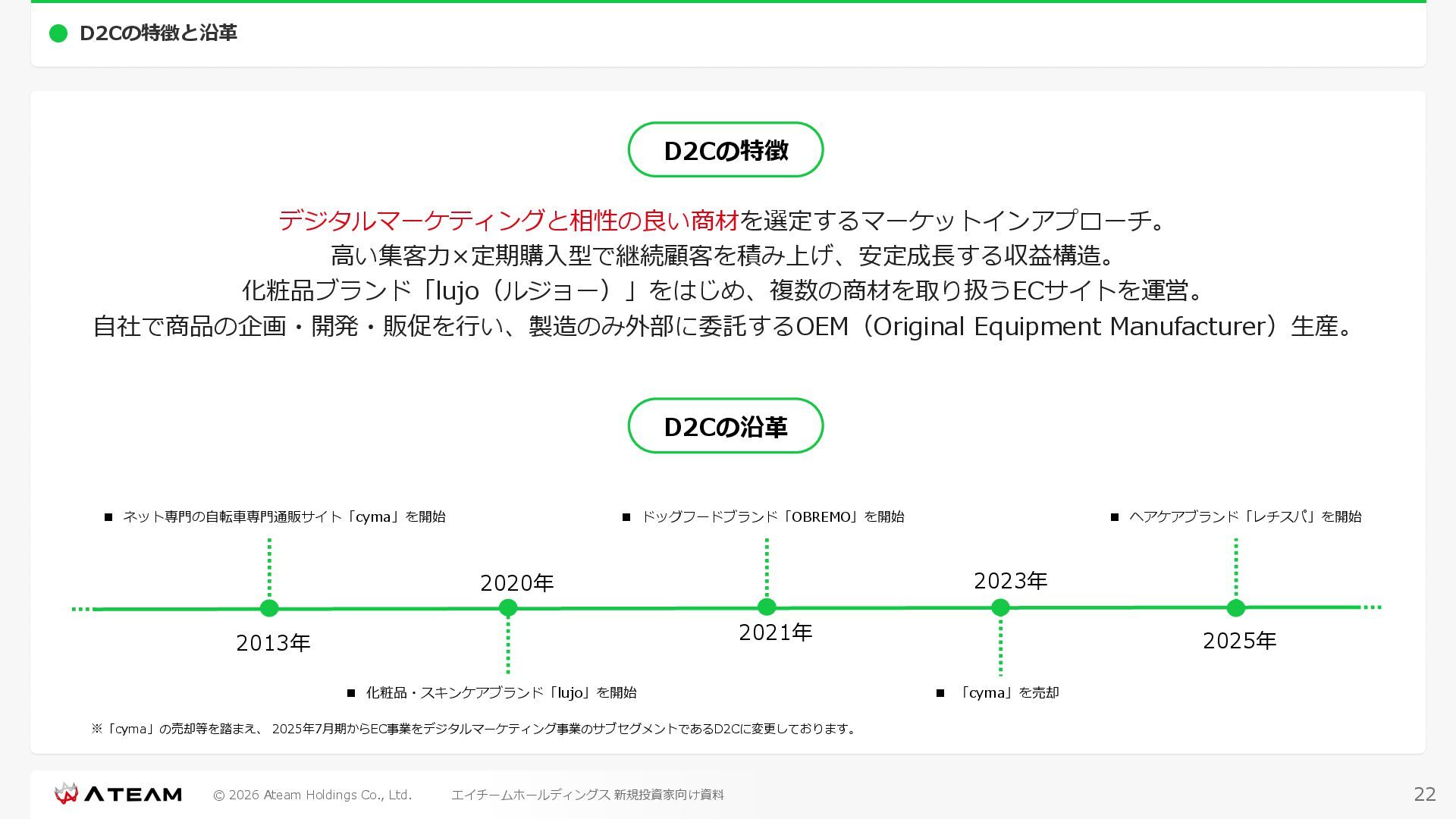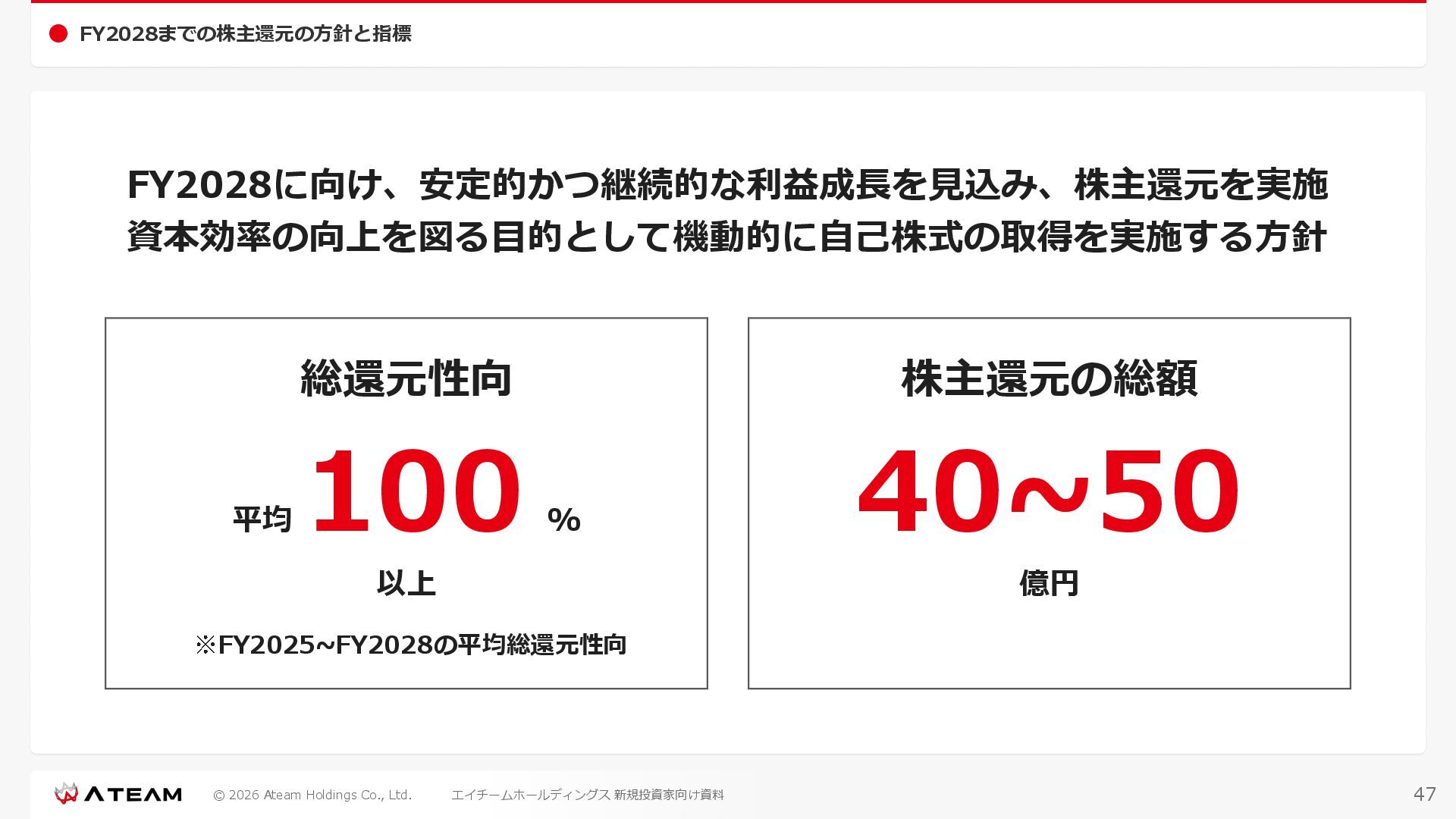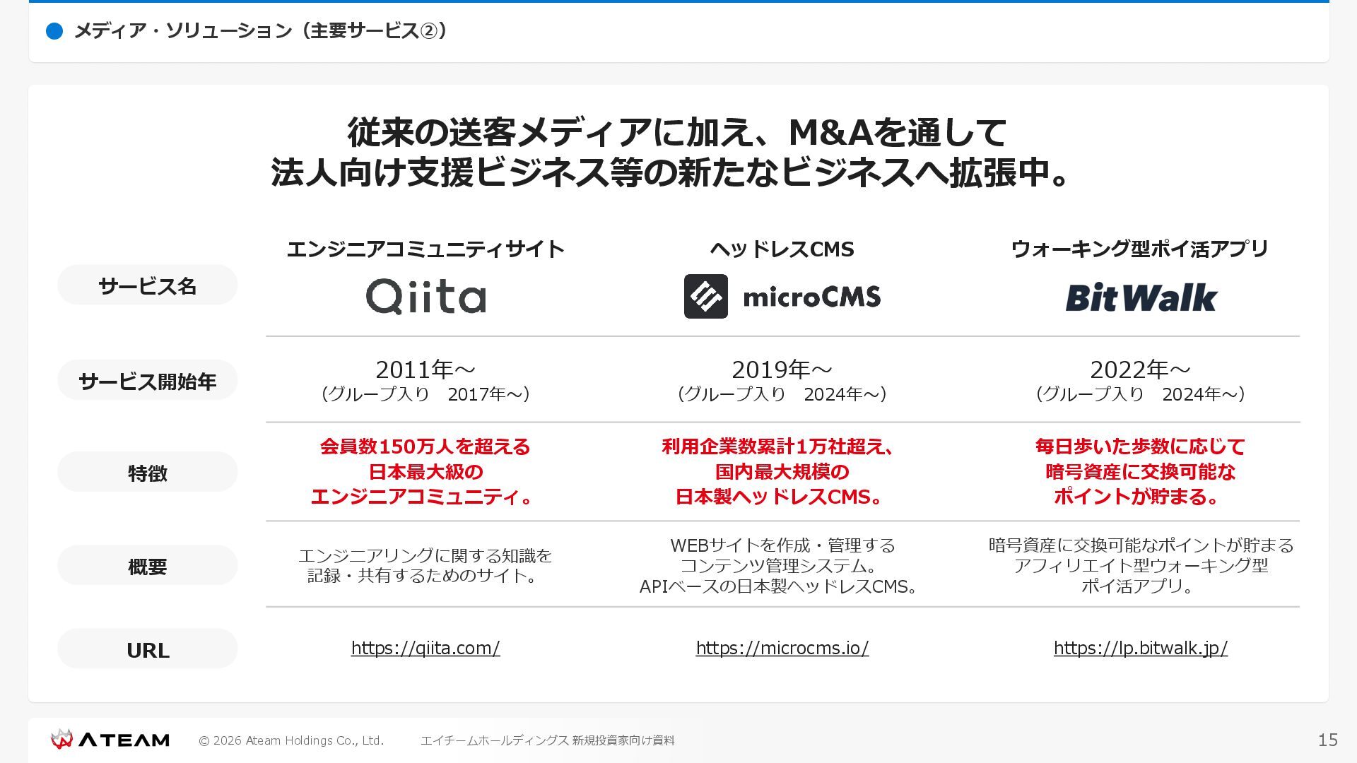 FY2022 FY2023 FY2024 FY2025 売上高 37,674 37,151 31,739 31,252 31,790 27,552 23,917 23,917 Y/Y 増減率(%) +8.9 -1.4 -14.6 -1.5 +1.7 -13.3 -13.2 -0.0 デジタルマーケティング 21,506 24,573 23,289 23,980 25,474 22,131 19,516 19,718 エンターテインメント 16,168 12,577 8,450 7,272 6,316 5,421 4,400 4,199 売上原価 6,960 7,518 7,654 8,193 8,463 5,062 3,546 3,395 原価率(%) 18.5 20.2 24.1 26.2 26.6 18.4 14.8 14.2 販売管理費 26,012 26,820 22,811 22,357 23,625 21,945 19,808 19,676 販売管理費率(%) 69.0 72.2 71.9 71.5 74.3 79.7 82.8 82.3 費用総額(売上原価+販売管理費) 32,973 34,339 30,465 30,550 32,089 27,008 23,355 23,071 人件費・採用費 4,754 6,032 6,274 6,273 5,949 5,594 5,000 4,999 広告宣伝費 14,805 15,048 12,444 12,380 13,998 13,136 12,539 11,822 広告宣伝費率(%) 39.3 40.5 39.2 39.6 44.0 47.7 52.4 49.4 デジタルマーケティング 10,715 12,452 11,648 11,813 12,711 12,778 12,347 11,533 エンターテインメント 3,785 2,355 706 494 1,219 302 181 281 支払手数料等 6,117 5,387 4,662 5,180 4,719 3,392 2,869 2,587 外注・サーバー費 2,277 2,574 2,115 2,058 2,029 1,243 1,029 818 オフィス賃料 1,080 1,179 1,142 1,129 1,011 891 688 640 その他(費用総額-上記費用) 3,937 4,116 3,825 3,528 4,380 2,750 1,227 2,203 EBITDA 5,199 3,562 1,847 1,149 122 1,115 711 1,273 調整後EBITDA 5,206 3,562 1,847 1,170 122 1,115 740 1,719 営業利益 4,701 2,811 1,273 701 -298 543 562 845 Y/Y 増減率(%) +15.3 -40.2 -54.7 -44.9 ー ー +3.4 +50.3 デジタルマーケティング 2,864 2,927 1,853 1,535 1,533 1,329 1,248 1,334 エンターテインメント 3,587 1,532 776 369 -894 166 -38 518 共通部門 -1,751 -1,648 -1,356 -1,203 -937 -951 -647 -1,008 営業利益率(%) 12.5 7.6 4.0 2.2 ー 2.0 2.4 3.5 経常利益 4,730 2,809 1,249 895 -219 711 609 1,585 税引前当期純利益 4,732 2,354 0 1,511 -734 432 1,152 1,875 親会社株主に帰属する当期純利益 3,306 1,473 -519 877 -1,337 143 953 1,036 人員数 944 1,118 1,177 1,162 1,082 910 861 830 デジタルマーケティング 544 635 703 682 629 485 442 430 エンターテインメント 312 381 382 373 351 337 324 300 共通部門 88 102 92 107 102 88 95 100 P/L(FY2017 - FY2025 通期) (百万円) 63 FY2025のセグメント区分変更後のPLで記載しております。 エイチームホールディングス 新規投資家向け資料