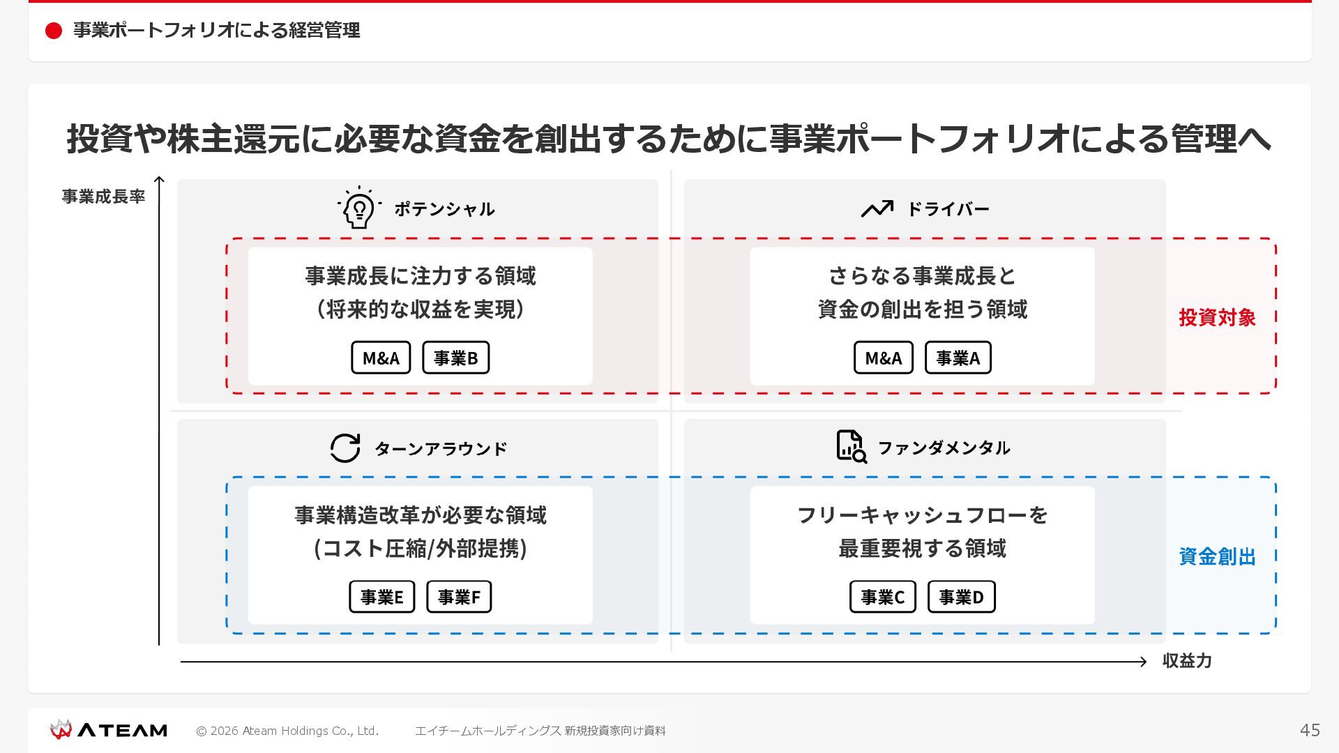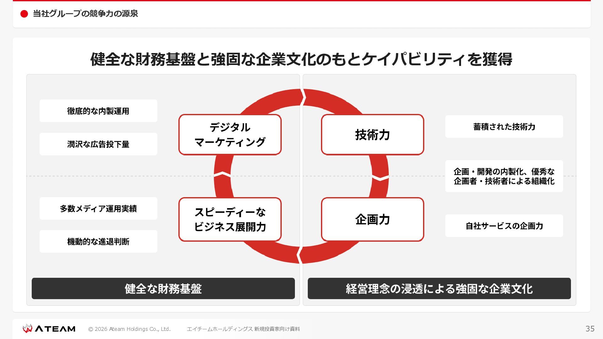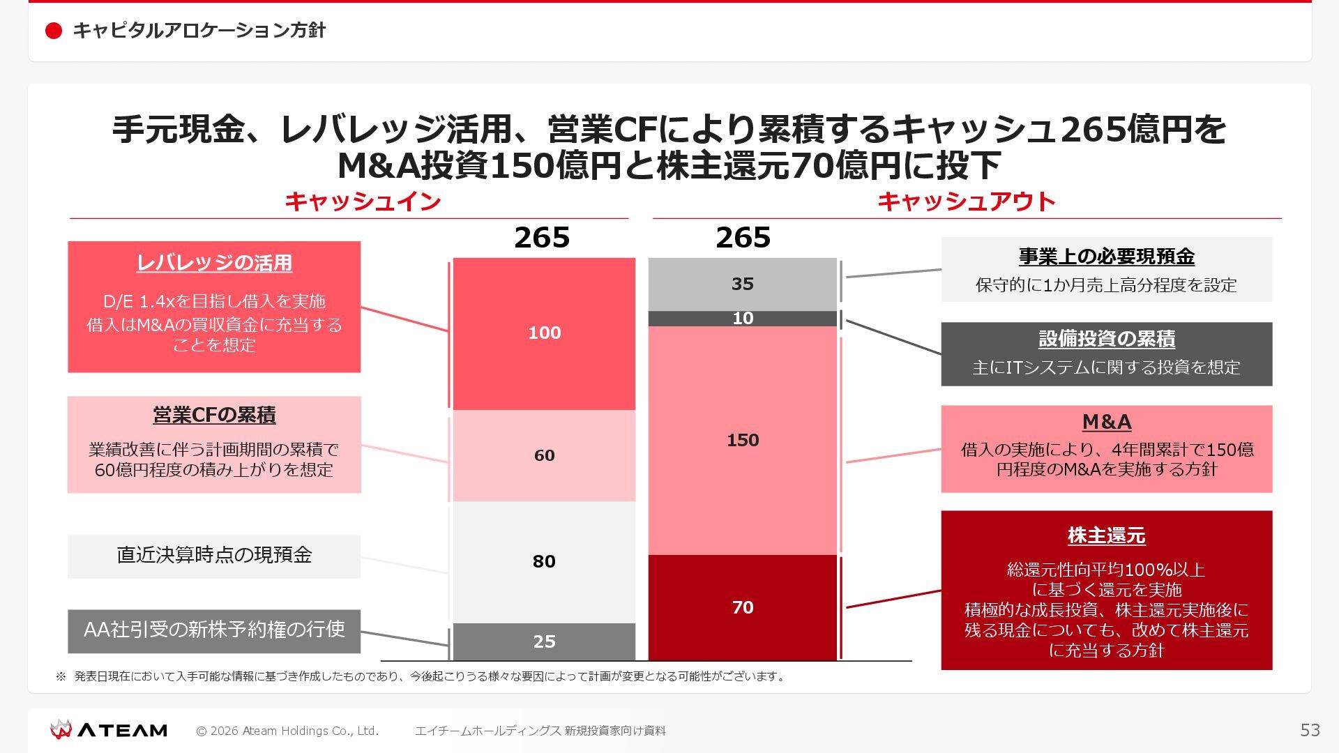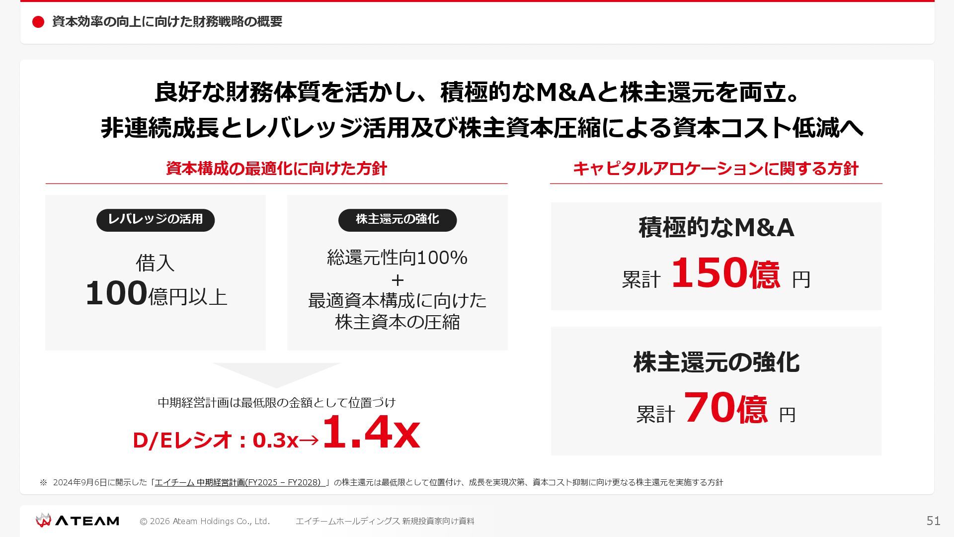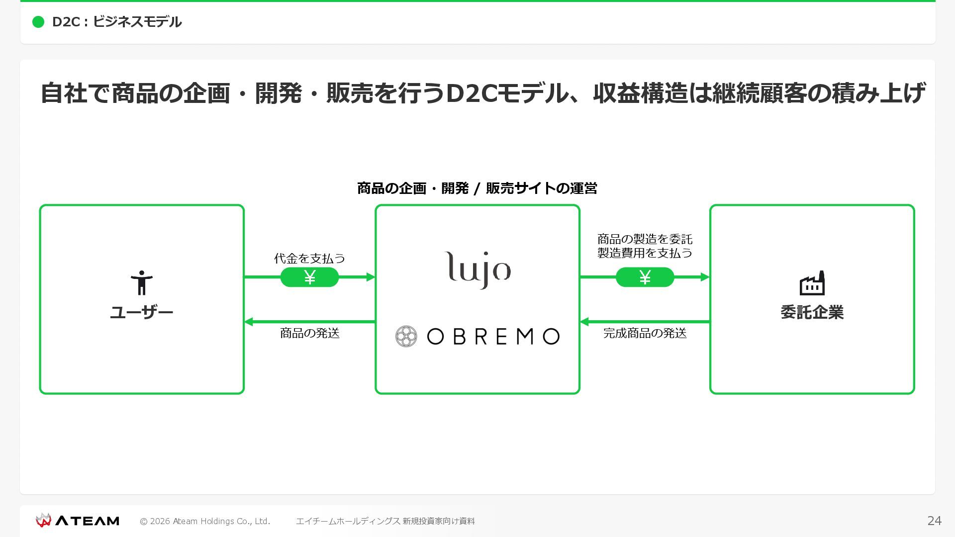 FY2022 FY2023 FY2024 FY2025 売上高 37,674 37,151 31,739 31,252 31,790 27,552 23,917 23,917 Y/Y 増減率(%) +8.9 -1.4 -14.6 -1.5 +1.7 -13.3 -13.2 -0.0 デジタルマーケティング 21,506 24,573 23,289 23,980 25,474 22,131 19,516 19,718 エンターテインメント 16,168 12,577 8,450 7,272 6,316 5,421 4,400 4,199 売上原価 6,960 7,518 7,654 8,193 8,463 5,062 3,546 3,395 原価率(%) 18.5 20.2 24.1 26.2 26.6 18.4 14.8 14.2 販売管理費 26,012 26,820 22,811 22,357 23,625 21,945 19,808 19,676 販売管理費率(%) 69.0 72.2 71.9 71.5 74.3 79.7 82.8 82.3 費用総額(売上原価+販売管理費) 32,973 34,339 30,465 30,550 32,089 27,008 23,355 23,071 人件費・採用費 4,754 6,032 6,274 6,273 5,949 5,594 5,000 4,999 広告宣伝費 14,805 15,048 12,444 12,380 13,998 13,136 12,539 11,822 広告宣伝費率(%) 39.3 40.5 39.2 39.6 44.0 47.7 52.4 49.4 デジタルマーケティング 10,715 12,452 11,648 11,813 12,711 12,778 12,347 11,533 エンターテインメント 3,785 2,355 706 494 1,219 302 181 281 支払手数料等 6,117 5,387 4,662 5,180 4,719 3,392 2,869 2,587 外注・サーバー費 2,277 2,574 2,115 2,058 2,029 1,243 1,029 818 オフィス賃料 1,080 1,179 1,142 1,129 1,011 891 688 640 その他(費用総額-上記費用) 3,937 4,116 3,825 3,528 4,380 2,750 1,227 2,203 EBITDA 5,199 3,562 1,847 1,149 122 1,115 711 1,273 調整後EBITDA 5,206 3,562 1,847 1,170 122 1,115 740 1,719 営業利益 4,701 2,811 1,273 701 -298 543 562 845 Y/Y 増減率(%) +15.3 -40.2 -54.7 -44.9 ー ー +3.4 +50.3 デジタルマーケティング 2,864 2,927 1,853 1,535 1,533 1,329 1,248 1,334 エンターテインメント 3,587 1,532 776 369 -894 166 -38 518 共通部門 -1,751 -1,648 -1,356 -1,203 -937 -951 -647 -1,008 営業利益率(%) 12.5 7.6 4.0 2.2 ー 2.0 2.4 3.5 経常利益 4,730 2,809 1,249 895 -219 711 609 1,585 税引前当期純利益 4,732 2,354 0 1,511 -734 432 1,152 1,875 親会社株主に帰属する当期純利益 3,306 1,473 -519 877 -1,337 143 953 1,036 人員数 944 1,118 1,177 1,162 1,082 910 861 830 デジタルマーケティング 544 635 703 682 629 485 442 430 エンターテインメント 312 381 382 373 351 337 324 300 共通部門 88 102 92 107 102 88 95 100 P/L(FY2017 - FY2025 通期) (百万円) 63 FY2025のセグメント区分変更後のPLで記載しております。 エイチームホールディングス 新規投資家向け資料