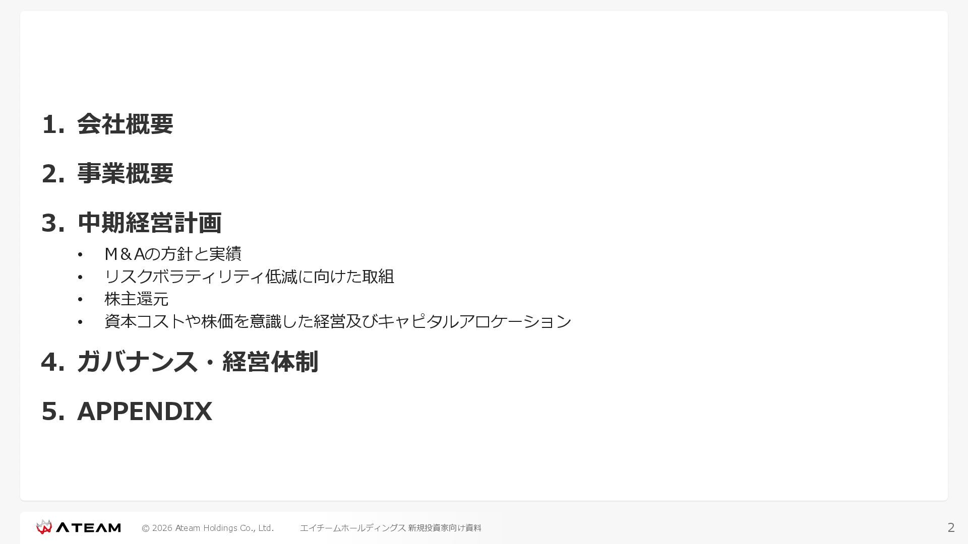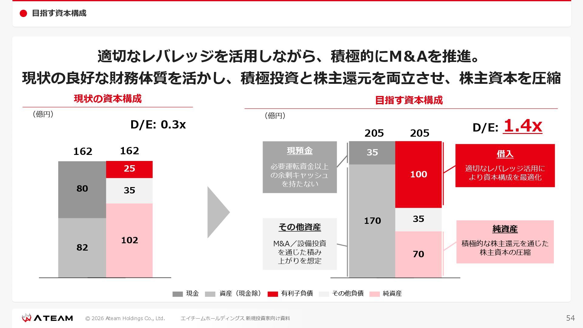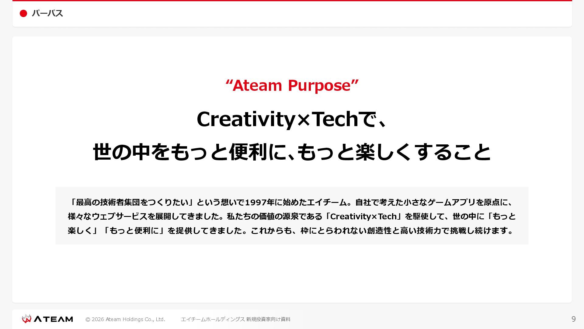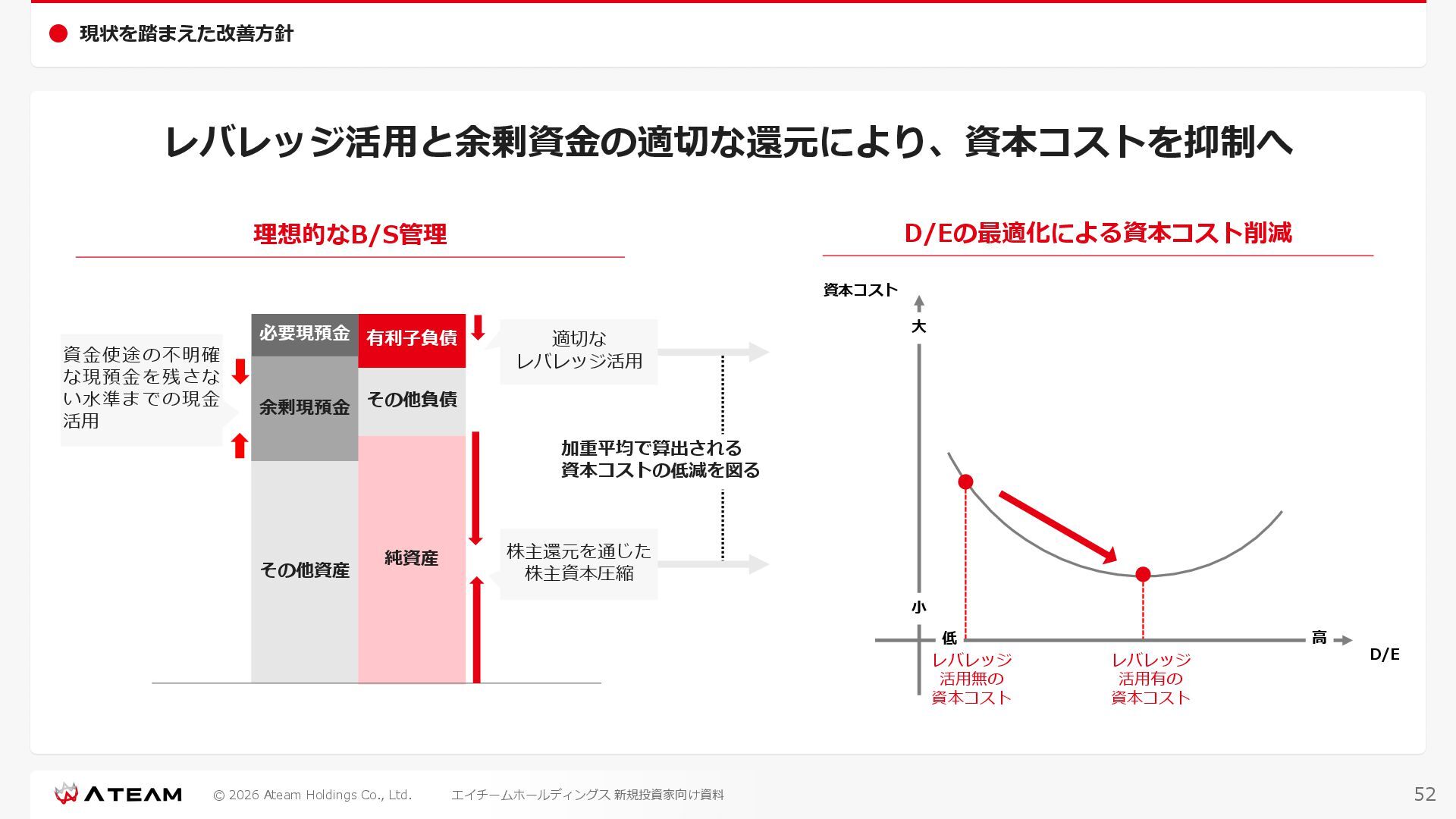 FY2022 FY2023 FY2024 FY2025 売上高 37,674 37,151 31,739 31,252 31,790 27,552 23,917 23,917 Y/Y 増減率(%) +8.9 -1.4 -14.6 -1.5 +1.7 -13.3 -13.2 -0.0 デジタルマーケティング 21,506 24,573 23,289 23,980 25,474 22,131 19,516 19,718 エンターテインメント 16,168 12,577 8,450 7,272 6,316 5,421 4,400 4,199 売上原価 6,960 7,518 7,654 8,193 8,463 5,062 3,546 3,395 原価率(%) 18.5 20.2 24.1 26.2 26.6 18.4 14.8 14.2 販売管理費 26,012 26,820 22,811 22,357 23,625 21,945 19,808 19,676 販売管理費率(%) 69.0 72.2 71.9 71.5 74.3 79.7 82.8 82.3 費用総額(売上原価+販売管理費) 32,973 34,339 30,465 30,550 32,089 27,008 23,355 23,071 人件費・採用費 4,754 6,032 6,274 6,273 5,949 5,594 5,000 4,999 広告宣伝費 14,805 15,048 12,444 12,380 13,998 13,136 12,539 11,822 広告宣伝費率(%) 39.3 40.5 39.2 39.6 44.0 47.7 52.4 49.4 デジタルマーケティング 10,715 12,452 11,648 11,813 12,711 12,778 12,347 11,533 エンターテインメント 3,785 2,355 706 494 1,219 302 181 281 支払手数料等 6,117 5,387 4,662 5,180 4,719 3,392 2,869 2,587 外注・サーバー費 2,277 2,574 2,115 2,058 2,029 1,243 1,029 818 オフィス賃料 1,080 1,179 1,142 1,129 1,011 891 688 640 その他(費用総額-上記費用) 3,937 4,116 3,825 3,528 4,380 2,750 1,227 2,203 EBITDA 5,199 3,562 1,847 1,149 122 1,115 711 1,273 調整後EBITDA 5,206 3,562 1,847 1,170 122 1,115 740 1,719 営業利益 4,701 2,811 1,273 701 -298 543 562 845 Y/Y 増減率(%) +15.3 -40.2 -54.7 -44.9 ー ー +3.4 +50.3 デジタルマーケティング 2,864 2,927 1,853 1,535 1,533 1,329 1,248 1,334 エンターテインメント 3,587 1,532 776 369 -894 166 -38 518 共通部門 -1,751 -1,648 -1,356 -1,203 -937 -951 -647 -1,008 営業利益率(%) 12.5 7.6 4.0 2.2 ー 2.0 2.4 3.5 経常利益 4,730 2,809 1,249 895 -219 711 609 1,585 税引前当期純利益 4,732 2,354 0 1,511 -734 432 1,152 1,875 親会社株主に帰属する当期純利益 3,306 1,473 -519 877 -1,337 143 953 1,036 人員数 944 1,118 1,177 1,162 1,082 910 861 830 デジタルマーケティング 544 635 703 682 629 485 442 430 エンターテインメント 312 381 382 373 351 337 324 300 共通部門 88 102 92 107 102 88 95 100 P/L(FY2017 - FY2025 通期) (百万円) 63 FY2025のセグメント区分変更後のPLで記載しております。 エイチームホールディングス 新規投資家向け資料