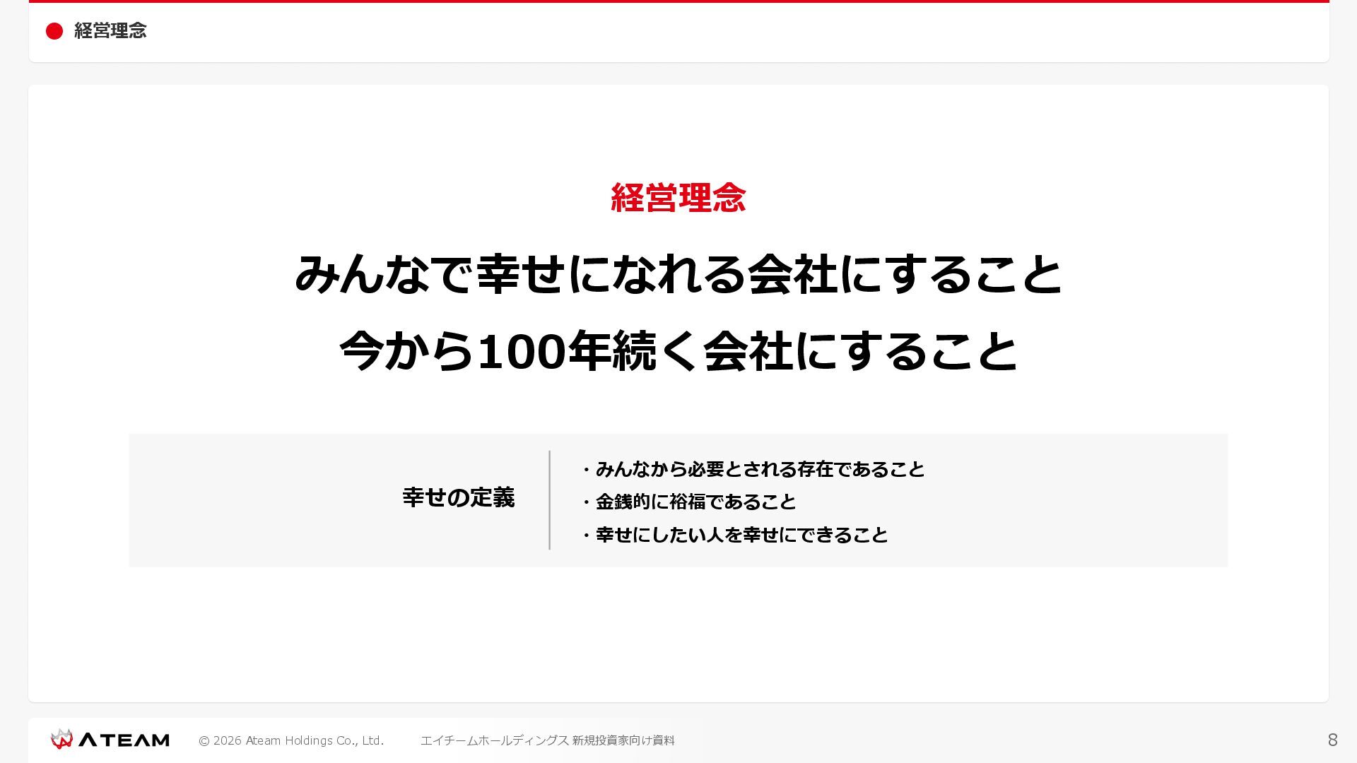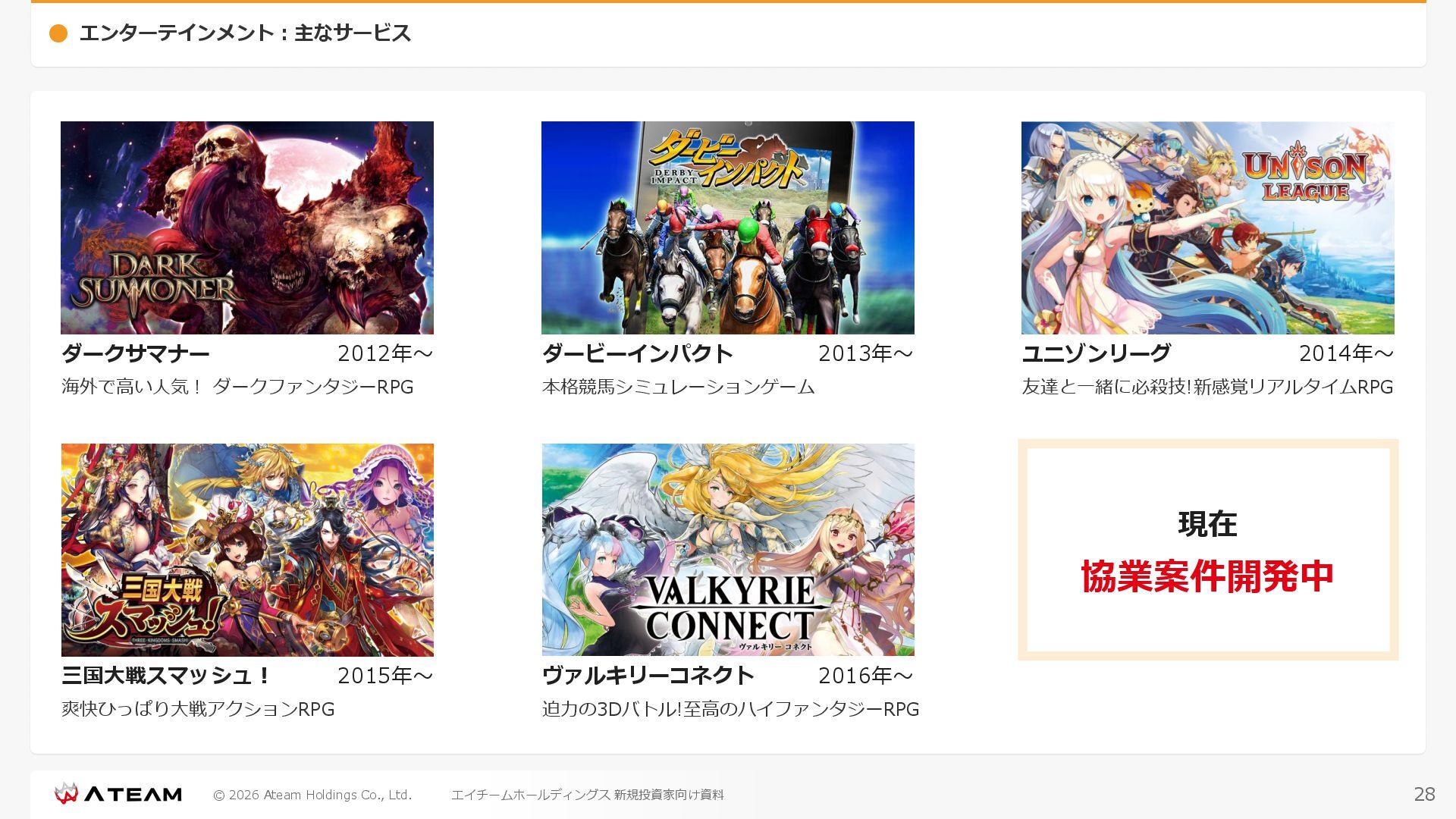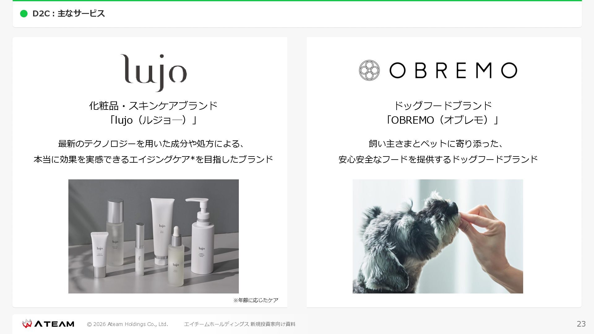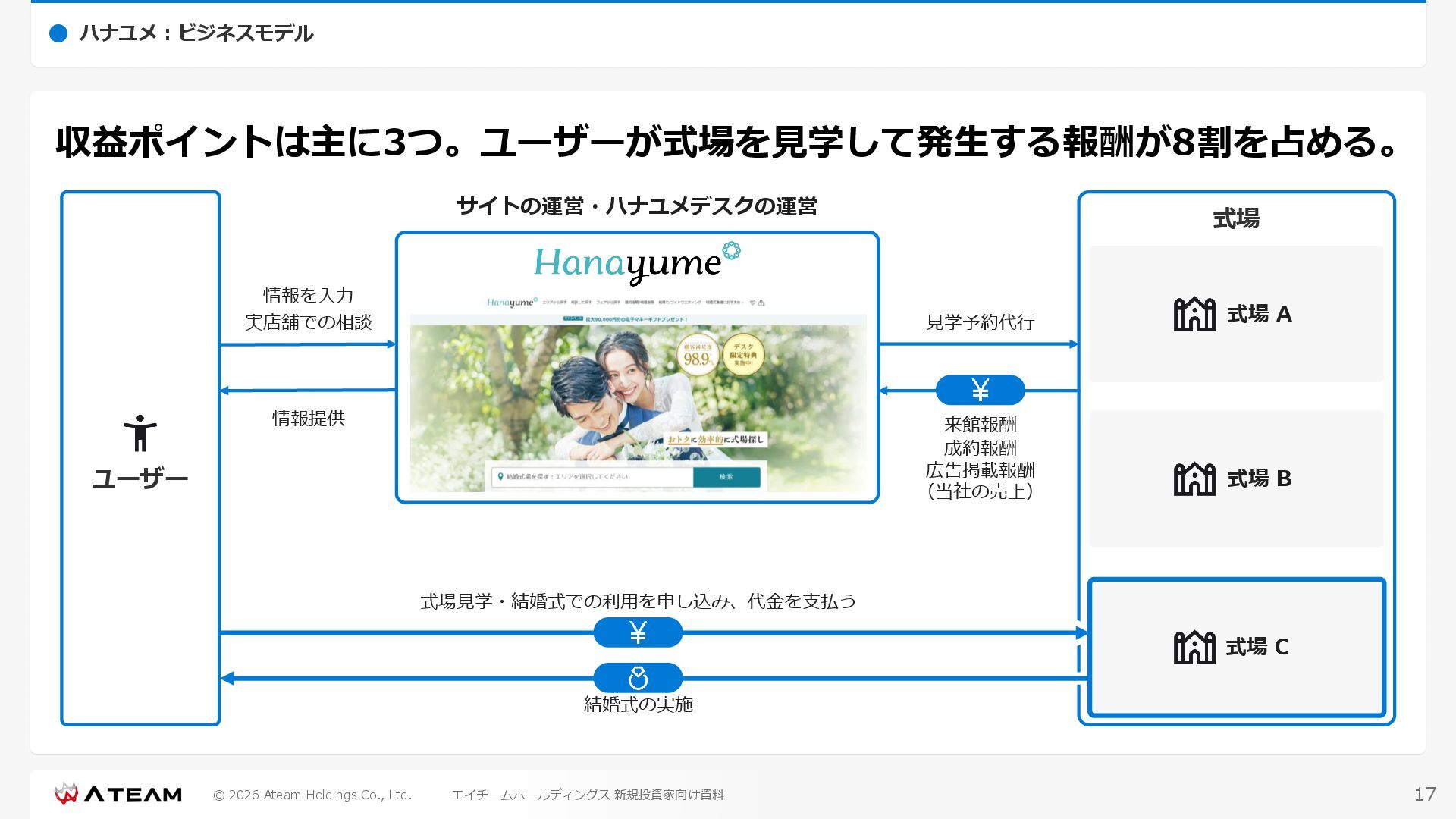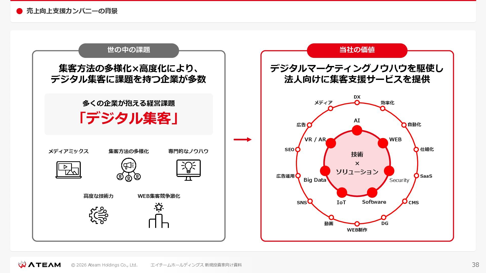 FY2022 FY2023 FY2024 FY2025 売上高 37,674 37,151 31,739 31,252 31,790 27,552 23,917 23,917 Y/Y 増減率(%) +8.9 -1.4 -14.6 -1.5 +1.7 -13.3 -13.2 -0.0 デジタルマーケティング 21,506 24,573 23,289 23,980 25,474 22,131 19,516 19,718 エンターテインメント 16,168 12,577 8,450 7,272 6,316 5,421 4,400 4,199 売上原価 6,960 7,518 7,654 8,193 8,463 5,062 3,546 3,395 原価率(%) 18.5 20.2 24.1 26.2 26.6 18.4 14.8 14.2 販売管理費 26,012 26,820 22,811 22,357 23,625 21,945 19,808 19,676 販売管理費率(%) 69.0 72.2 71.9 71.5 74.3 79.7 82.8 82.3 費用総額(売上原価+販売管理費) 32,973 34,339 30,465 30,550 32,089 27,008 23,355 23,071 人件費・採用費 4,754 6,032 6,274 6,273 5,949 5,594 5,000 4,999 広告宣伝費 14,805 15,048 12,444 12,380 13,998 13,136 12,539 11,822 広告宣伝費率(%) 39.3 40.5 39.2 39.6 44.0 47.7 52.4 49.4 デジタルマーケティング 10,715 12,452 11,648 11,813 12,711 12,778 12,347 11,533 エンターテインメント 3,785 2,355 706 494 1,219 302 181 281 支払手数料等 6,117 5,387 4,662 5,180 4,719 3,392 2,869 2,587 外注・サーバー費 2,277 2,574 2,115 2,058 2,029 1,243 1,029 818 オフィス賃料 1,080 1,179 1,142 1,129 1,011 891 688 640 その他(費用総額-上記費用) 3,937 4,116 3,825 3,528 4,380 2,750 1,227 2,203 EBITDA 5,199 3,562 1,847 1,149 122 1,115 711 1,273 調整後EBITDA 5,206 3,562 1,847 1,170 122 1,115 740 1,719 営業利益 4,701 2,811 1,273 701 -298 543 562 845 Y/Y 増減率(%) +15.3 -40.2 -54.7 -44.9 ー ー +3.4 +50.3 デジタルマーケティング 2,864 2,927 1,853 1,535 1,533 1,329 1,248 1,334 エンターテインメント 3,587 1,532 776 369 -894 166 -38 518 共通部門 -1,751 -1,648 -1,356 -1,203 -937 -951 -647 -1,008 営業利益率(%) 12.5 7.6 4.0 2.2 ー 2.0 2.4 3.5 経常利益 4,730 2,809 1,249 895 -219 711 609 1,585 税引前当期純利益 4,732 2,354 0 1,511 -734 432 1,152 1,875 親会社株主に帰属する当期純利益 3,306 1,473 -519 877 -1,337 143 953 1,036 人員数 944 1,118 1,177 1,162 1,082 910 861 830 デジタルマーケティング 544 635 703 682 629 485 442 430 エンターテインメント 312 381 382 373 351 337 324 300 共通部門 88 102 92 107 102 88 95 100 P/L(FY2017 - FY2025 通期) (百万円) 63 FY2025のセグメント区分変更後のPLで記載しております。 エイチームホールディングス 新規投資家向け資料