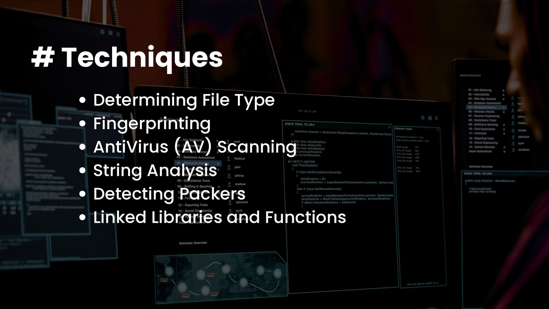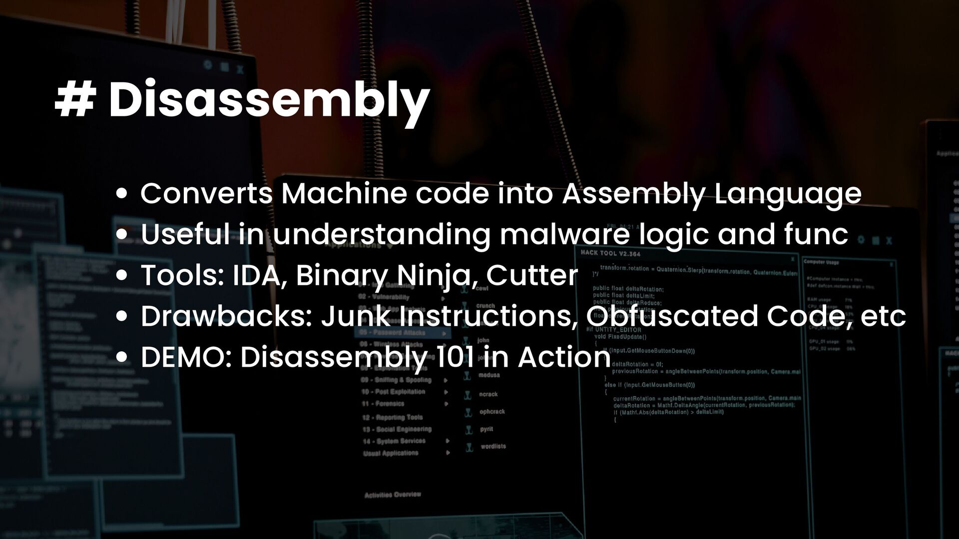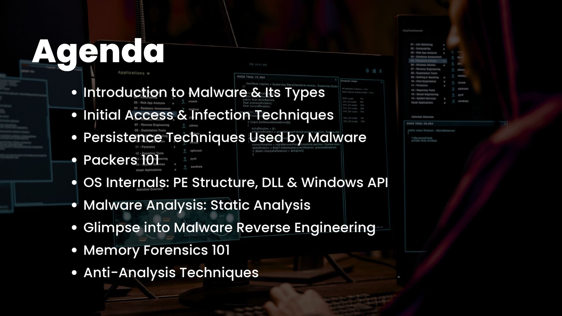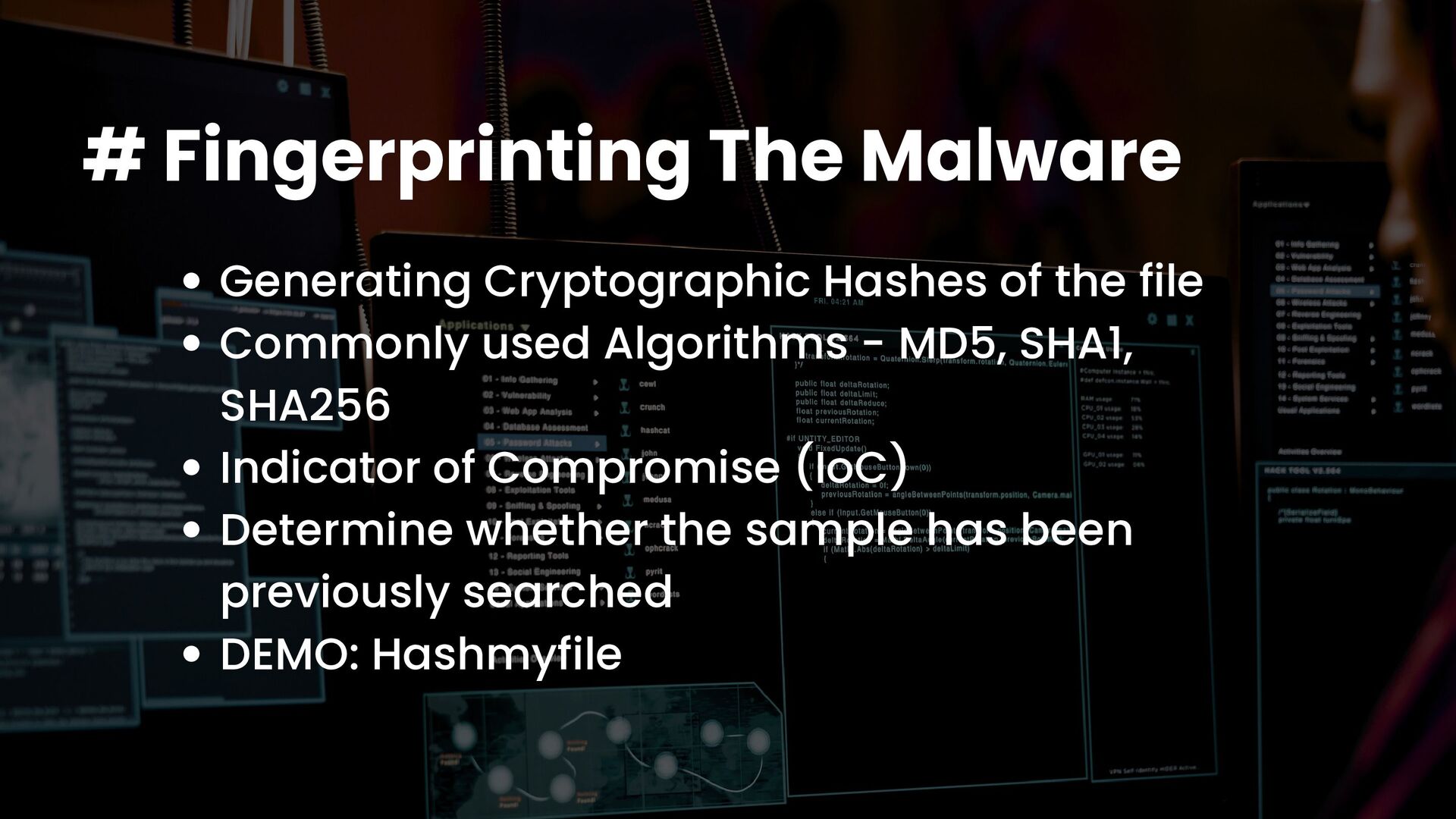 A talk on Malware Analysis covering areas like -