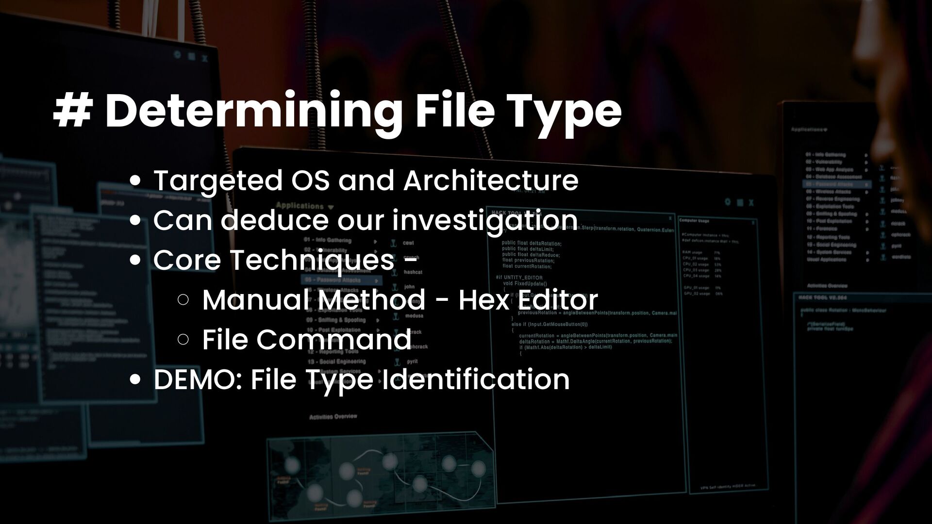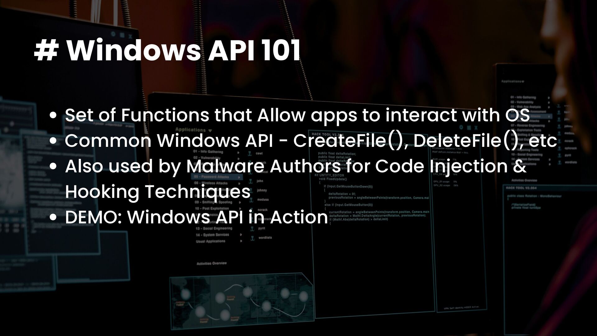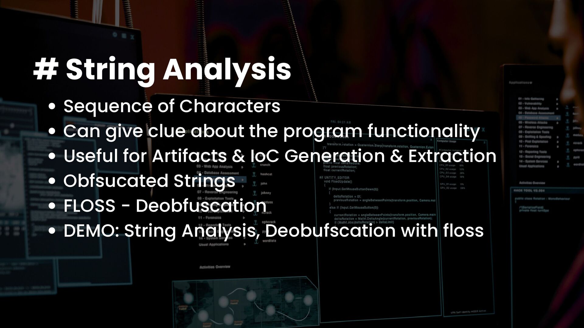 A talk on Malware Analysis covering areas like -