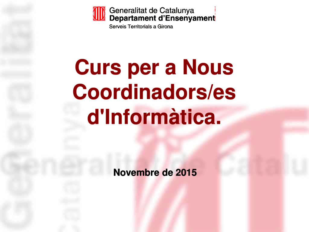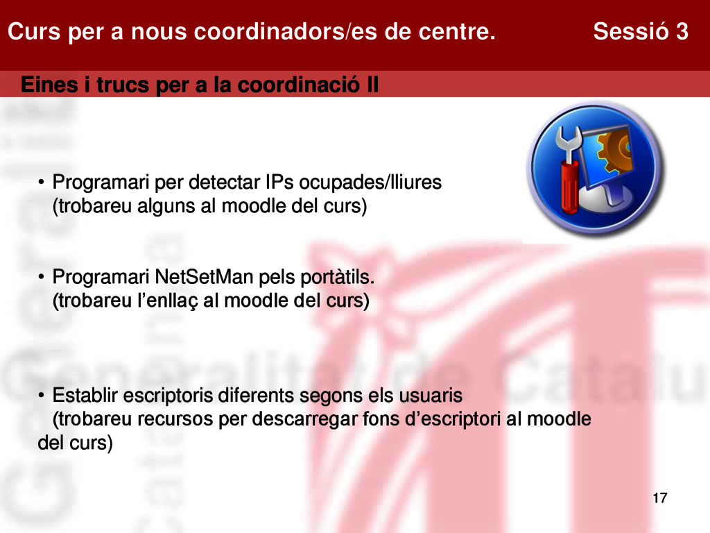 moodle del curs) • Programari NetSetMan pels portàtils. (trobareu l’enllaç al moodle del curs) • Establir escriptoris diferents segons els usuaris (trobareu recursos per descarregar fons d’escriptori al moodle del curs) Curs per a nous coordinadors/es de centre. Sessió 3 Eines i trucs per a la coordinació II