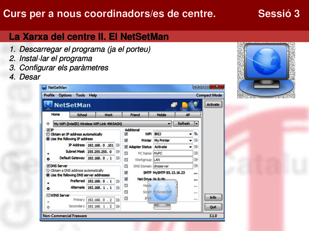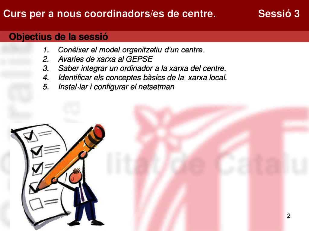 de xarxa al GEPSE 3. Saber integrar un ordinador a la xarxa del centre. 4. Identificar els conceptes bàsics de la xarxa local. 5. Instal·lar i configurar el netsetman Curs per a nous coordinadors/es de centre. Sessió 3 Objectius de la sessió