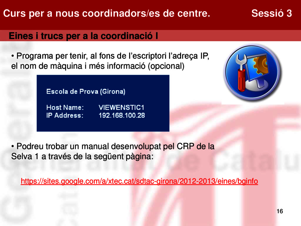 Eines i trucs per a la coordinació I • Programa per tenir, al fons de l’escriptori l’adreça IP, el nom de màquina i més informació (opcional) • Podreu trobar un manual desenvolupat pel CRP de la Selva 1 a través de la següent pàgina: https://sites.google.com/a/xtec.cat/sdtac-girona/2012-2013/eines/bginfo