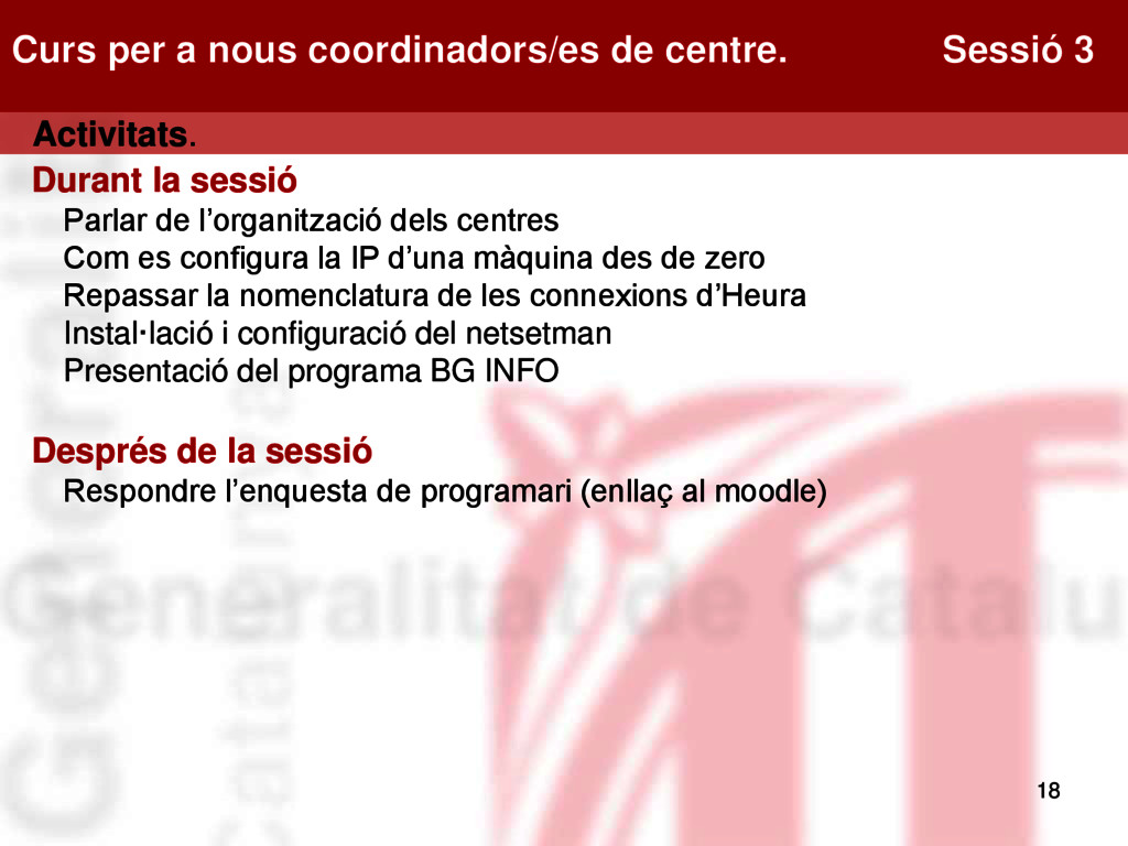 IP d’una màquina des de zero Repassar la nomenclatura de les connexions d’Heura Instal·lació i configuració del netsetman Presentació del programa BG INFO Activitats. Curs per a nous coordinadors/es de centre. Sessió 3 Durant la sessió Respondre l’enquesta de programari (enllaç al moodle) Després de la sessió