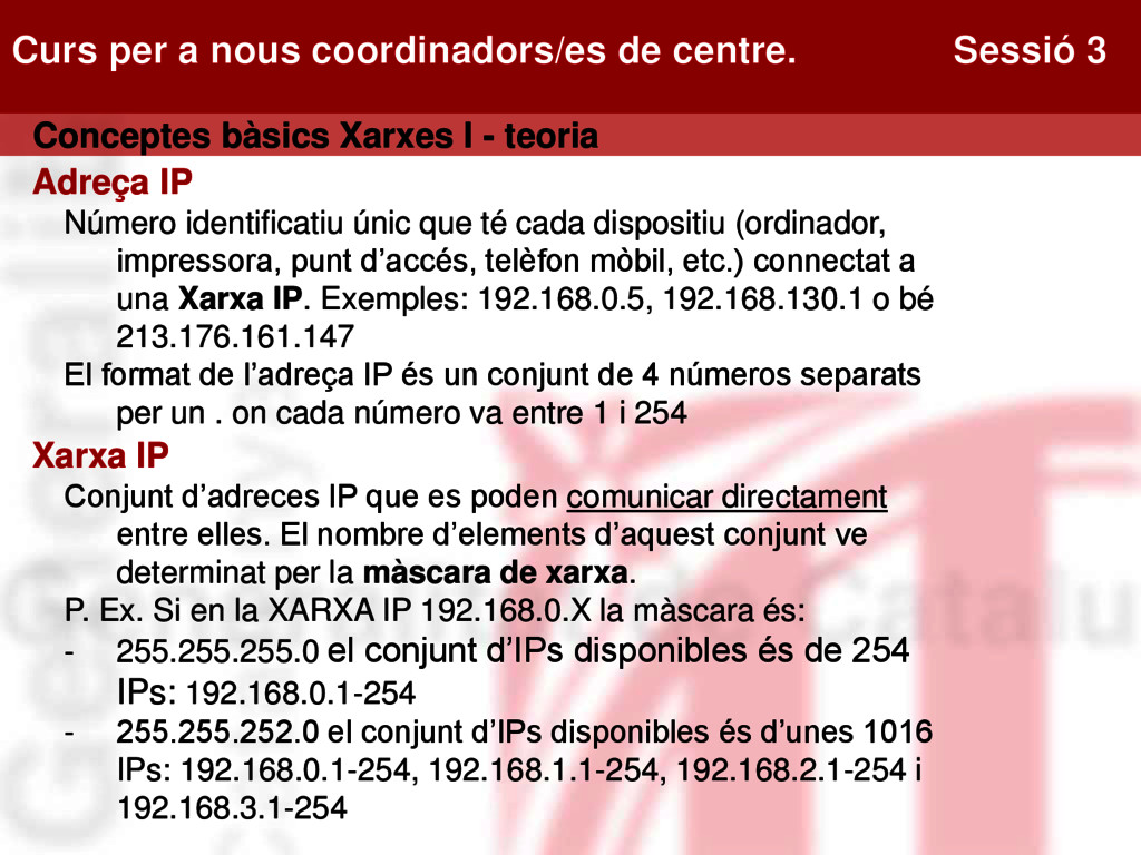 coordinadors/es de centre. Sessió 3 Número identificatiu únic que té cada dispositiu (ordinador, impressora, punt d’accés, telèfon mòbil, etc.) connectat a una Xarxa IP. Exemples: 192.168.0.5, 192.168.130.1 o bé 213.176.161.147 El format de l’adreça IP és un conjunt de 4 números separats per un . on cada número va entre 1 i 254 Adreça IP Conjunt d’adreces IP que es poden comunicar directament entre elles. El nombre d’elements d’aquest conjunt ve determinat per la màscara de xarxa. P. Ex. Si en la XARXA IP 192.168.0.X la màscara és: - 255.255.255.0 el conjunt d’IPs disponibles és de 254 IPs: 192.168.0.1-254 - 255.255.252.0 el conjunt d’IPs disponibles és d’unes 1016 IPs: 192.168.0.1-254, 192.168.1.1-254, 192.168.2.1-254 i 192.168.3.1-254 Xarxa IP