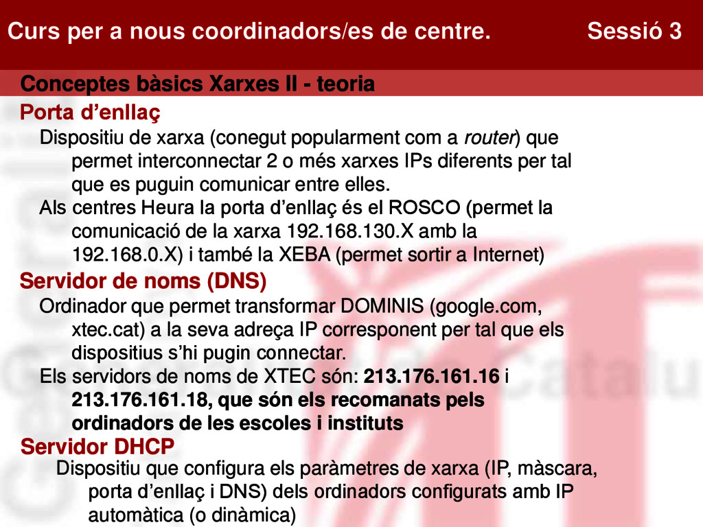 coordinadors/es de centre. Sessió 3 Dispositiu de xarxa (conegut popularment com a router) que permet interconnectar 2 o més xarxes IPs diferents per tal que es puguin comunicar entre elles. Als centres Heura la porta d’enllaç és el ROSCO (permet la comunicació de la xarxa 192.168.130.X amb la 192.168.0.X) i també la XEBA (permet sortir a Internet) Porta d’enllaç Ordinador que permet transformar DOMINIS (google.com, xtec.cat) a la seva adreça IP corresponent per tal que els dispositius s’hi pugin connectar. Els servidors de noms de XTEC són: 213.176.161.16 i 213.176.161.18, que són els recomanats pels ordinadors de les escoles i instituts Servidor de noms (DNS) Servidor DHCP Dispositiu que configura els paràmetres de xarxa (IP, màscara, porta d’enllaç i DNS) dels ordinadors configurats amb IP automàtica (o dinàmica)