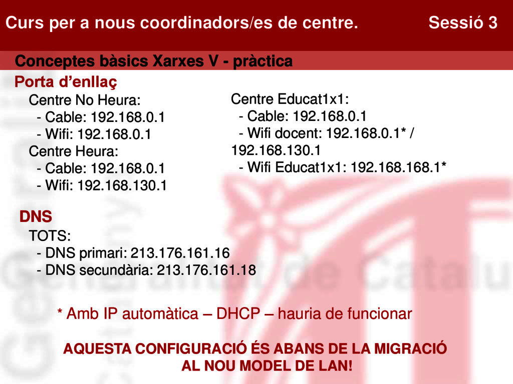 coordinadors/es de centre. Sessió 3 Centre No Heura: - Cable: 192.168.0.1 - Wifi: 192.168.0.1 Centre Heura: - Cable: 192.168.0.1 - Wifi: 192.168.130.1 Porta d’enllaç * Amb IP automàtica – DHCP – hauria de funcionar DNS TOTS: - DNS primari: 213.176.161.16 - DNS secundària: 213.176.161.18 Centre Educat1x1: - Cable: 192.168.0.1 - Wifi docent: 192.168.0.1* / 192.168.130.1 - Wifi Educat1x1: 192.168.168.1* AQUESTA CONFIGURACIÓ ÉS ABANS DE LA MIGRACIÓ AL NOU MODEL DE LAN!