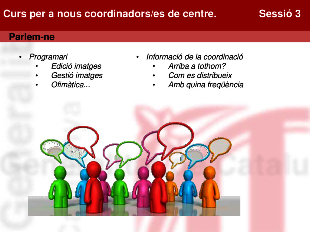Curs per a nous coordinadors/es de centre. Sessió 3 Parlem-ne • Informació de la coordinació • Arriba a tothom? • Com es distribueix • Amb quina freqüència