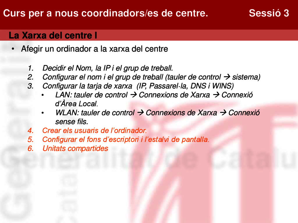Decidir el Nom, la IP i el grup de treball. 2. Configurar el nom i el grup de treball (tauler de control sistema) 3. Configurar la tarja de xarxa (IP, Passarel·la, DNS i WINS) • LAN: tauler de control Connexions de Xarxa Connexió d’Àrea Local. • WLAN: tauler de control Connexions de Xarxa Connexió sense fils. 4. Crear els usuaris de l’ordinador. 5. Configurar el fons d’escriptori i l’estalvi de pantalla. 6. Unitats compartides Curs per a nous coordinadors/es de centre. Sessió 3 La Xarxa del centre I