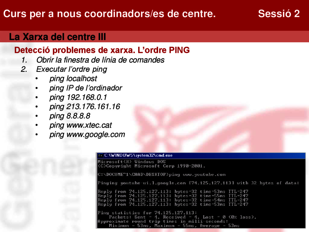 de línia de comandes 2. Executar l’ordre ping • ping localhost • ping IP de l’ordinador • ping 192.168.0.1 • ping 213.176.161.16 • ping 8.8.8.8 • ping www.xtec.cat • ping www.google.com Curs per a nous coordinadors/es de centre. Sessió 2 La Xarxa del centre III