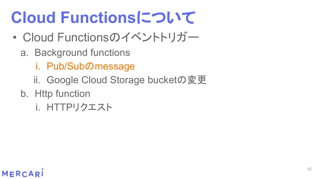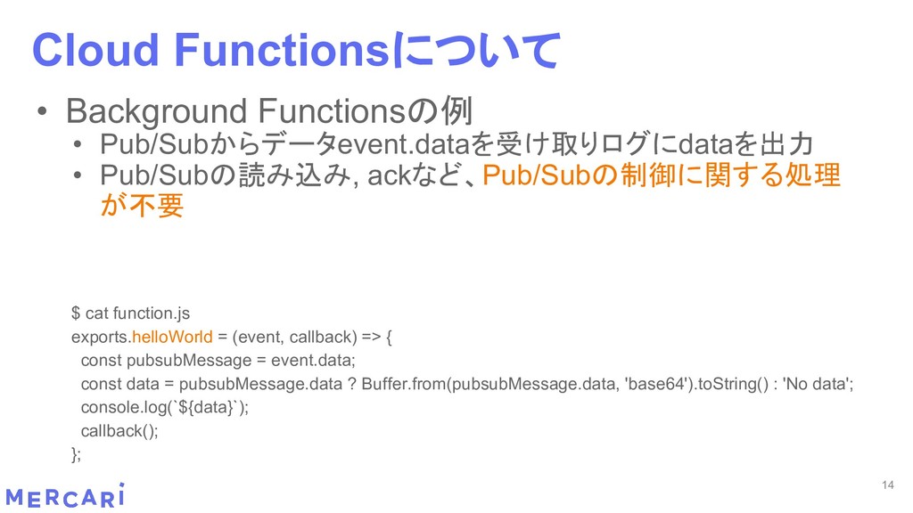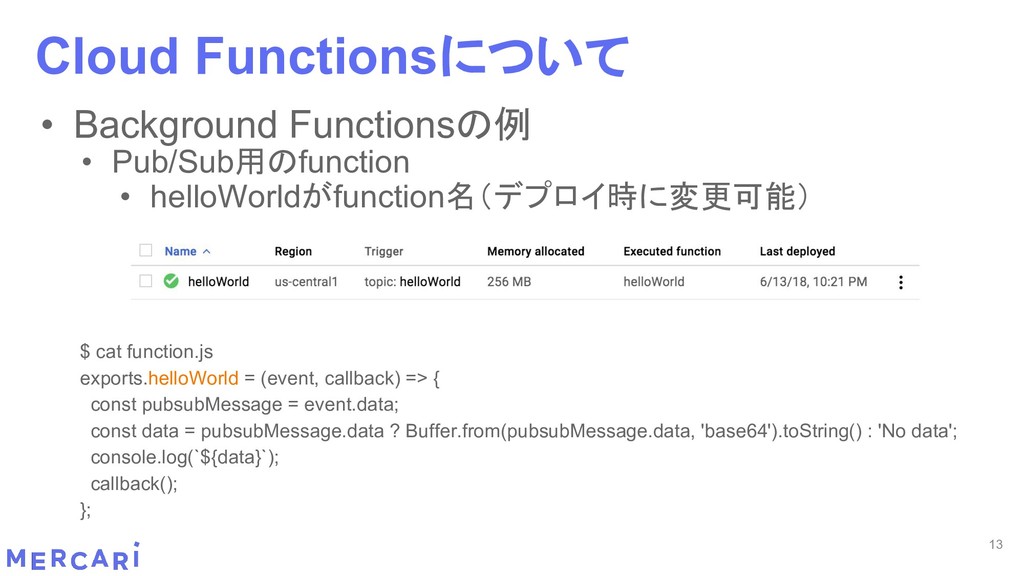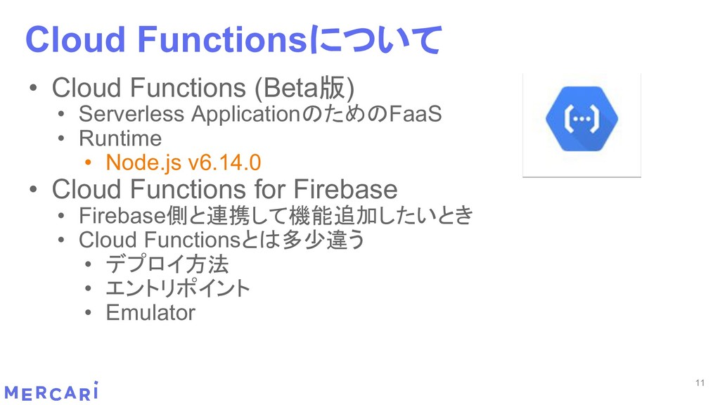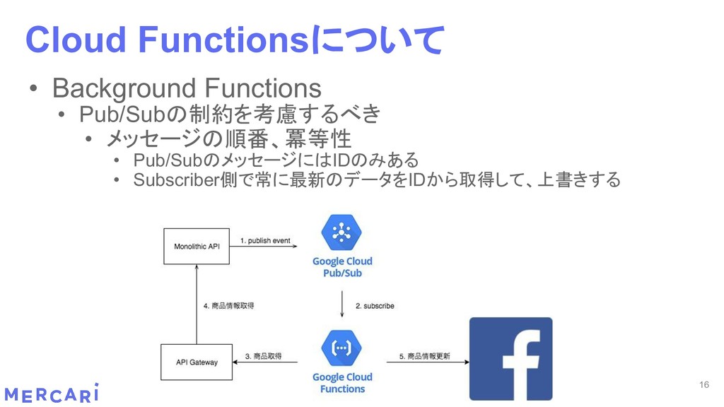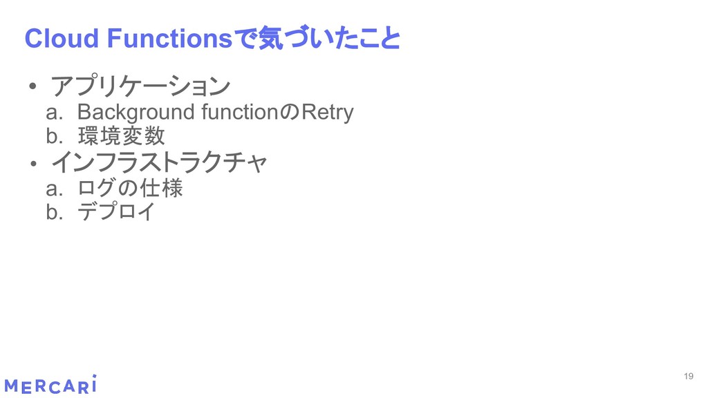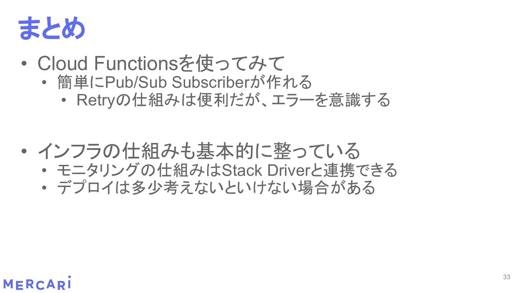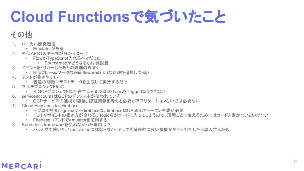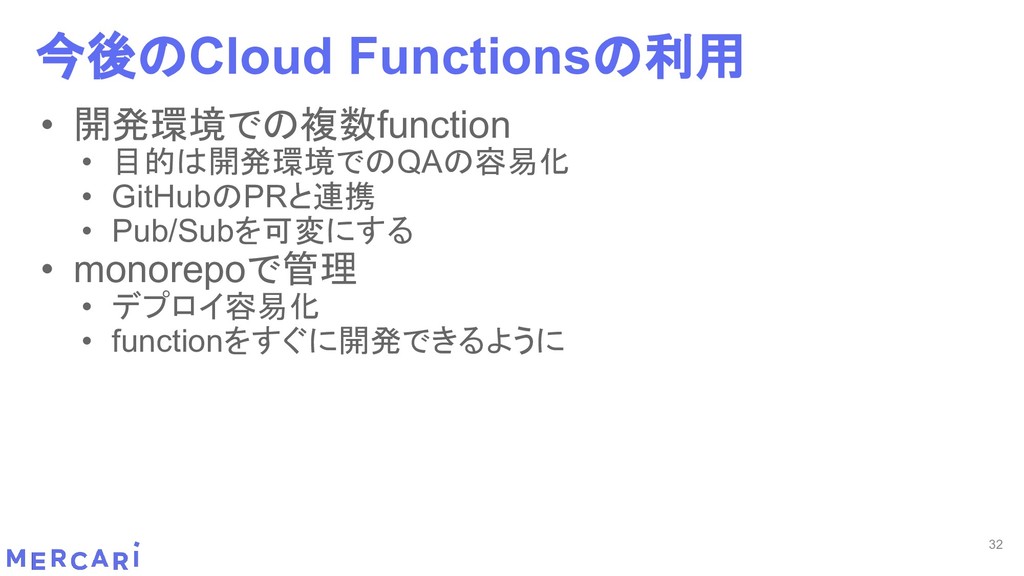 Sourcemapがどうなるかは要調査 3. イベントをトリガーしたあとの処理のみ書く • HttpフレームワークのMiddlewareのような処理を追加しづらい 4. テストが書きやすい • 普通の関数にテストデータを生成して実行するだけ 5. マルチプロジェクト対応 • 別GCPプロジェクトに存在する Pub/SubのTopicをTriggerにはできない 6. serviceaccountsはGCPのデフォルトが使われている • GCPサービスの連携が容易。認証情報を考える必要がアプリケーションないでは必要ない 7. Cloud Functions for Firebase • デプロイ方法がgcloudからfirebaseに。firebaseはOAuthしてトークン生成が必要 • エントリポイントの書き方が変わる。 topic名がコードに入ってしまうので、環境ごとに変えるためにはコードを書かないといけない • Firebaseコマンドでemulatorを使用する 8. Serverless frameworkを使わなかった理由は? • パッと見て使いたいmotivationにはならなかった。でも将来的に良い機能があると判断したら導入するかも 31 Cloud Functionsで気づいたこと