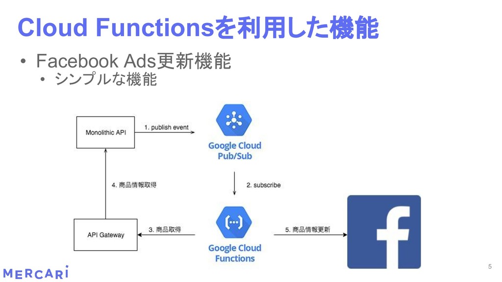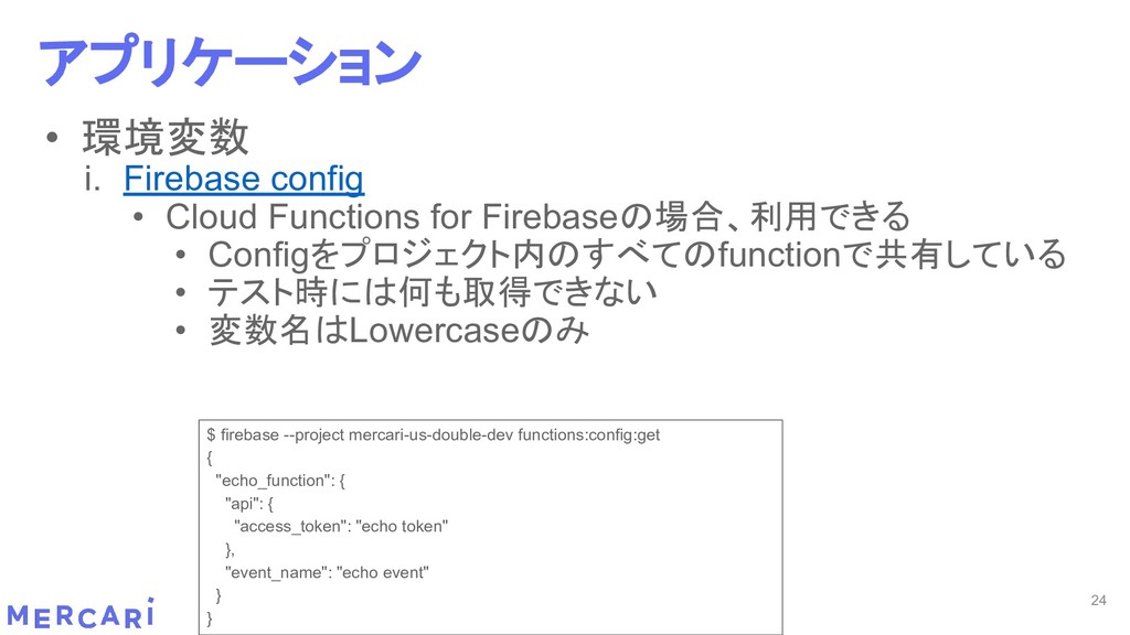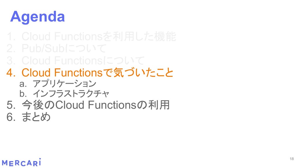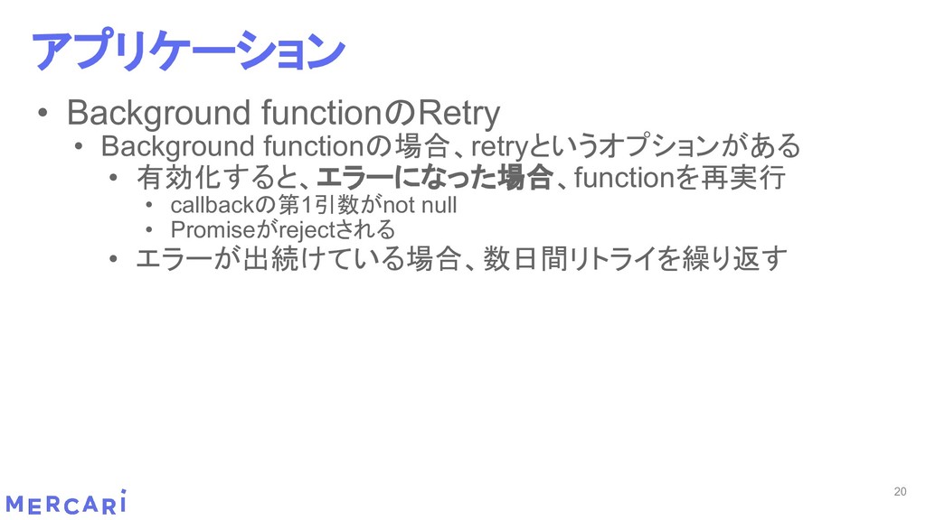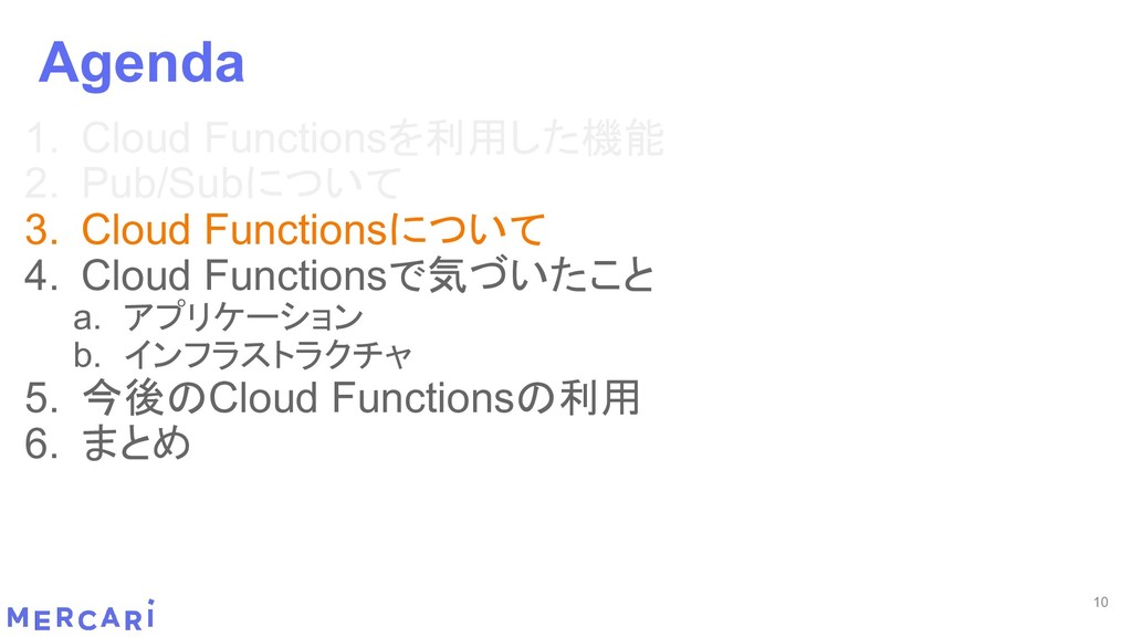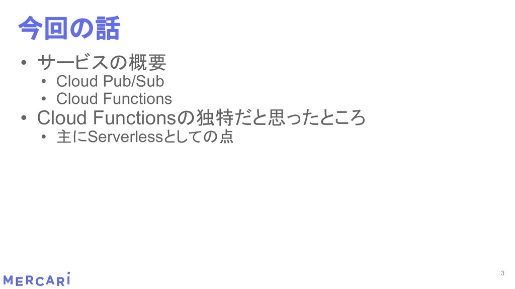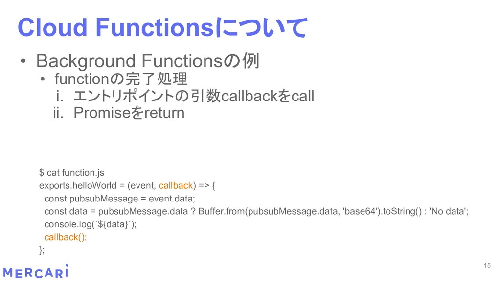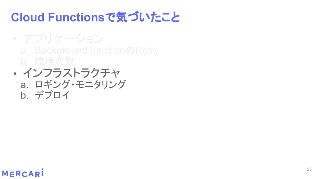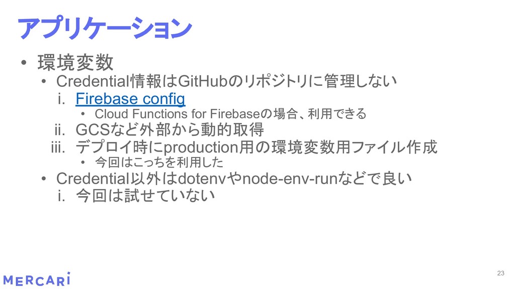 Sourcemapがどうなるかは要調査 3. イベントをトリガーしたあとの処理のみ書く • HttpフレームワークのMiddlewareのような処理を追加しづらい 4. テストが書きやすい • 普通の関数にテストデータを生成して実行するだけ 5. マルチプロジェクト対応 • 別GCPプロジェクトに存在する Pub/SubのTopicをTriggerにはできない 6. serviceaccountsはGCPのデフォルトが使われている • GCPサービスの連携が容易。認証情報を考える必要がアプリケーションないでは必要ない 7. Cloud Functions for Firebase • デプロイ方法がgcloudからfirebaseに。firebaseはOAuthしてトークン生成が必要 • エントリポイントの書き方が変わる。 topic名がコードに入ってしまうので、環境ごとに変えるためにはコードを書かないといけない • Firebaseコマンドでemulatorを使用する 8. Serverless frameworkを使わなかった理由は? • パッと見て使いたいmotivationにはならなかった。でも将来的に良い機能があると判断したら導入するかも 31 Cloud Functionsで気づいたこと