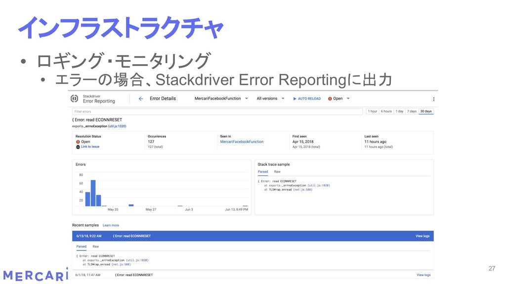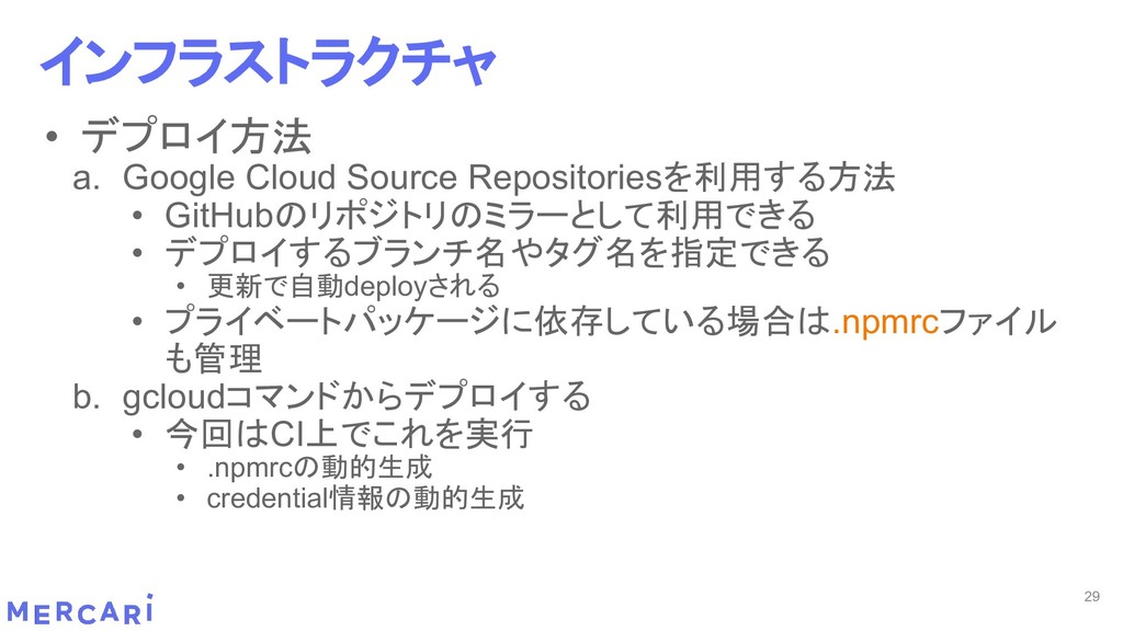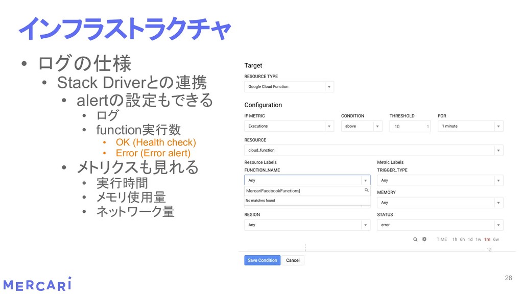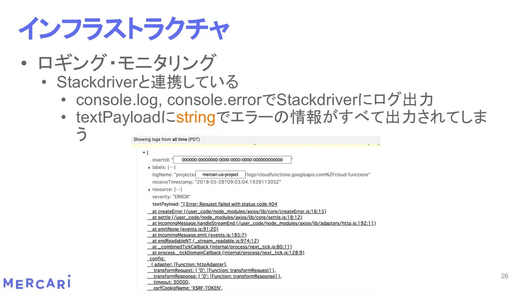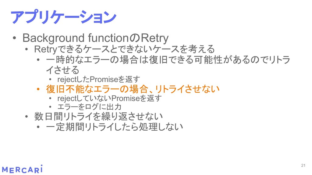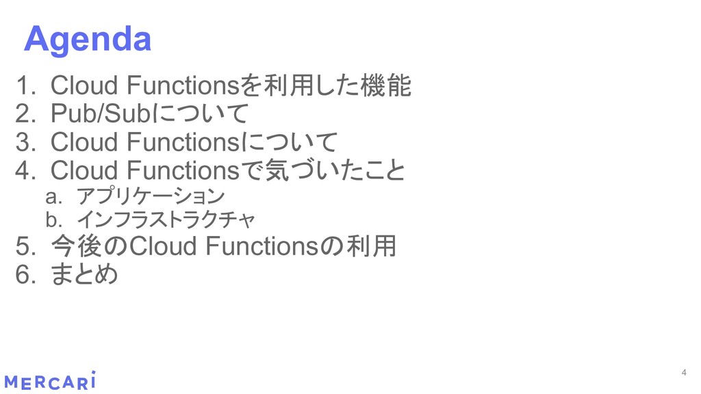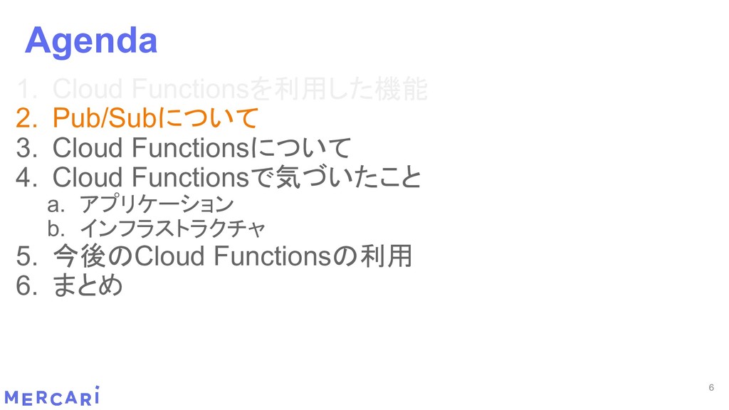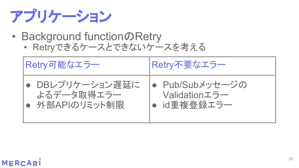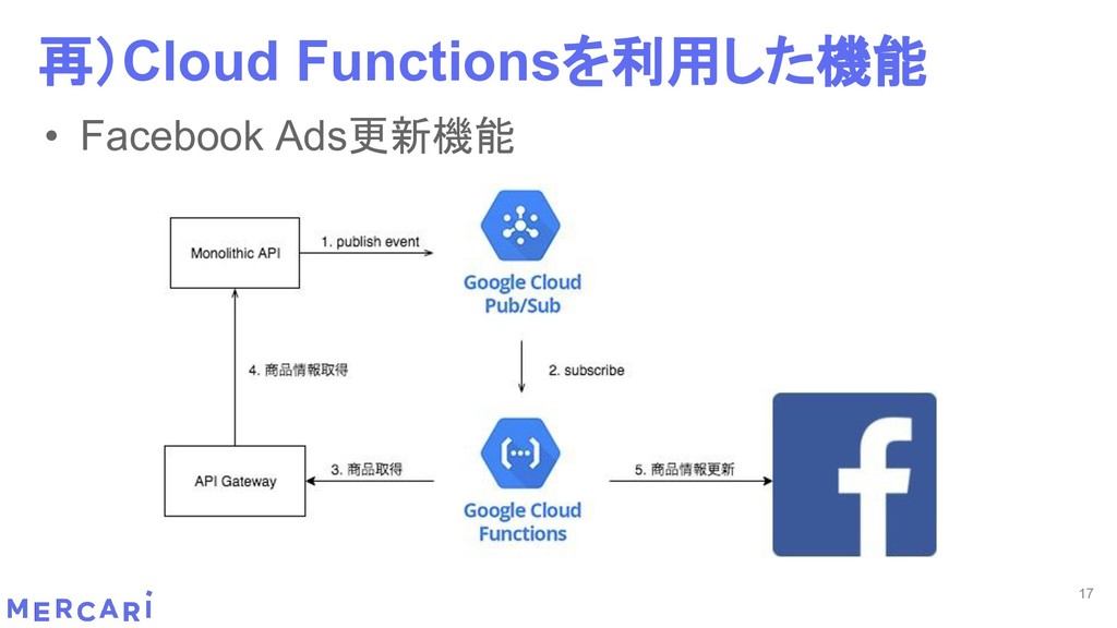 Sourcemapがどうなるかは要調査 3. イベントをトリガーしたあとの処理のみ書く • HttpフレームワークのMiddlewareのような処理を追加しづらい 4. テストが書きやすい • 普通の関数にテストデータを生成して実行するだけ 5. マルチプロジェクト対応 • 別GCPプロジェクトに存在する Pub/SubのTopicをTriggerにはできない 6. serviceaccountsはGCPのデフォルトが使われている • GCPサービスの連携が容易。認証情報を考える必要がアプリケーションないでは必要ない 7. Cloud Functions for Firebase • デプロイ方法がgcloudからfirebaseに。firebaseはOAuthしてトークン生成が必要 • エントリポイントの書き方が変わる。 topic名がコードに入ってしまうので、環境ごとに変えるためにはコードを書かないといけない • Firebaseコマンドでemulatorを使用する 8. Serverless frameworkを使わなかった理由は? • パッと見て使いたいmotivationにはならなかった。でも将来的に良い機能があると判断したら導入するかも 31 Cloud Functionsで気づいたこと