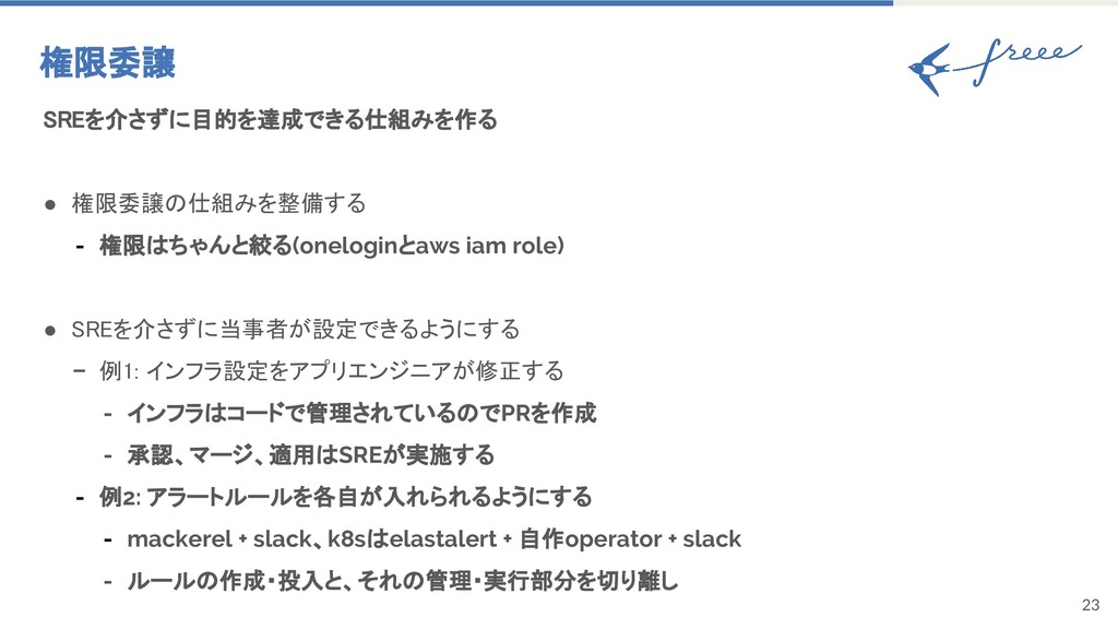 23 権限委譲 SREを介さずに目的を達成できる仕組みを作る • 権限委譲の仕組みを整備する - 権限はちゃんと絞る(oneloginとaws iam role) •