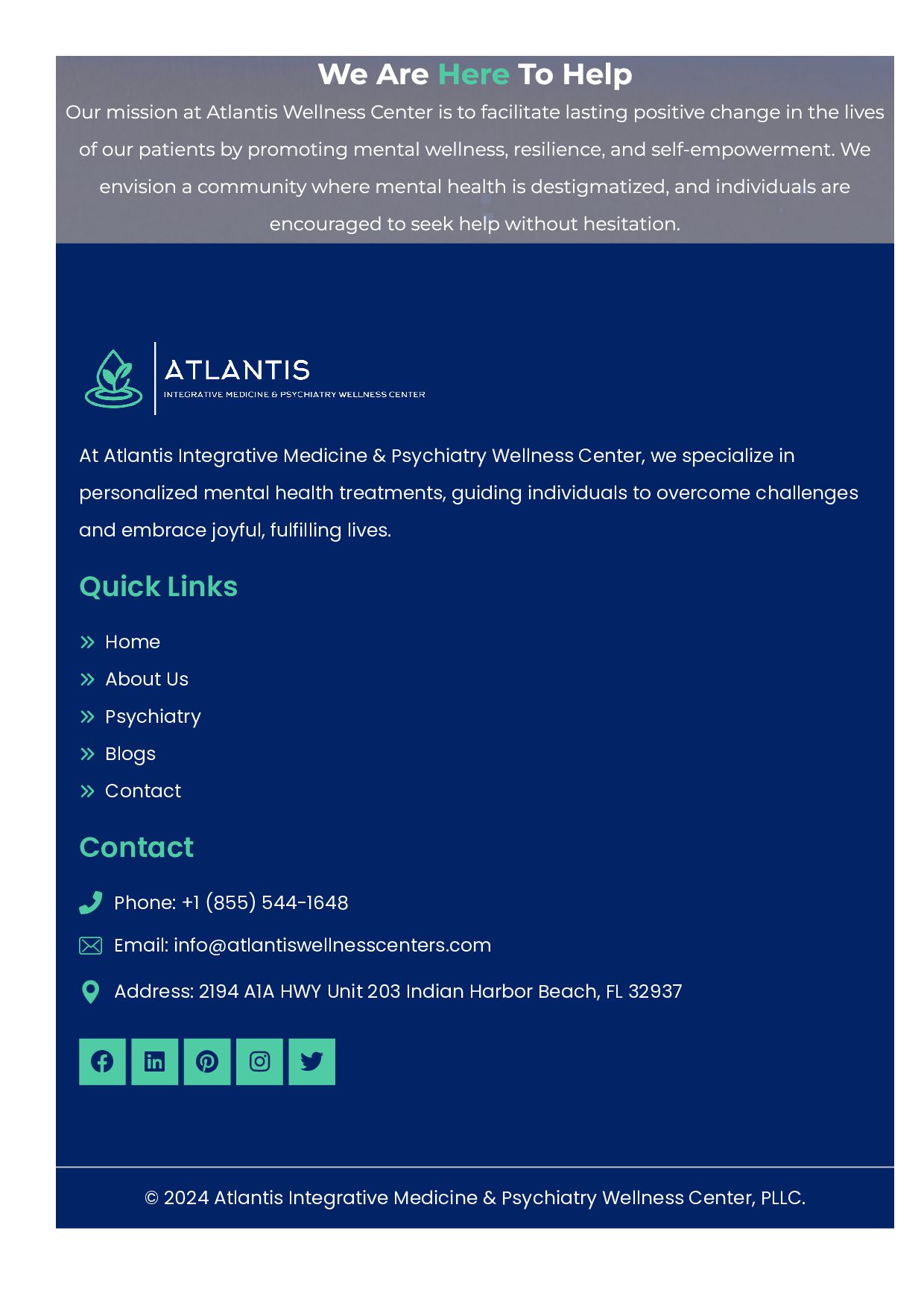 Located in Indian Harbor Beach, FL, Atlantis Wellness Center is a beacon of hope for individuals seeking mental health care and psychiatric services. Our center is a sanctuary where healing begins, and lives are transformed.
