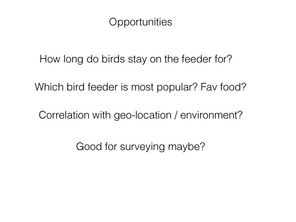 Which bird feeder is most popular? Fav food? Correlation with geo-location / environment? Good for surveying maybe?