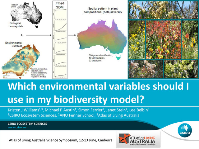 the spatial portal Climate variables • Mean conditions of evaporation, precipitation, minimum and maximum temperature, wind, humidity, solar radiation (ANUCLIM derivatives) Disturbance regimes • Fire frequency and mean climatic extremes such as average absolute monthly minimum temperature (proxies for drought, flood, frost, heat..) Soil variables • Soil depth, clay%, bulk density, hydraulic conductivity, structure, water holding capacity, calcrete, nutrient status, etc (Atlas of Australian soils..) Geoscience variables • Geological age and inherent fertility (derivatives of the 1:1M National Geology), and geophysics - gravity and magnetics Terrain variables (DEM derivatives) • Slope, aspect, elevation diversity, topographic position, wetness indices, multi-resolution indices, etc 10 |