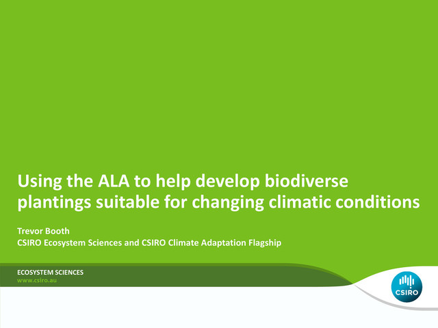 carbon, enhance biodiversity and build environmental resistance under climate change $946 million over six years Phase 1 – $271 million, 313 projects, 18 m ha, P2 $50m ‘regionally appropriate’ ‘long-term sustainability under changing..conditions’ 100 years survival No freely accessible systems to assist selection under CC Example focus here on trees, as important for C seq. Biodiversity Fund