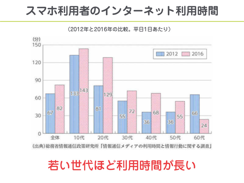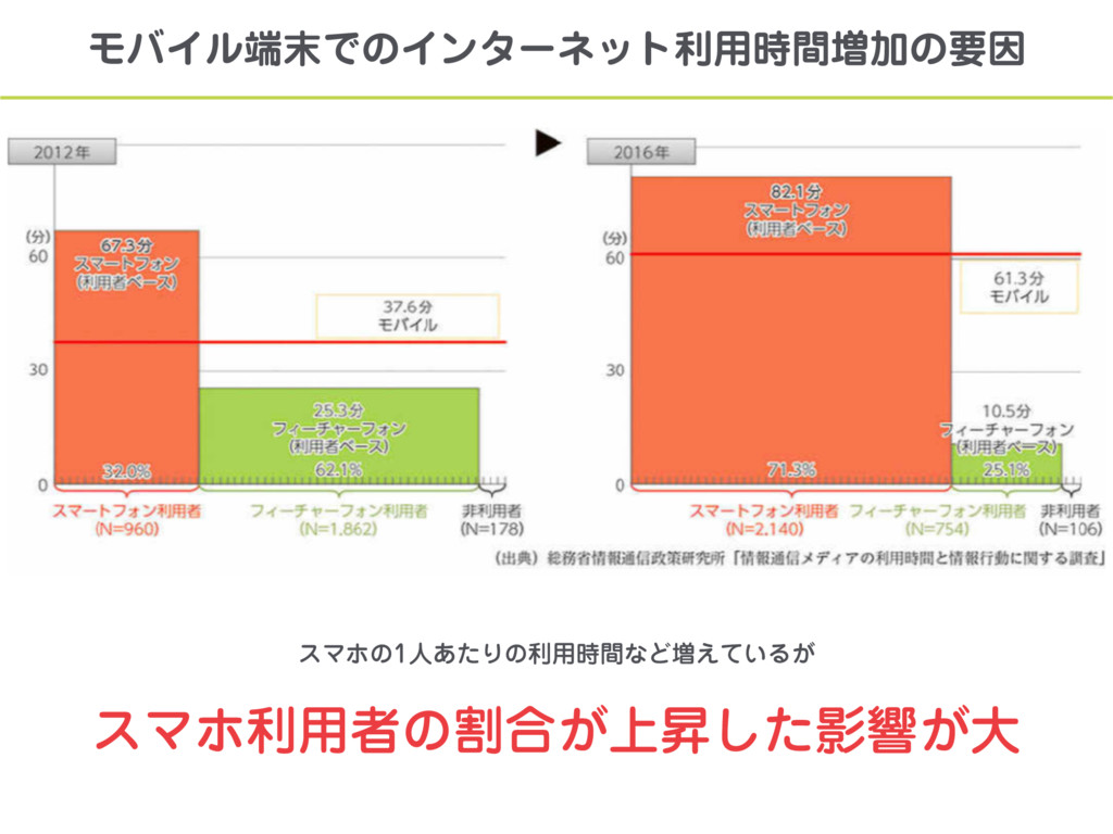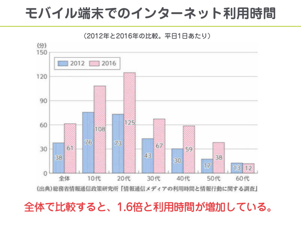 ϞόΠϧͰͷΠϯλʔωοτར༻࣌ؒ શମͰൺֱ͢Δͱɺഒͱར༻͕࣌ؒ૿Ճ͍ͯ͠Δɻ ʢͱͷൺֱɻฏ͋ͨΓʣ