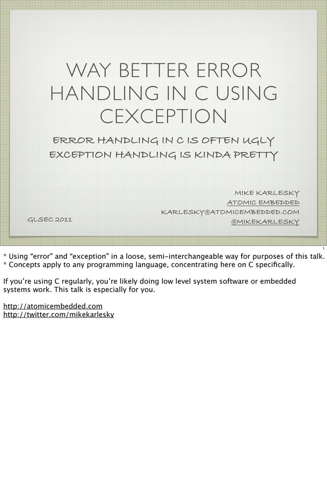 The concept of an exception cleans up and simplifies error handling beautifully. Unfortunately, the C language has no native support for exceptions. CException adds a basic exception mechanism to C projects, providing many of the benefits of exceptions as present in higher level languages.