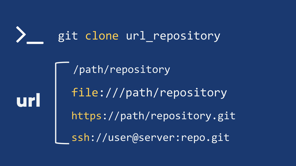 git clone url_repository file:///path/repository /path/repository https://path/repository.git ssh://user@server:repo.git